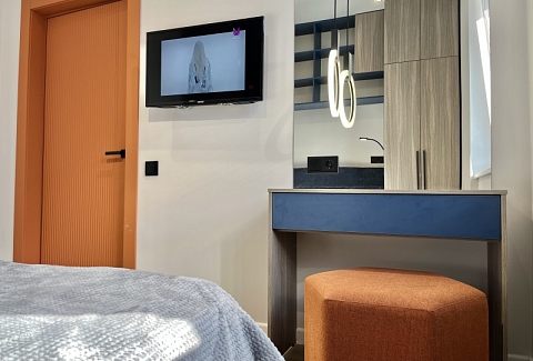 В номере: диван, кровать двуспальная, прикроватные тумбочки, стол, стулья, шкаф, гладильная доска, кондиционер, набор посуды, плита индукционная, стиральная машина, телевизор, утюг