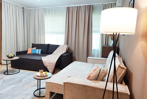 В номере: диван, кровать двуспальная, прикроватные тумбочки, стол, стулья, шкаф, гладильная доска, кондиционер, микроволновая печь, набор посуды, плита индукционная, посудомоечная машина, стиральная машина, телевизор, утюг, холодильник, чайник