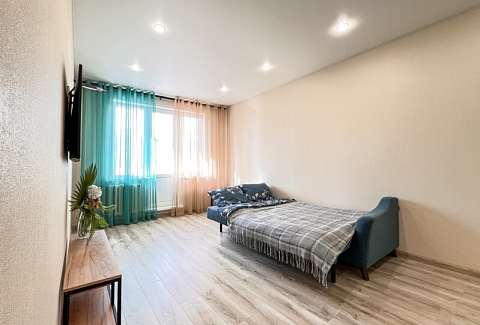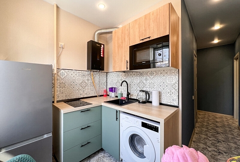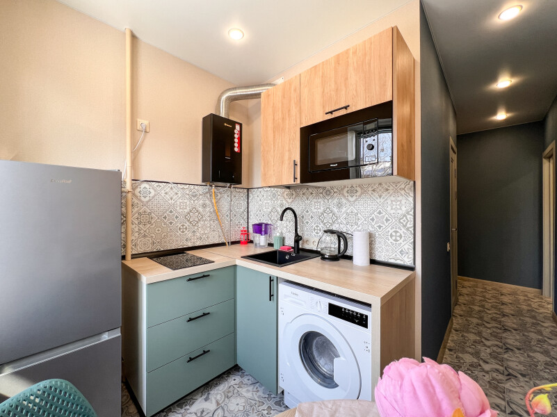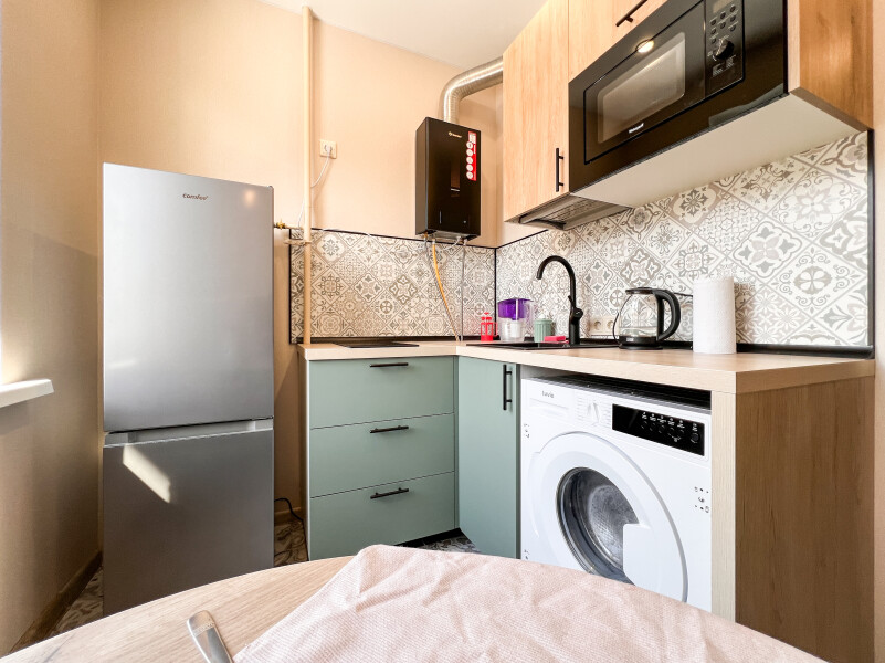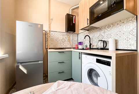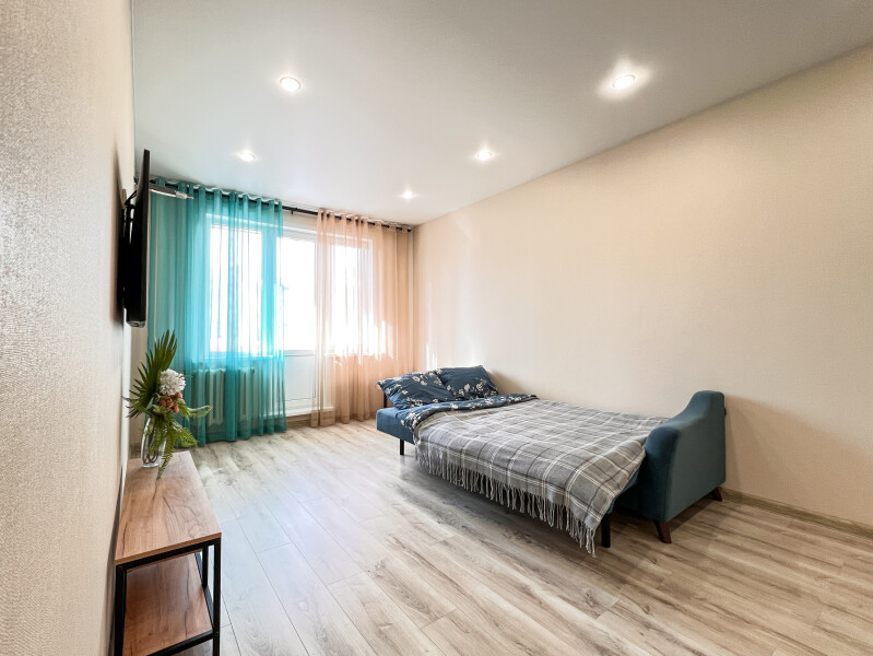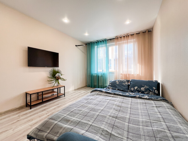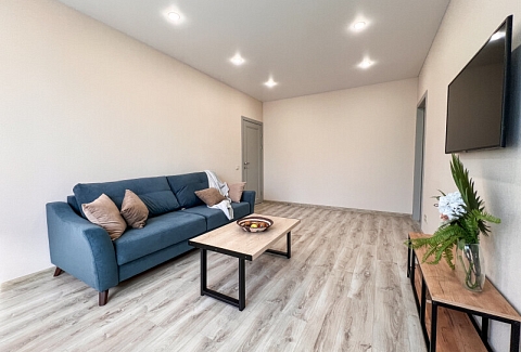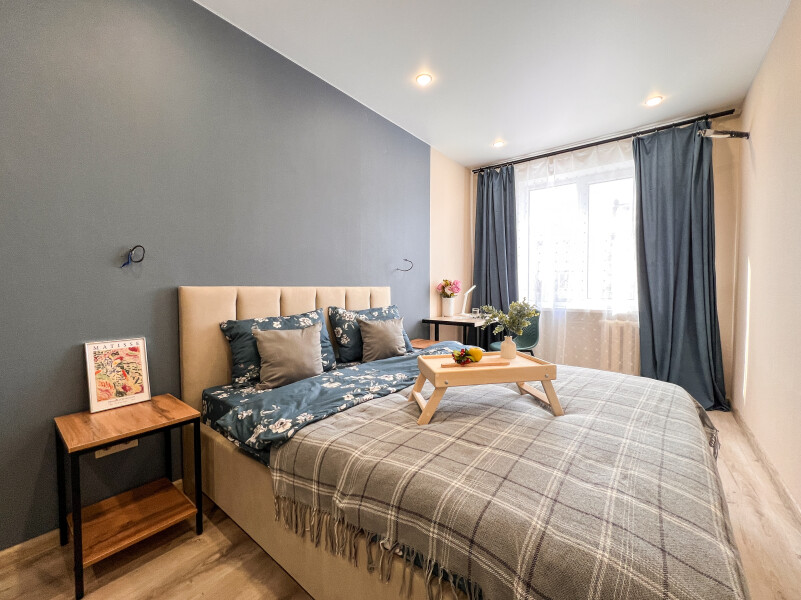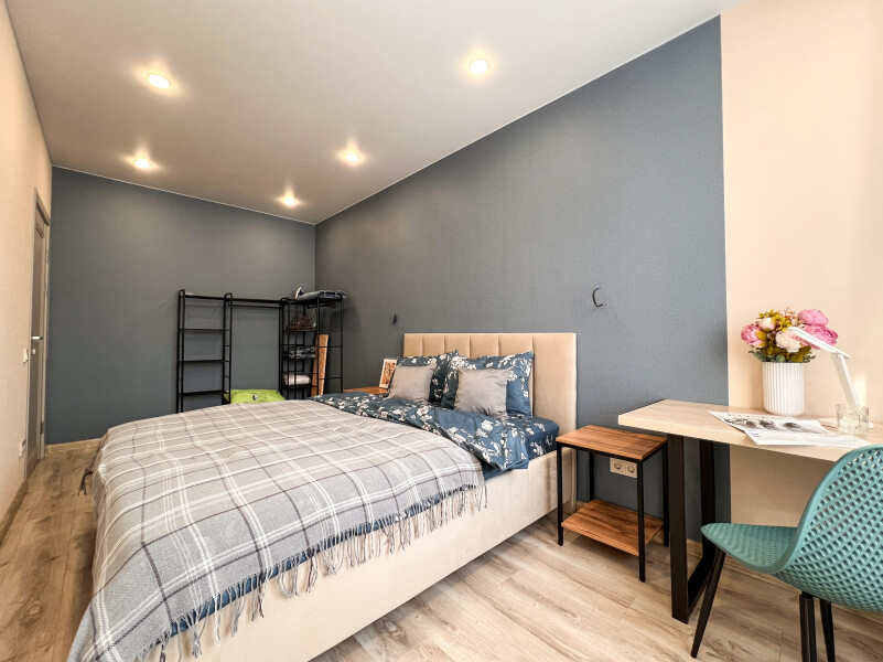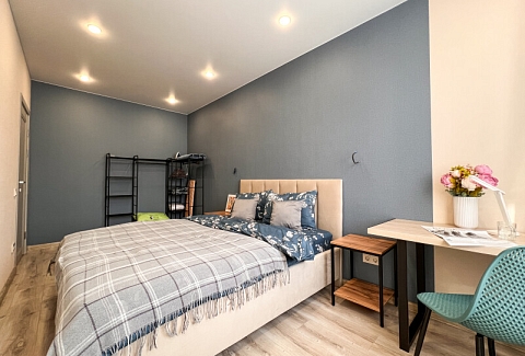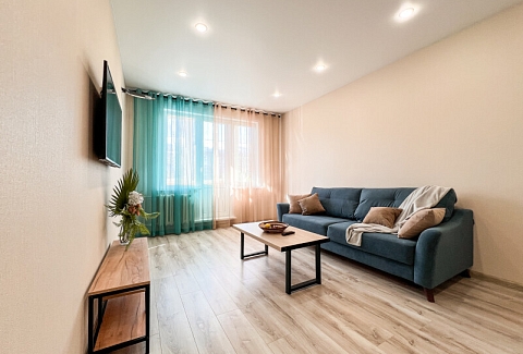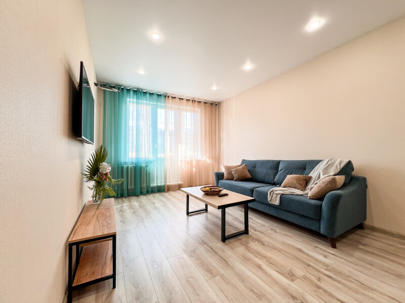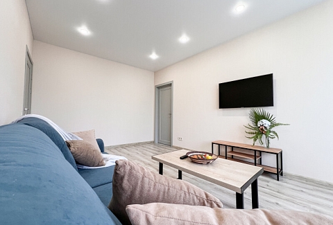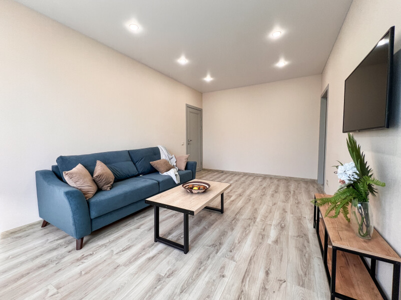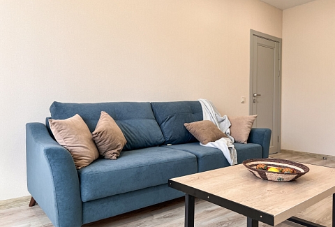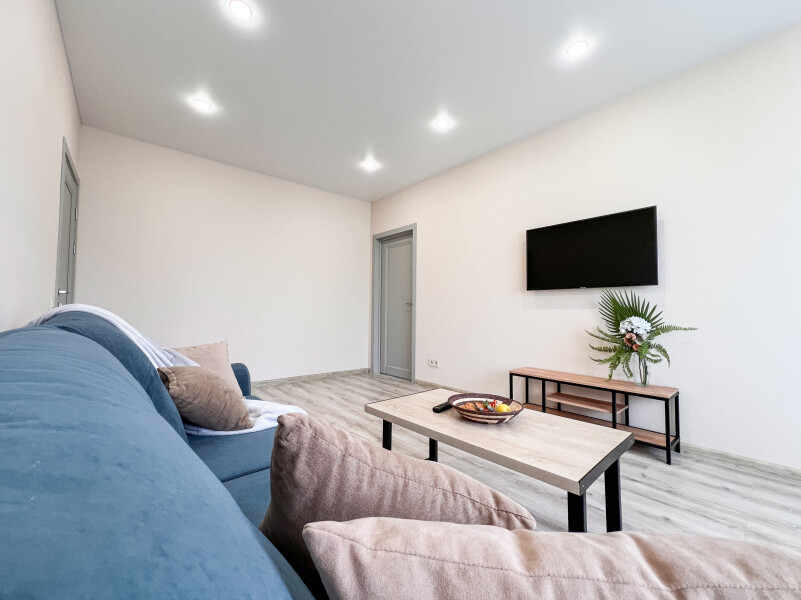 Во дворе установлено детское игровое снаряжение, предусмотрено место для парковки. Ближайшие продуктовые магазины открыты в 5 минутах ходьбы.В апартаментах оснащена изолированная спальня с двуспальной кроватью и рабочей зоной. Просторная гостиная располагает раскладным диваном, телевизором, выходом на балкон. В компактной, но функциональной кухне имеются все необходимое для приготовления еды, обеденное пространство, стиральная машина. Совмещенный санузел оборудован душевой кабиной. Гости могут подключиться к Wi-Fi.