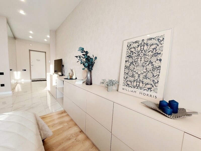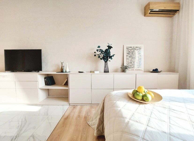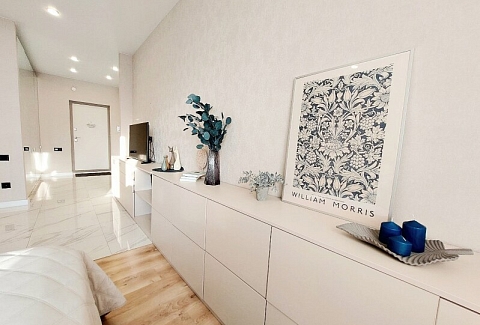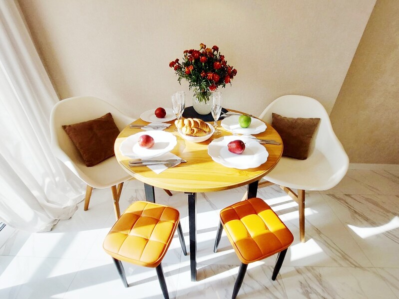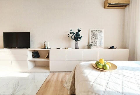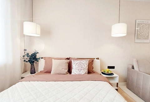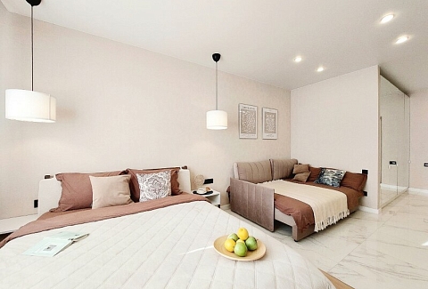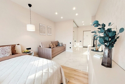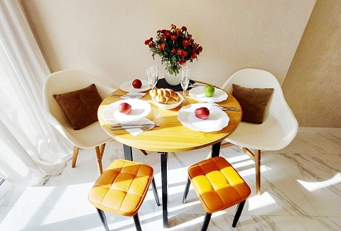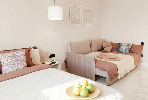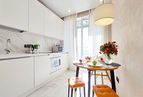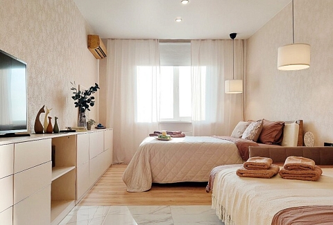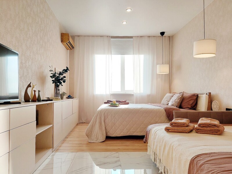 В номере: вешалка, диван раскладной, зеркало, комод, кровать двуспальная, прикроватные тумбочки, стол обеденный, стулья, шкаф, гладильная доска, духовой шкаф, кондиционер, микроволновая печь, набор посуды, плита электрическая, посудомоечная машина, стиральная машина, сушилка для белья, телевизор ЖК, утюг, холодильник, чайный набор посуды, электрочайник