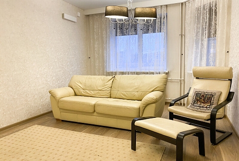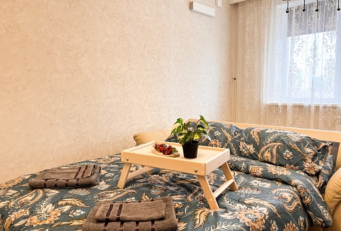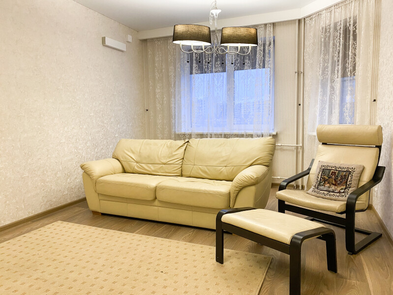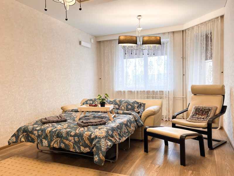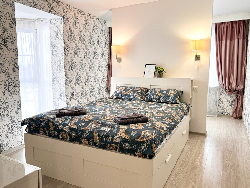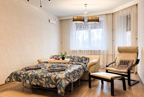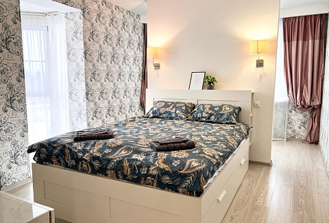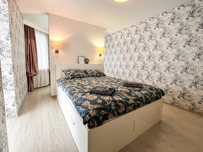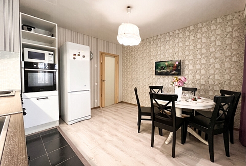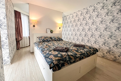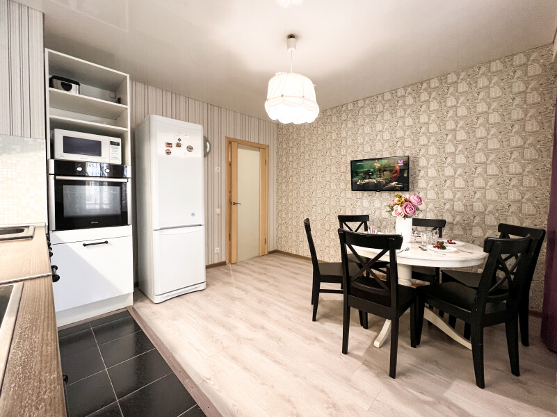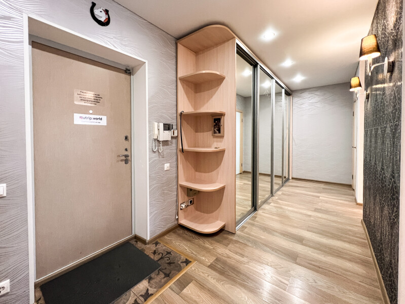 На первом этаже открыты магазины и кофейня, во дворе обустроены детские и спортивные площадки, парковки.В изолированной спальне установлена двуспальная кровать, в просторной гостиной — раскладной диван. Кухня оснащена пространством для приготовления еды, посудомоечной машиной, обеденной зоной. Прихожая располагает вместительным шкафом-купе с большими зеркалами. Совмещенный санузел укомплектован ванной и стиральной машиной. Гости могут подключиться к Wi-Fi.