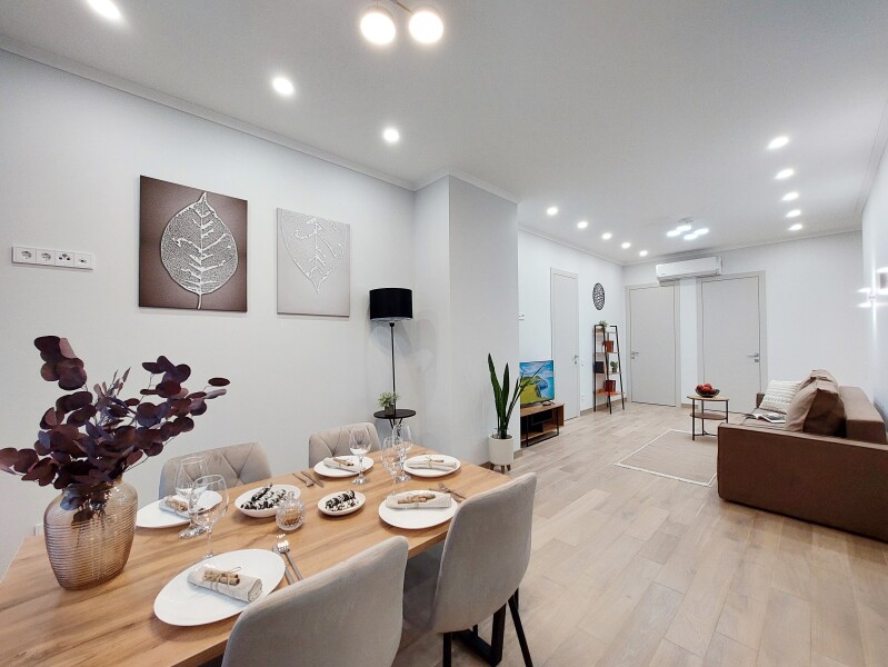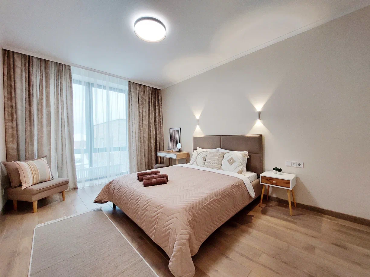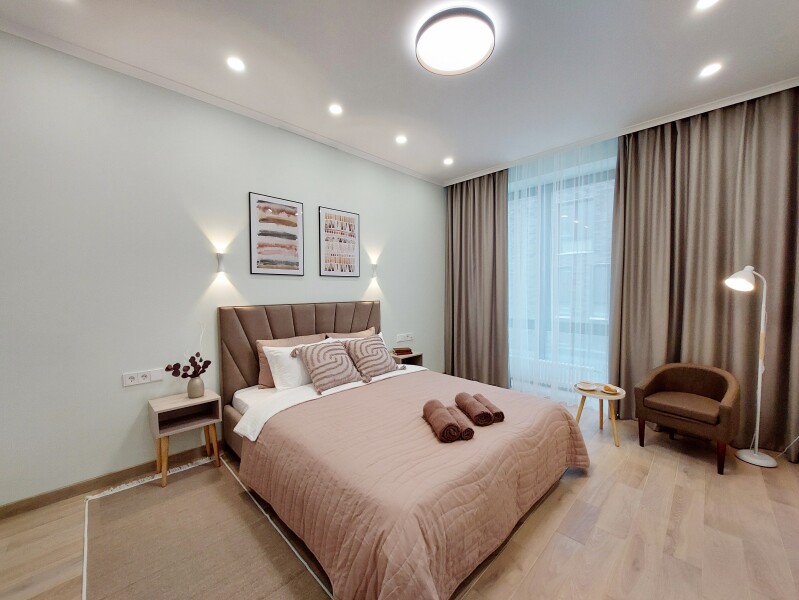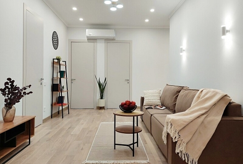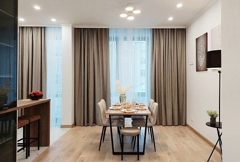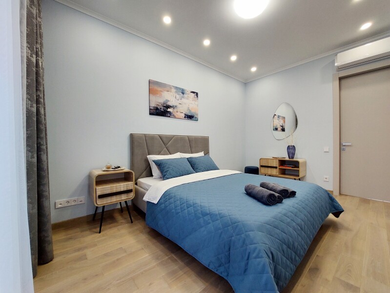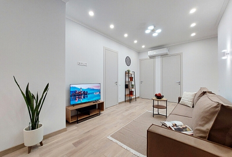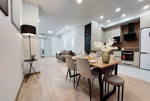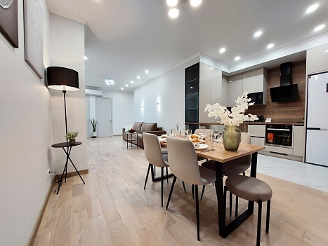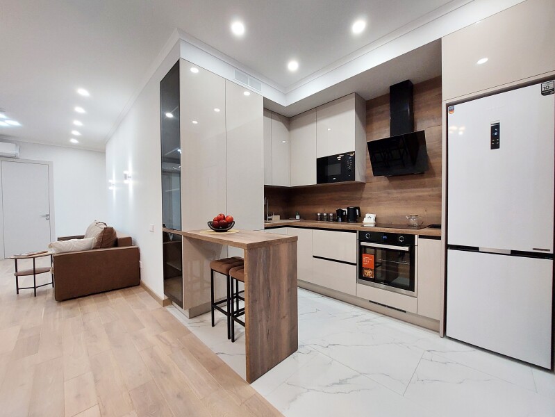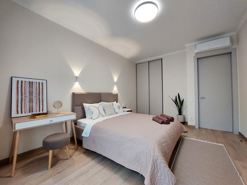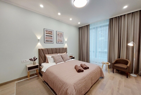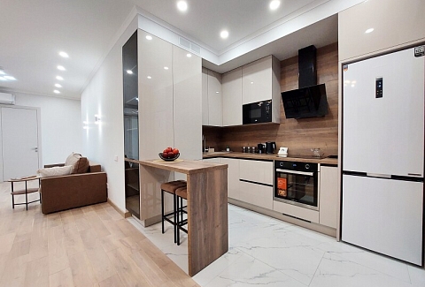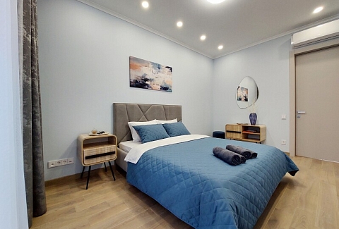В номере: вешалка, диван раскладной, зеркало, кресло, кровать двуспальная, кухонная мебель, прикроватные тумбочки, столик журнальный, столик туалетный, стол обеденный, стулья, шкаф, гладильная доска, духовой шкаф, кондиционер, микроволновая печь, набор посуды, плита индукционная, посудомоечная машина, стиральная машина, сушилка для белья, телевизор ЖК, утюг, холодильник, чайный набор посуды, электрочайник