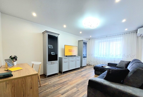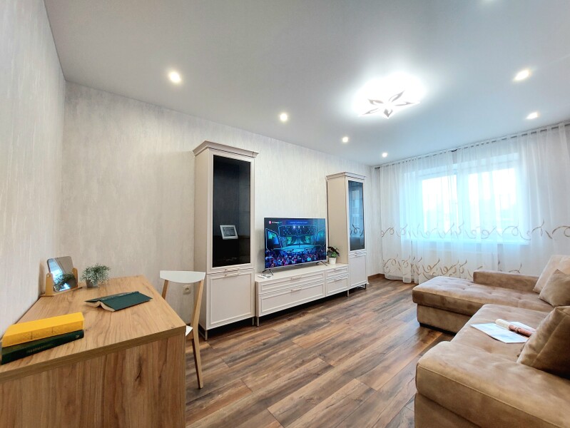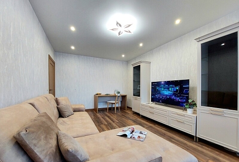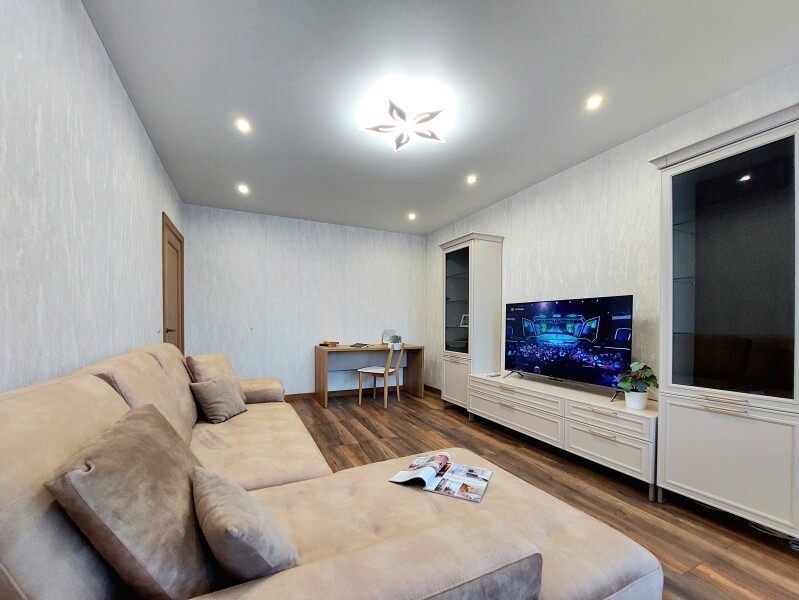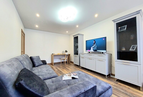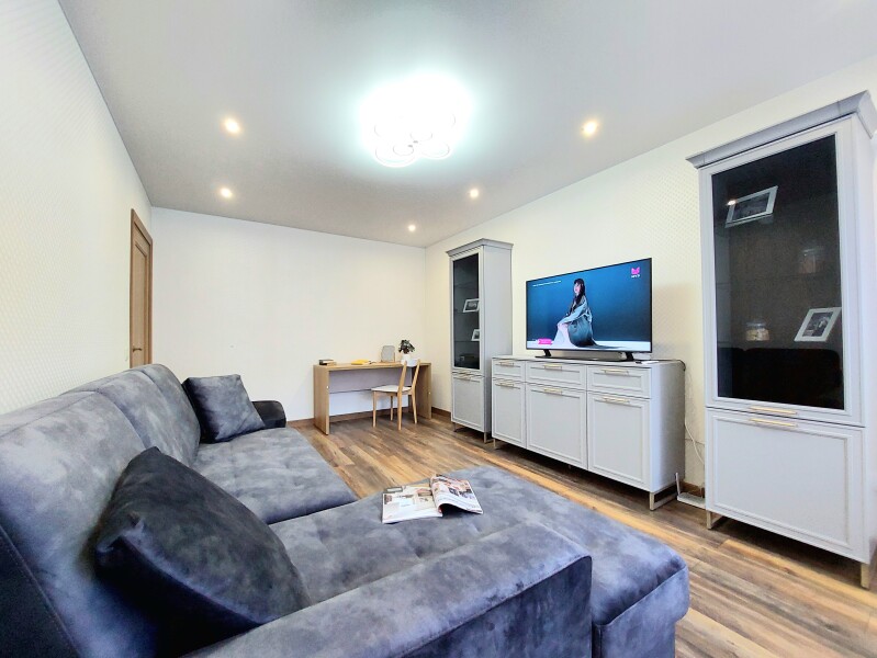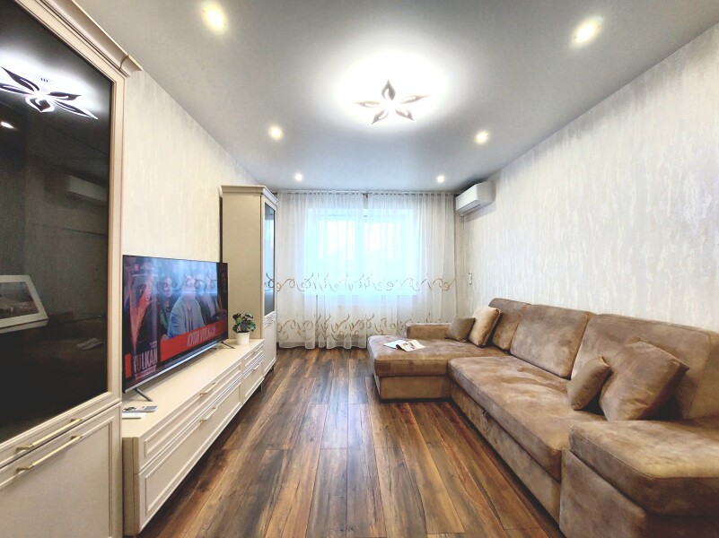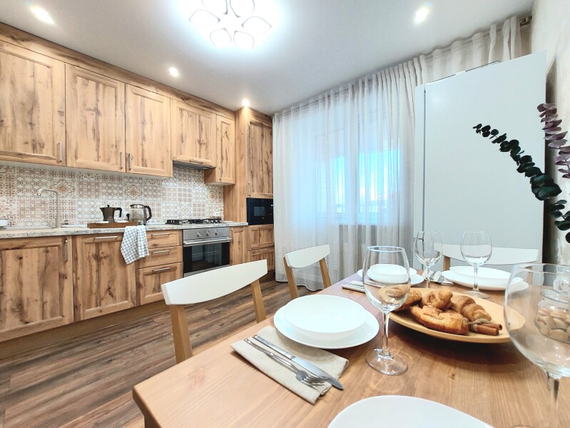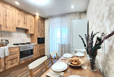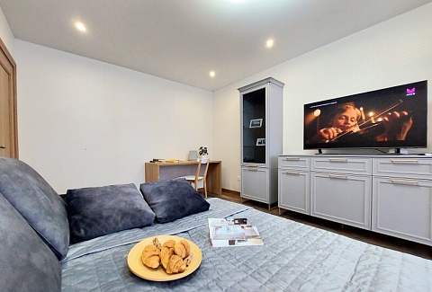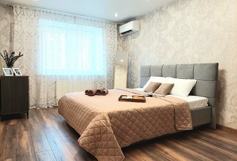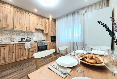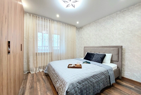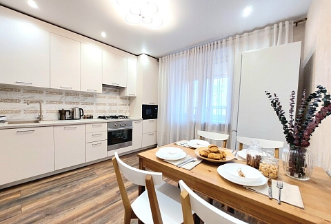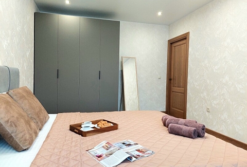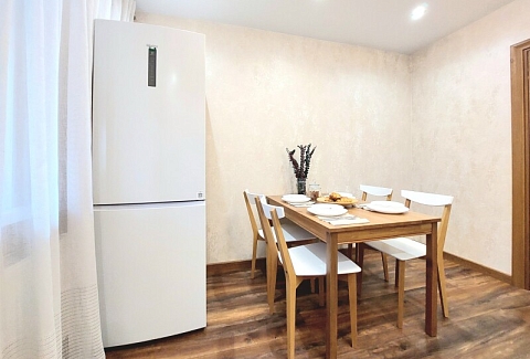 В номере: вешалка, диван раскладной, зеркало, кровать двуспальная, кухонная мебель, стол, стол обеденный, стулья, тумба, шкаф, гладильная доска, духовой шкаф, кондиционер, микроволновая печь, набор посуды, плита газовая, стиральная машина, сушилка для белья, телевизор ЖК, утюг, холодильник, чайный набор посуды, электрочайник