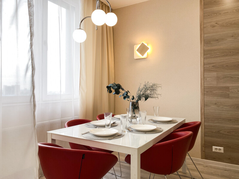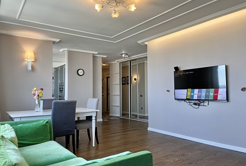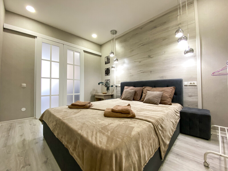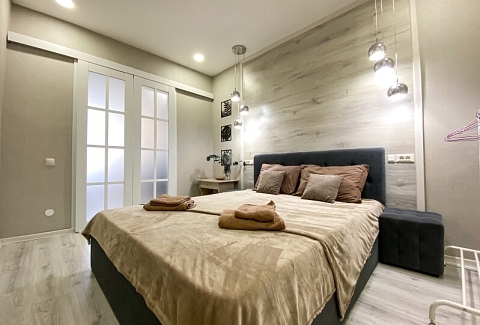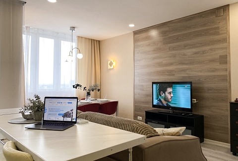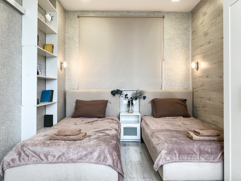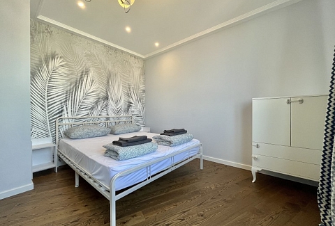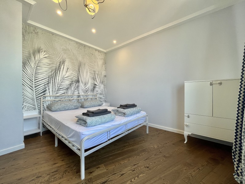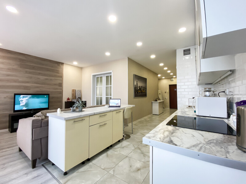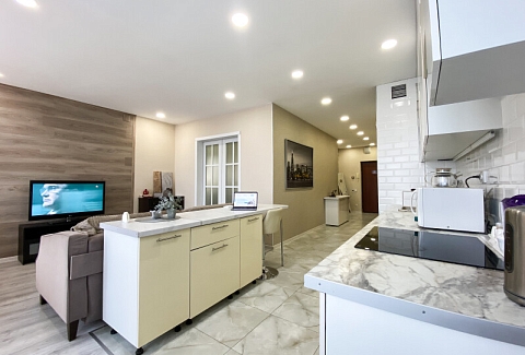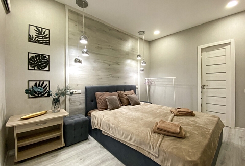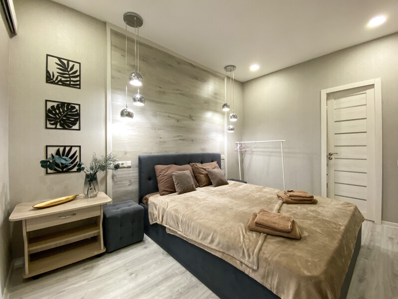 В номере: диван, кровать двуспальная, стол, стулья, шкаф, гладильная доска, кондиционер, микроволновая печь, набор посуды, плита индукционная, посудомоечная машина, стиральная машина, телевизор, холодильник, чайник