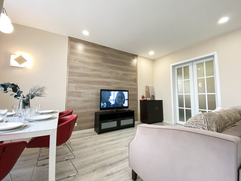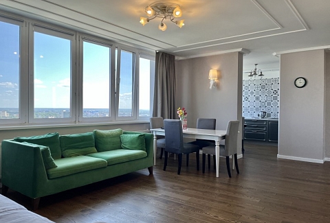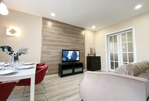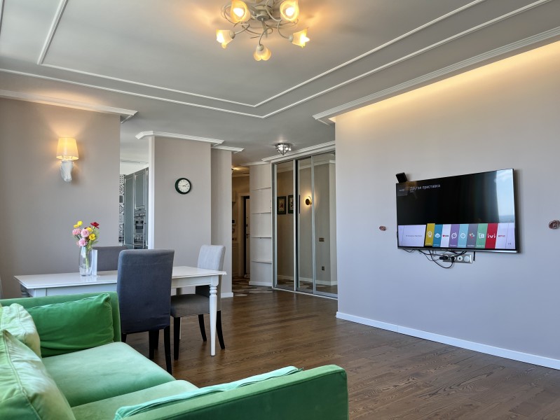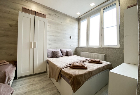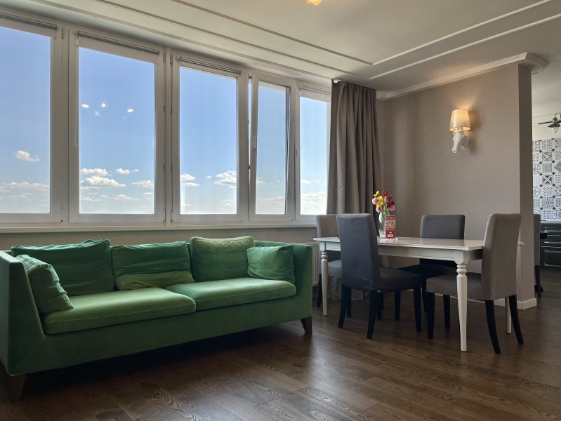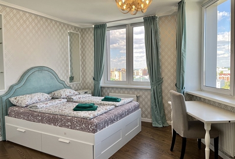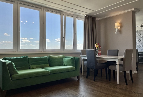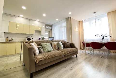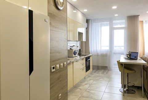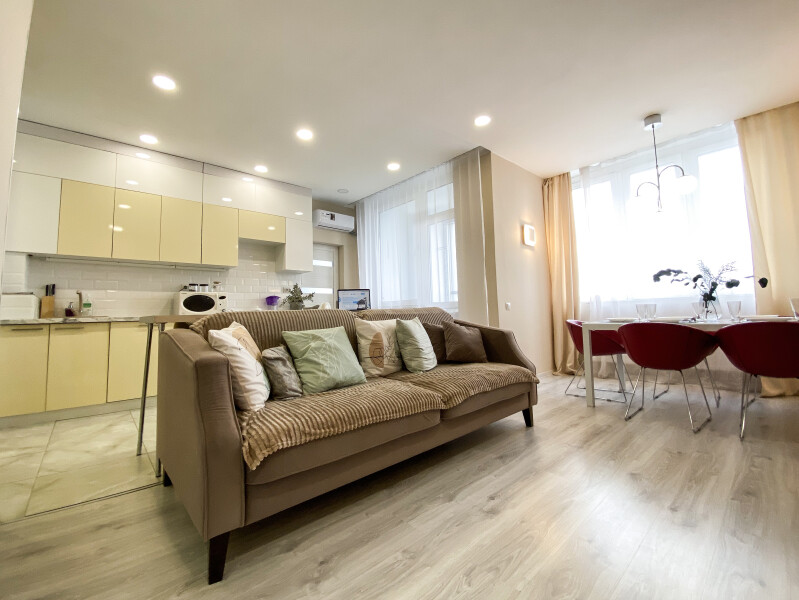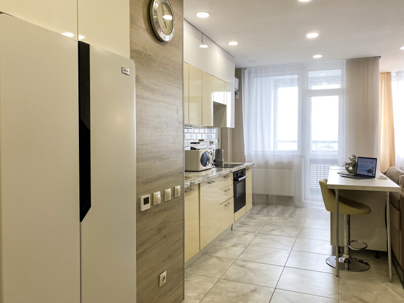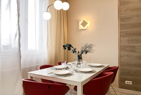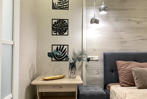 В номере: диван, кровать двуспальная, стол, стулья, шкаф, гладильная доска, кондиционер, микроволновая печь, набор посуды, плита индукционная, посудомоечная машина, стиральная машина, телевизор, холодильник, чайник
