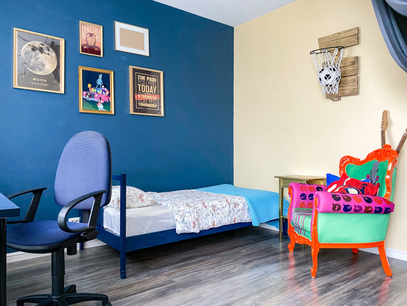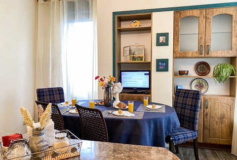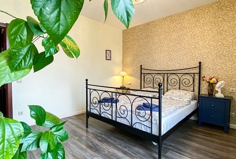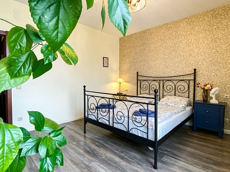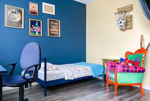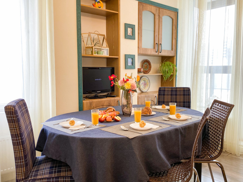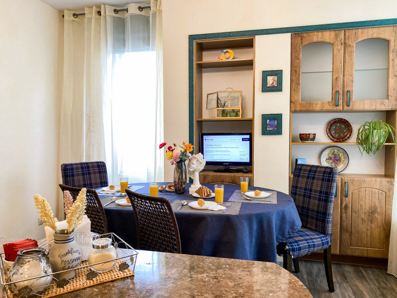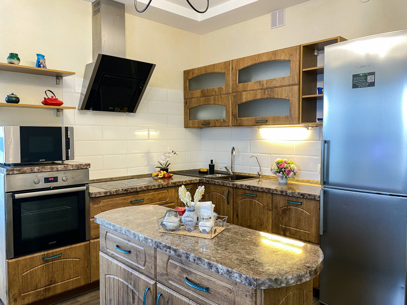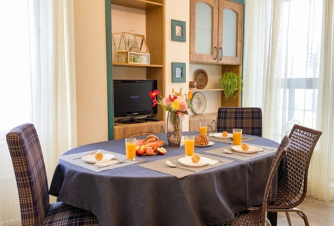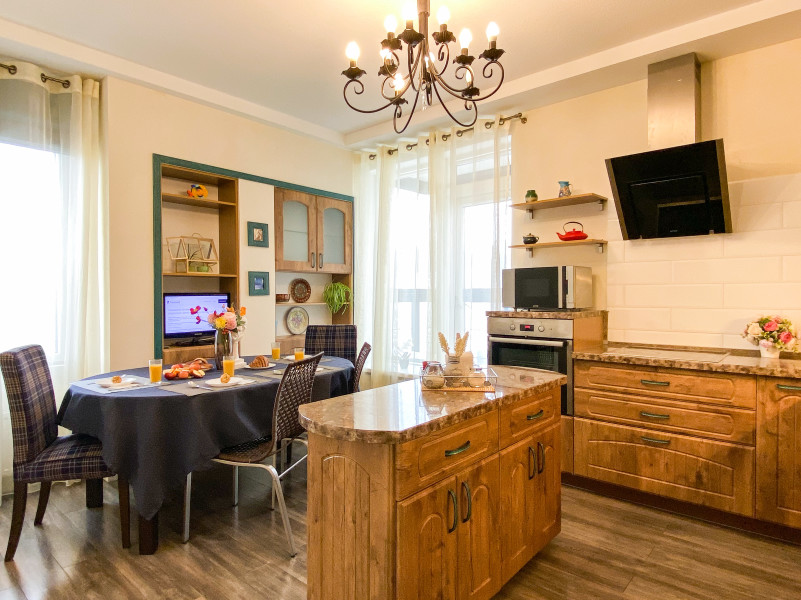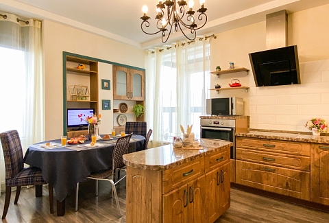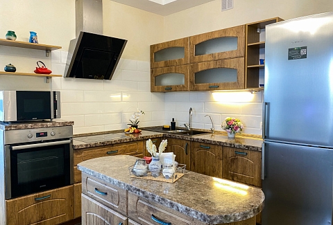 В номере: диван раскладной, кровати односпальные, кровать двуспальная, прикроватные тумбочки, стол, стулья, шкаф, гладильная доска, кондиционер, набор посуды, плита индукционная, посудомоечная машина, стиральная машина, телевизор, утюг, чайник
