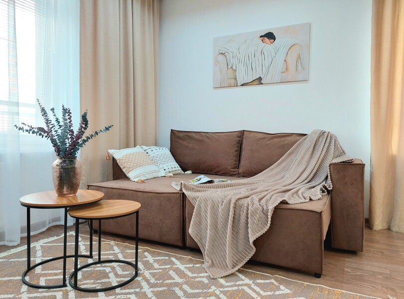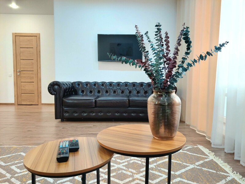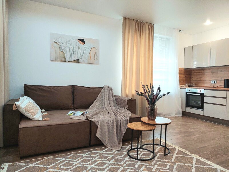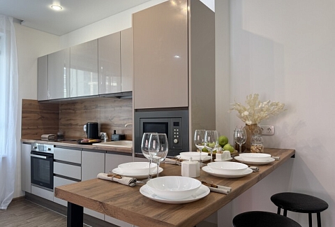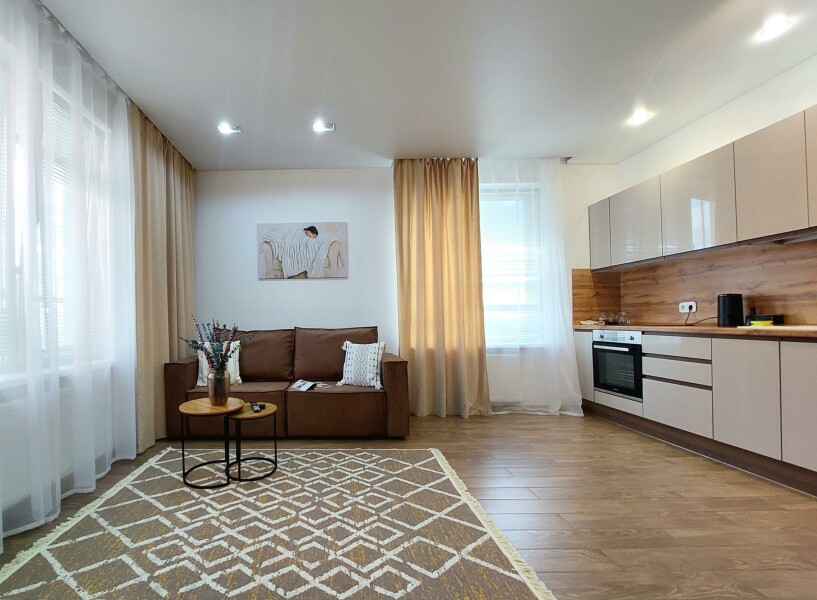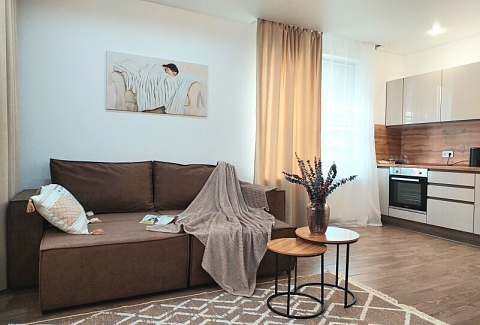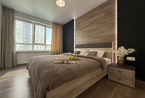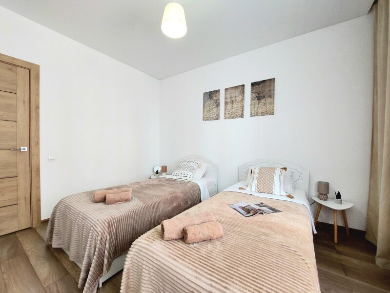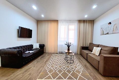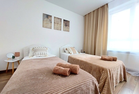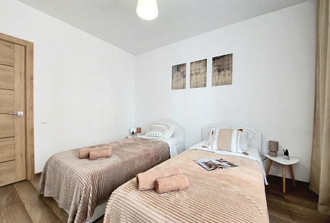 Территория закрытая и включает разнообразные объекты для всех возрастов — от современной детской площадки с безопасным покрытием до многофункциональной спортивной зоны под открытым небом. Любители командных игр могут воспользоваться баскетбольной площадкой и футбольным полем, а так же на территории имеются беседки для отдыха на свежем воздухе. За территорией комплекса доступна общественная парковка.На шестом этаже гостей ждет пространство с европейским шармом — две просторные комнаты с четырьмя комфортабельными спальными местами, где предусмотрены двуспальная кровать, две односпальные кровати. в Кухне располагаются два дивана. Интерьер в спокойной цветовой гамме с современной мебелью создает умиротворяющую обстановку. SMART-телевизор становится центром вечернего досуга, а высокоскоростной Wi-Fi поддерживает неразрывную связь с внешним миром.Для самостоятельного приготовления пищи оборудована компактная кухня с электрической плитой и всей необходимой техникой, а в стильной ванной комнате гостей ждет душевая кабина и стиральная машина. Все детали продуманы до мелочей — от мягких полотенец и фена до шампуней и свежего постельного белья. Эти апартаменты становятся идеальным решением для тех, кто ценит эстетику просторных помещений, развитую инфраструктуру и возможность в любой момент оказаться в эпицентре городской жизни.