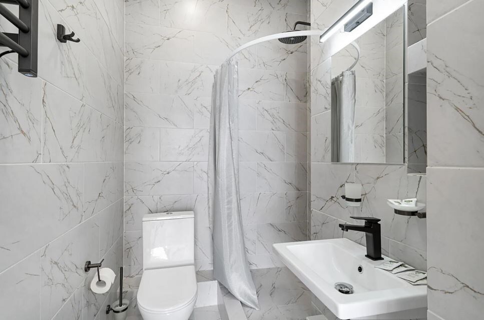 Санузел: с душем или ванной, тапочки, туалетные принадлежности, фен, халат
