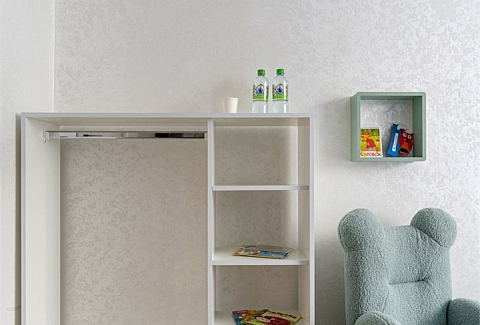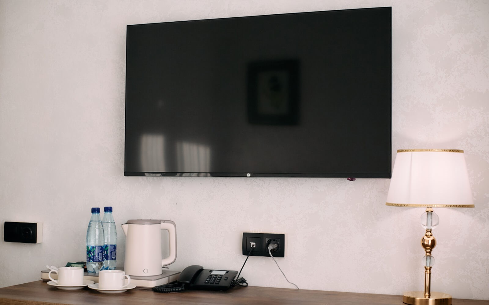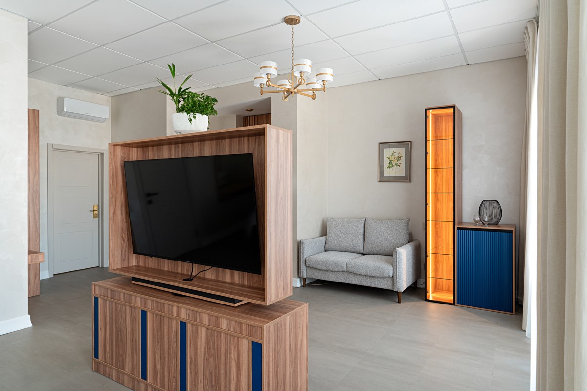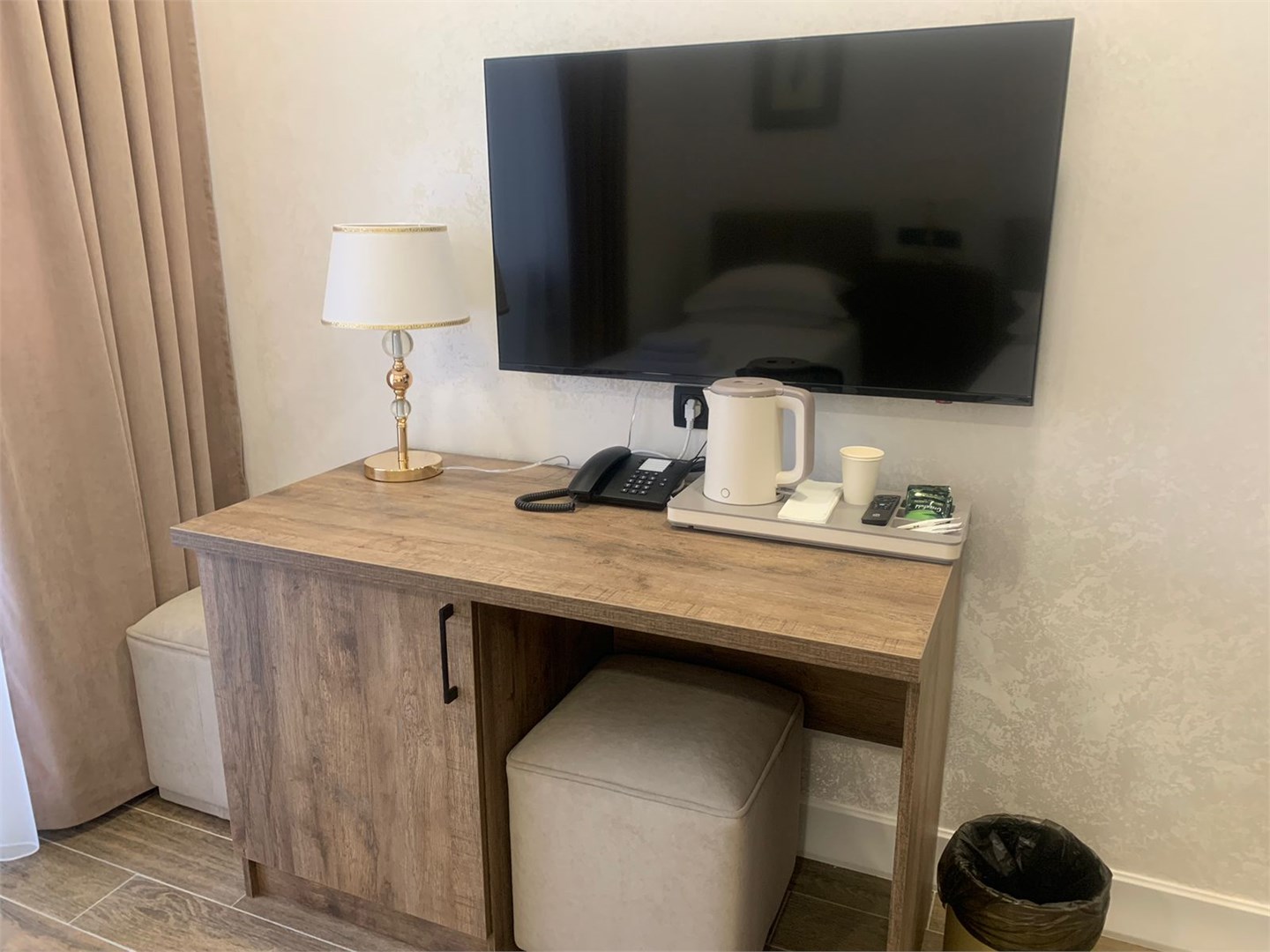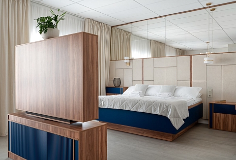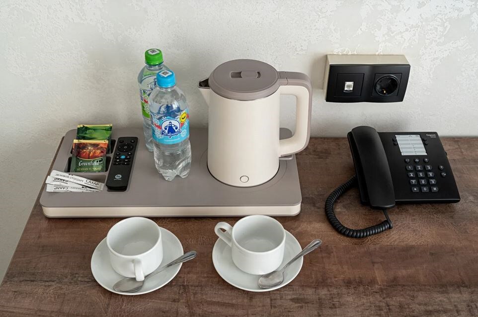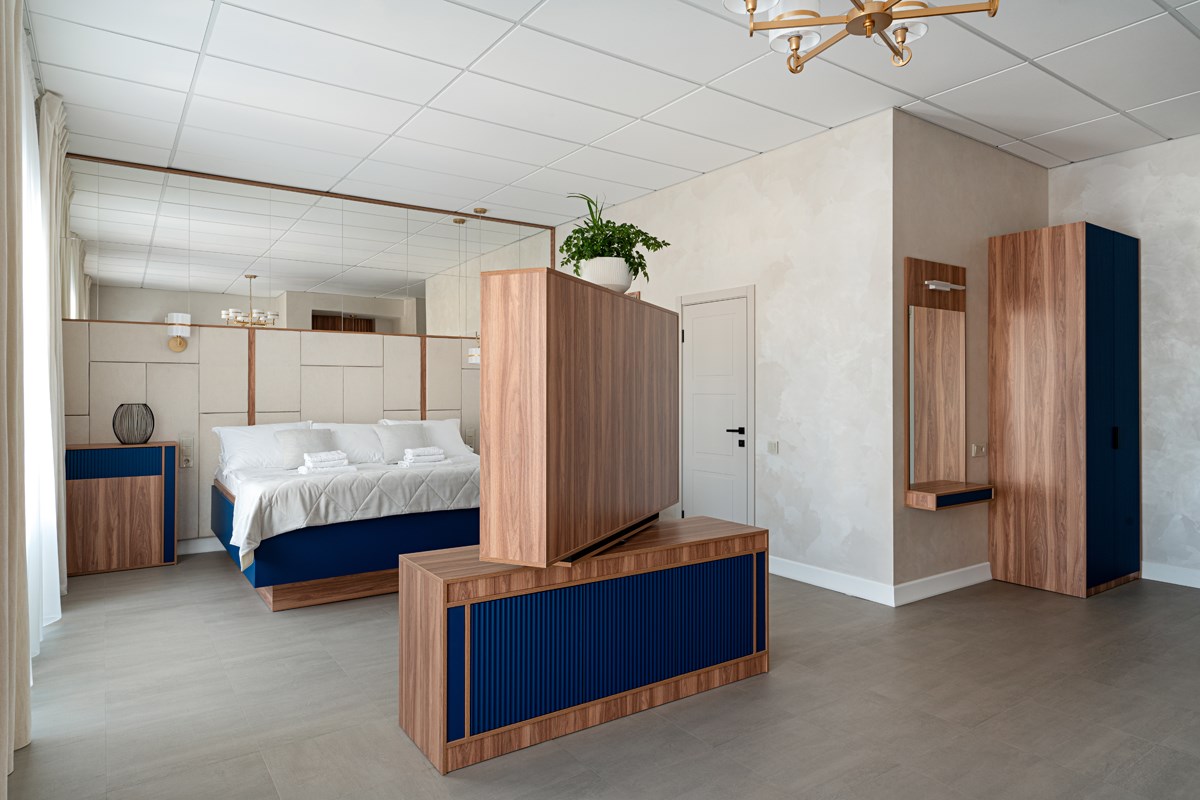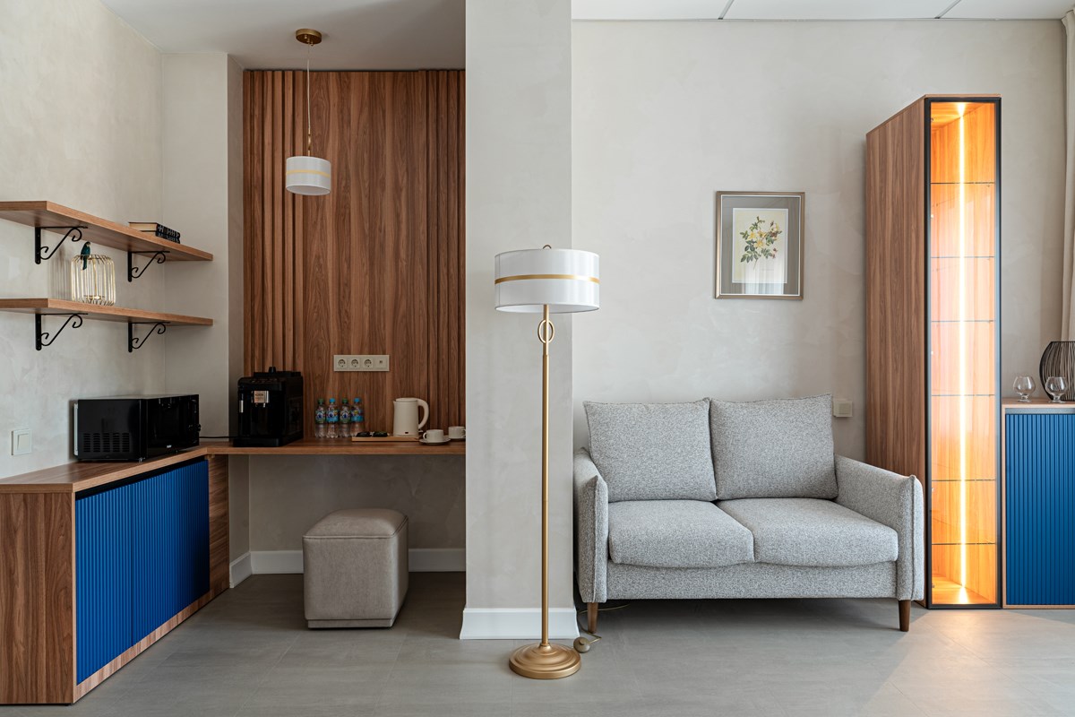 В номере: диван, кровать двуспальная, прикроватные тумбочки, стол, стулья, шкаф, гладильная доска, кондиционер, кофемашина, мини-холодильник, сейф, телевизор, телефон, утюг, чайная станция