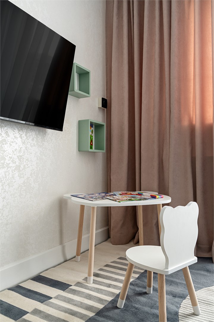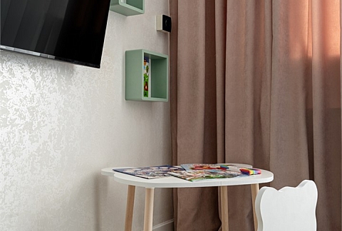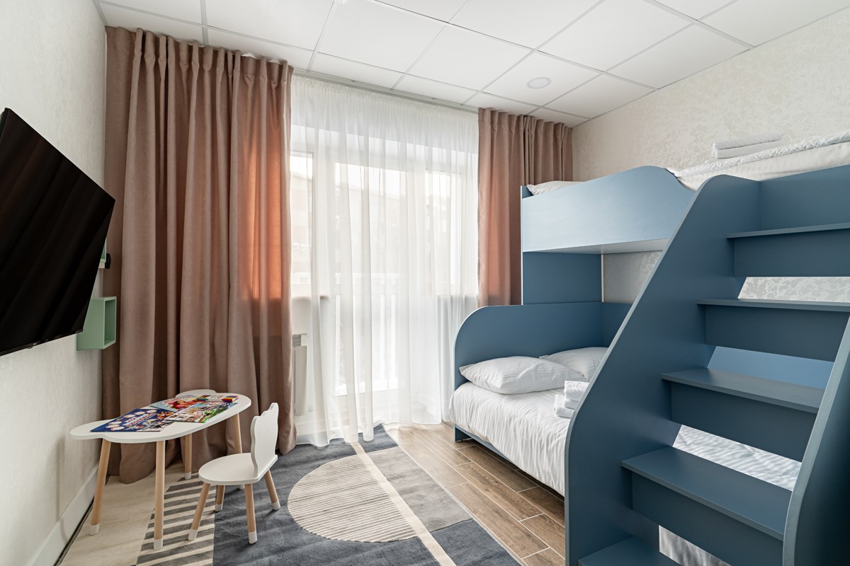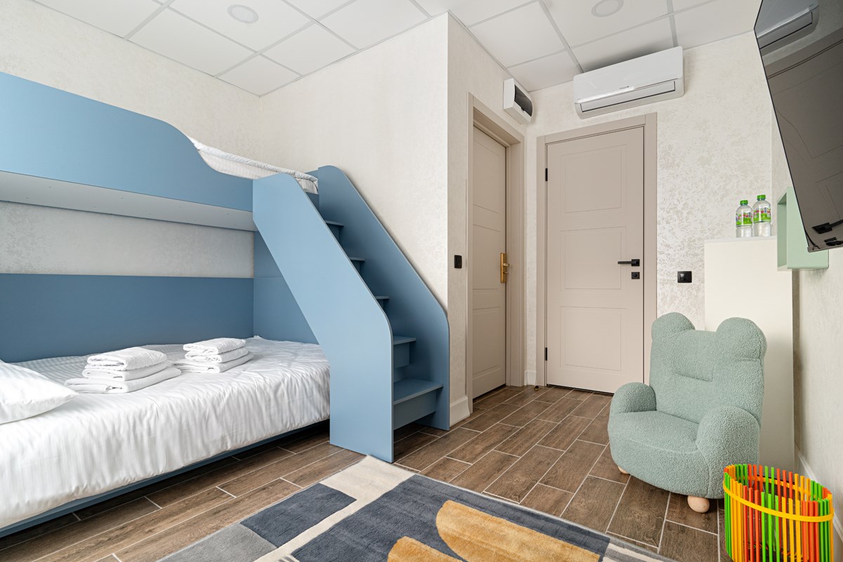 В номере: кресло, кровать двухъярусная, стол, стул, кондиционер, телевизор