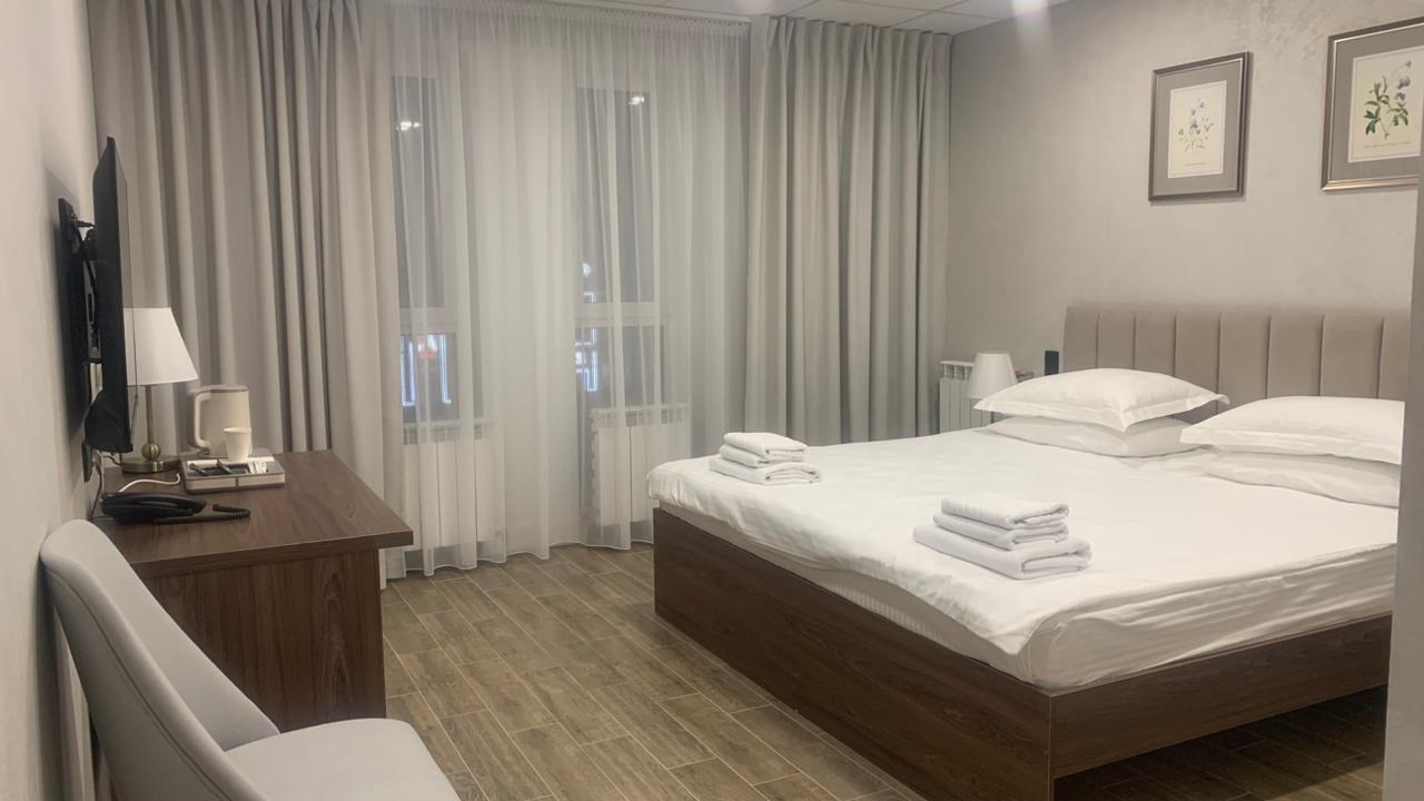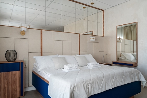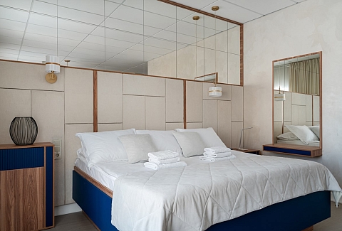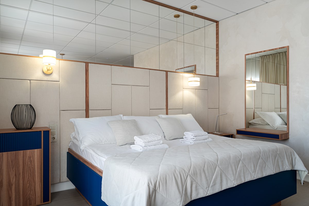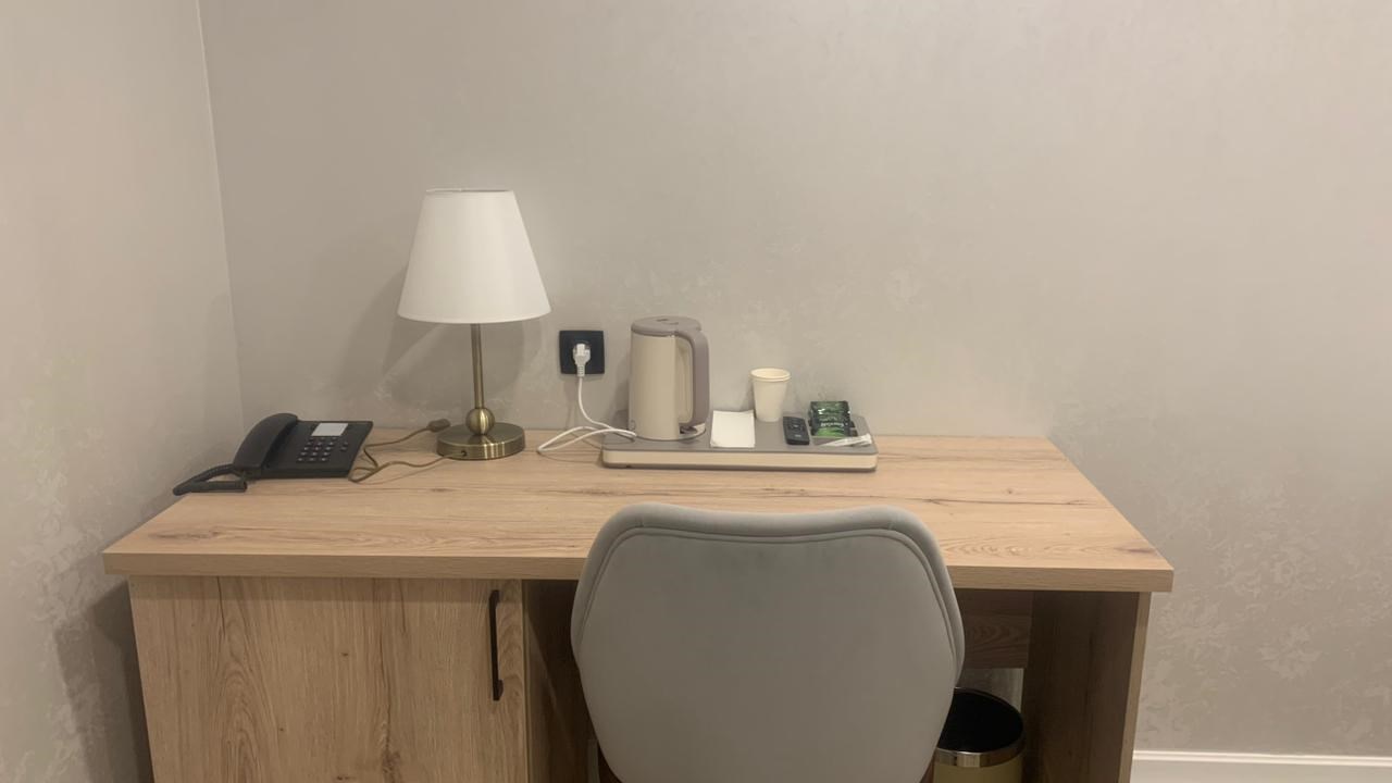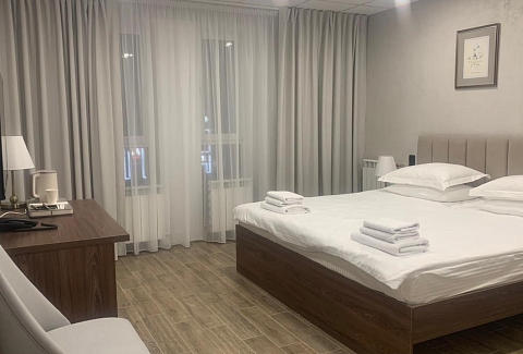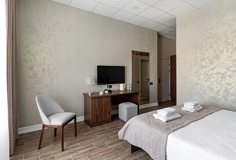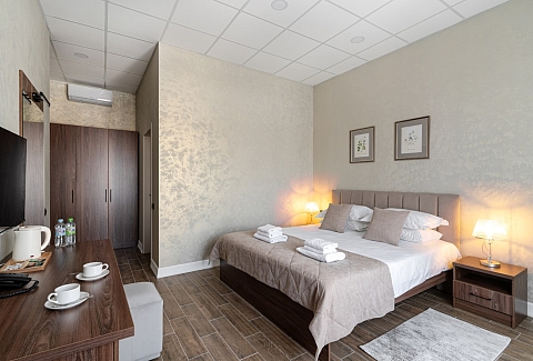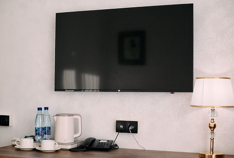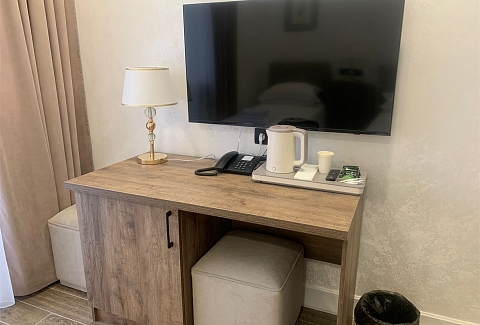 В номере: зеркало, кровать двуспальная, прикроватные тумбочки, стол, стулья, шкаф, гладильная доска, кондиционер, мини-холодильник, сейф, телевизор, телефон, утюг, чайная станция