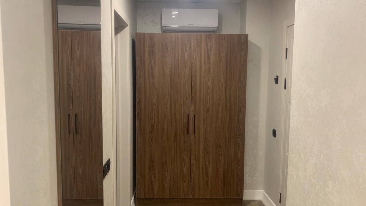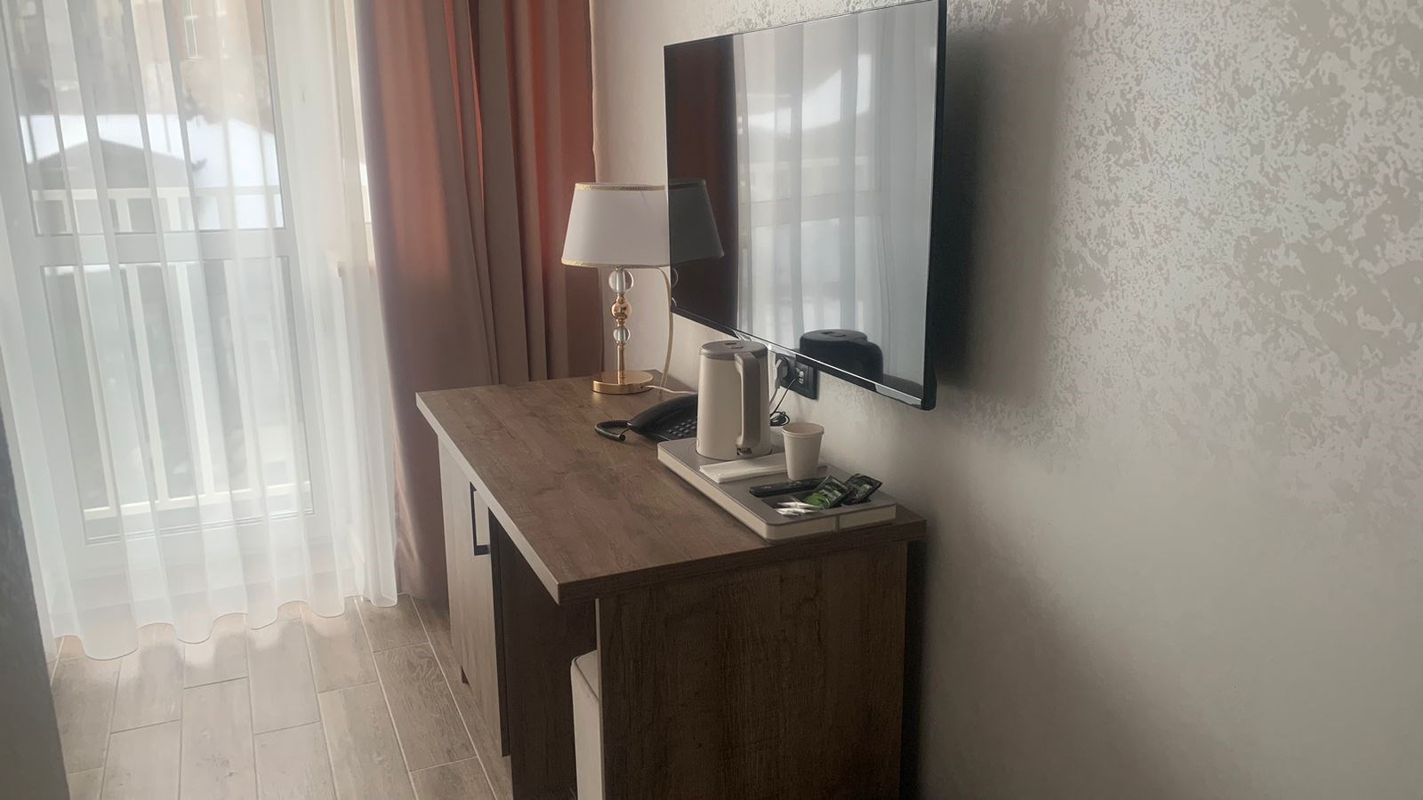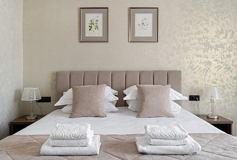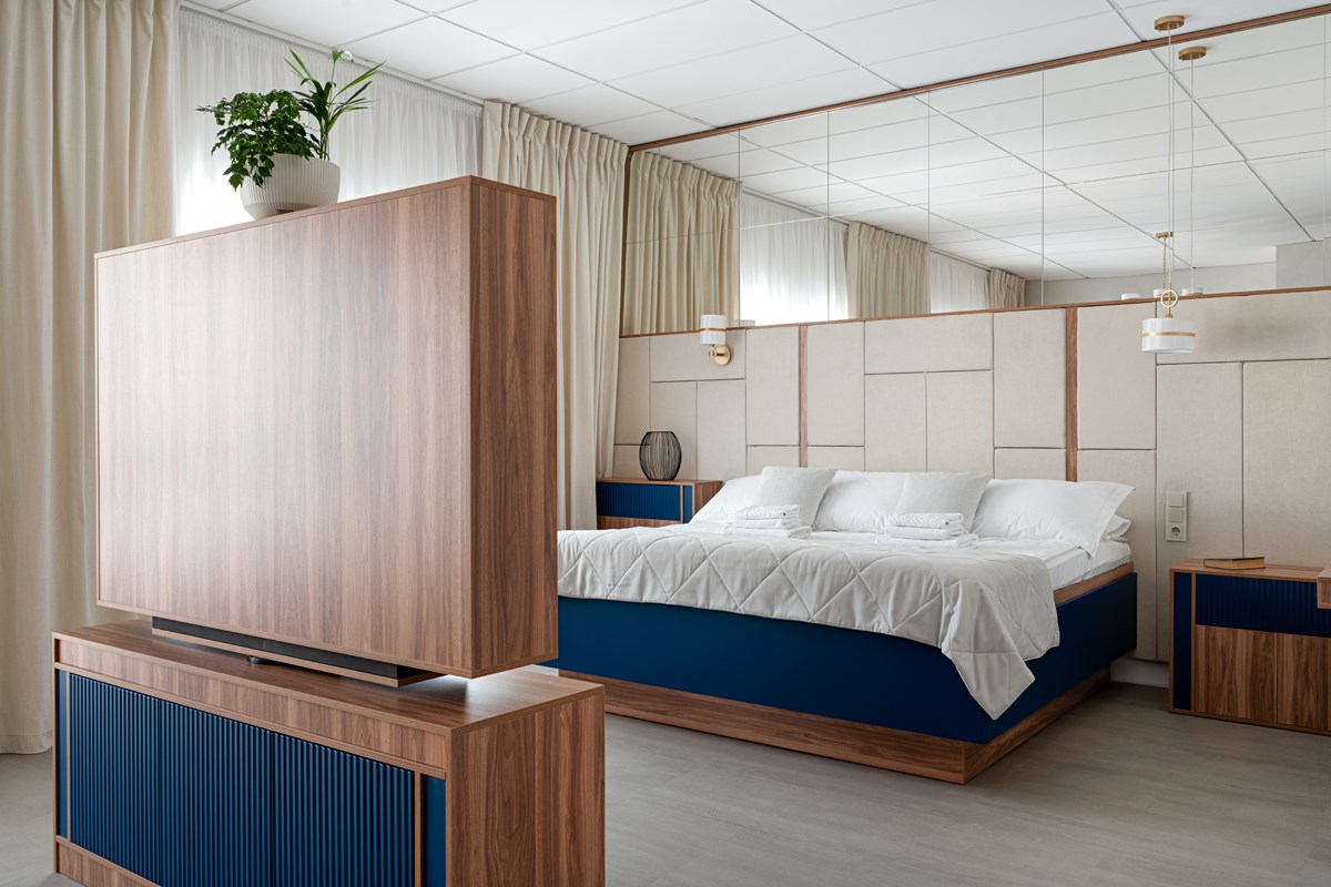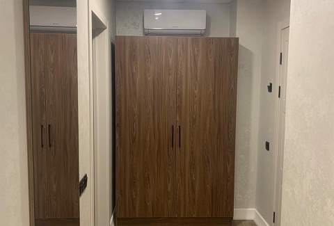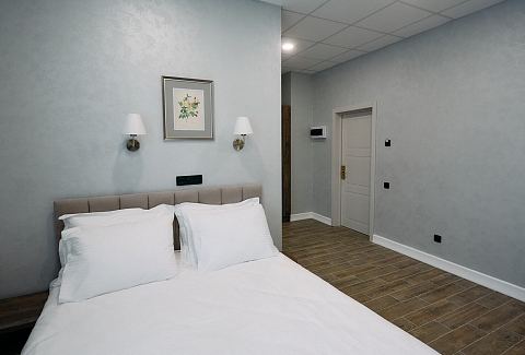 В номере: зеркало, кровать двуспальная, прикроватные тумбочки, стол, стулья, шкаф, гладильная доска, кондиционер, мини-холодильник, сейф, телевизор, телефон, утюг, чайная станция