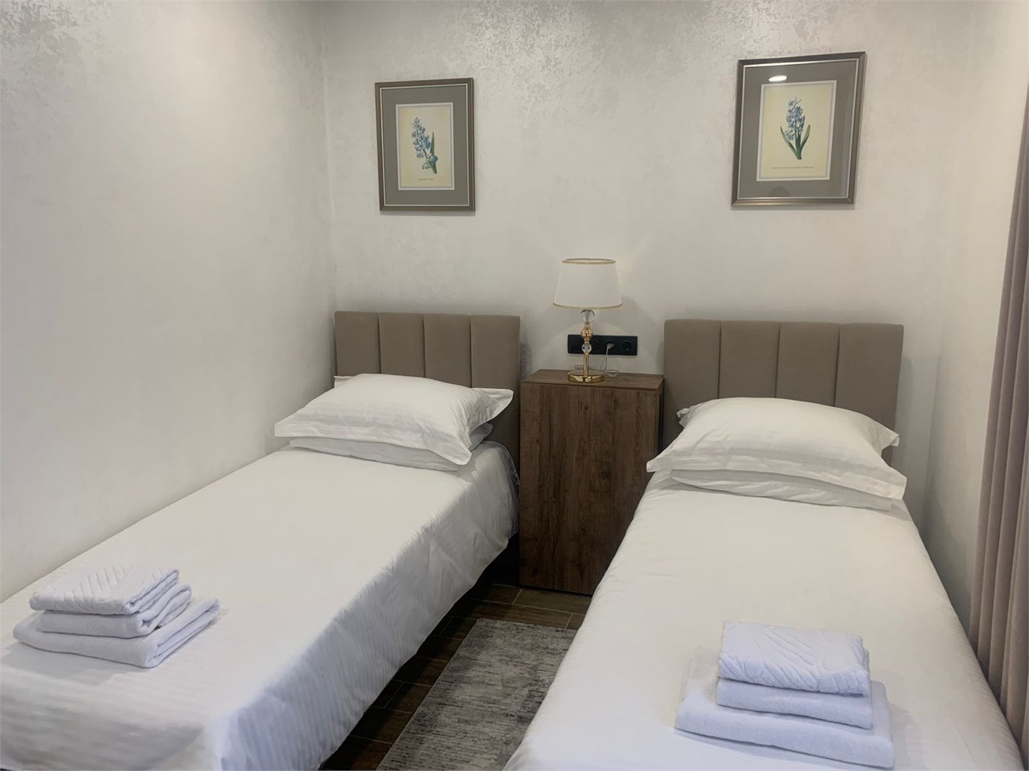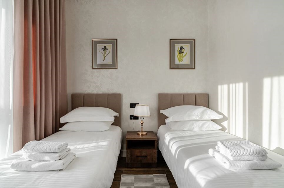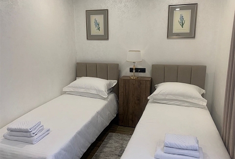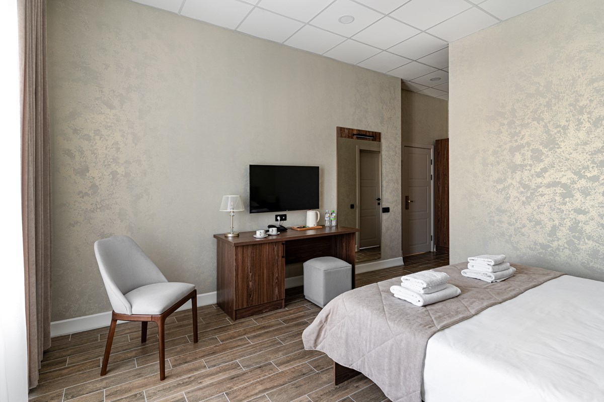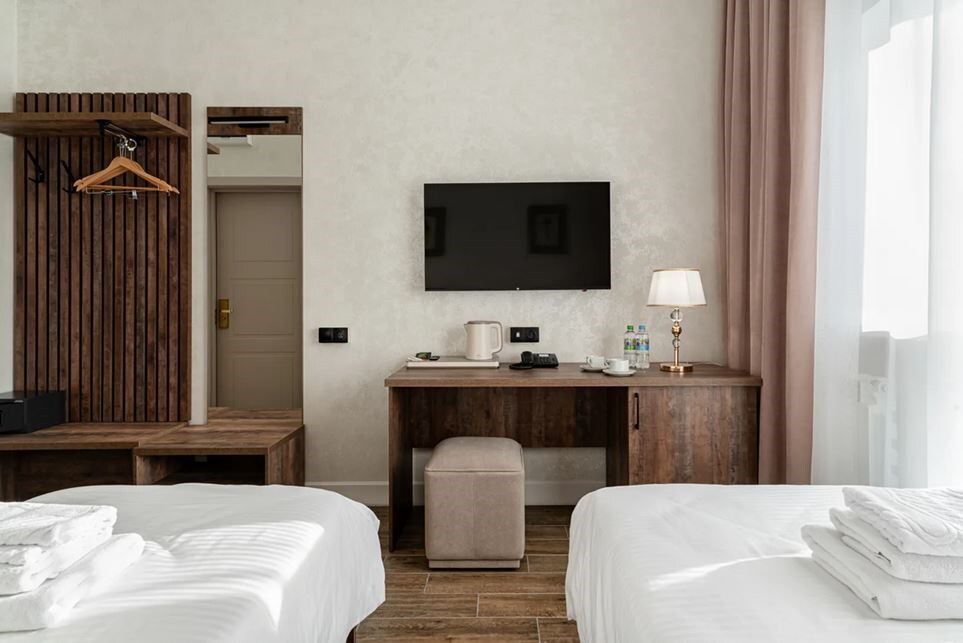 В номере: кровати односпальные, стол, стулья, шкаф, кондиционер, мини-холодильник, сейф, телевизор, телефон