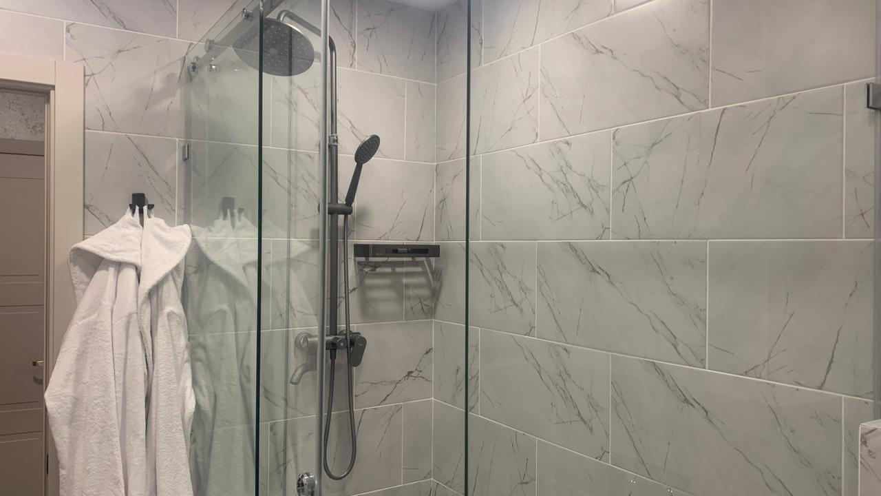 Санузел: с душевой кабиной, тапочки, туалетные принадлежности, фен, халат
