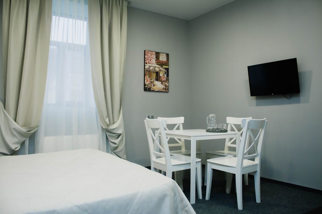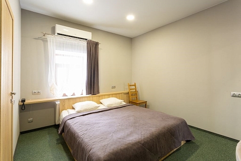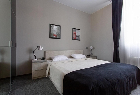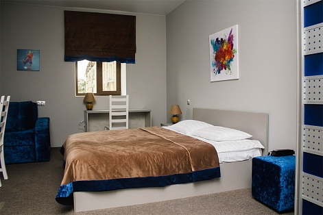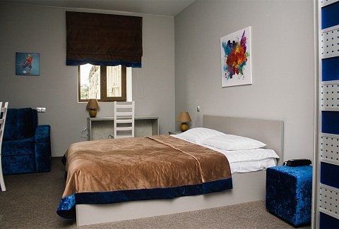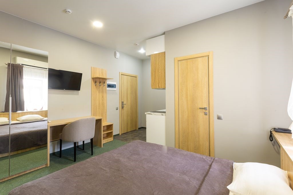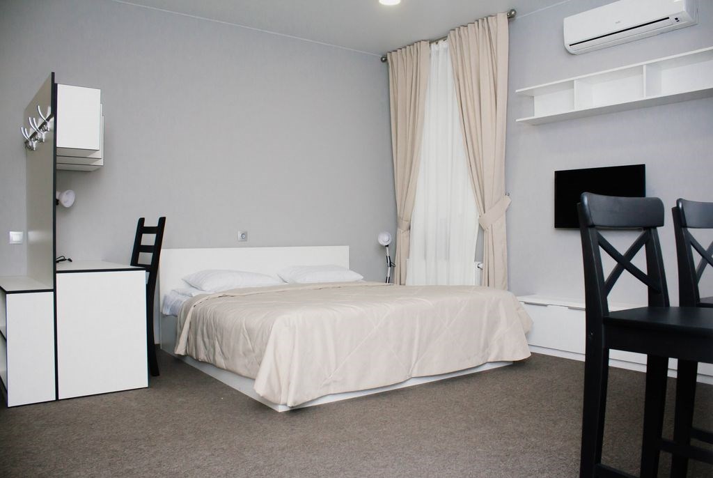 В номере: кровать двуспальная, прикроватные тумбочки, стол, стулья, шкаф-купе, кондиционер, микроволновая печь, плита электрическая, телевизор, телефон, холодильник, электрочайник