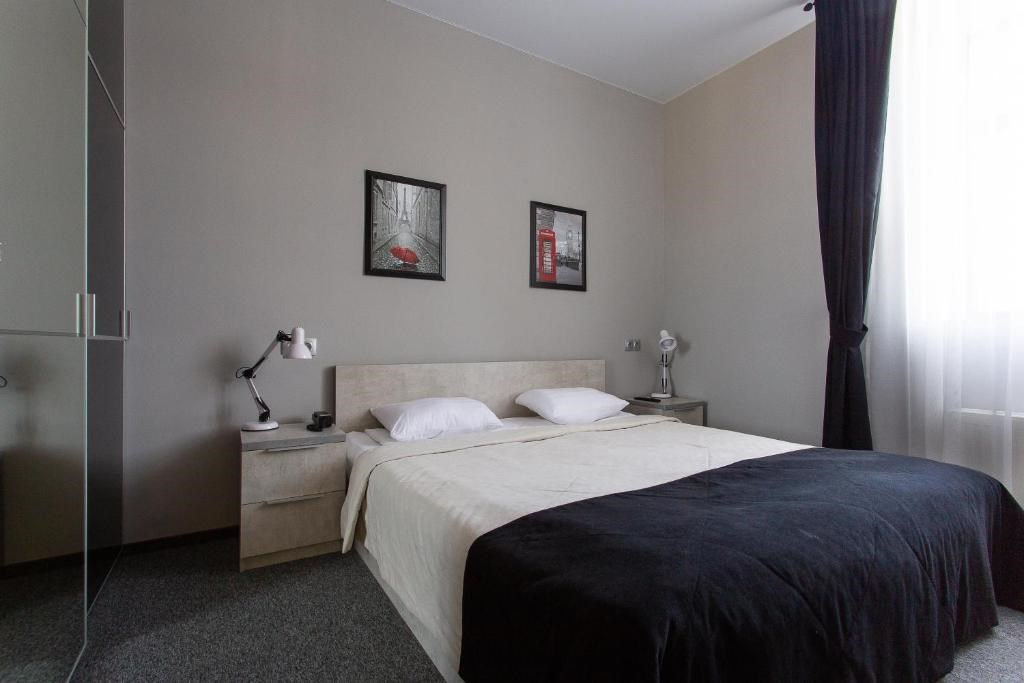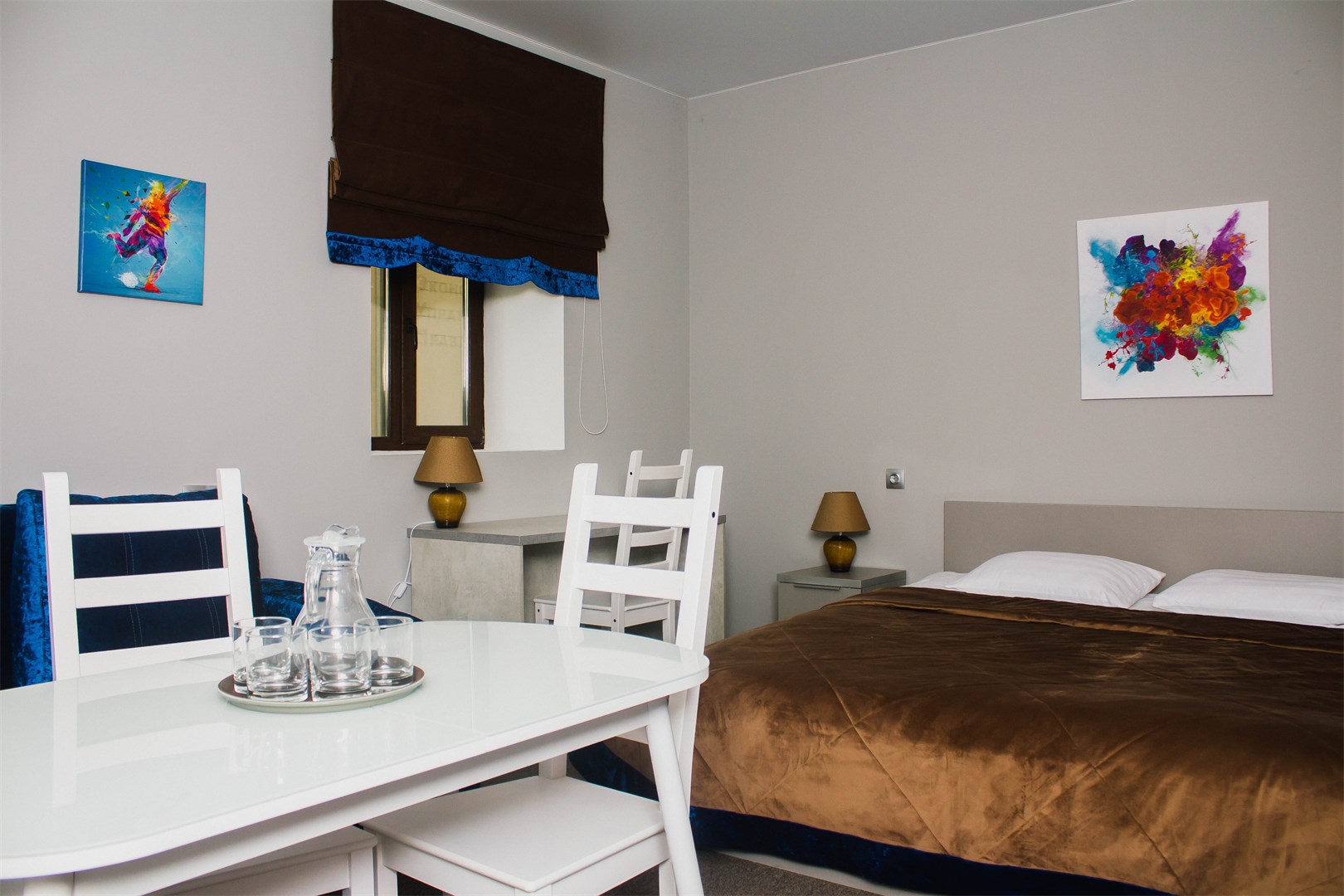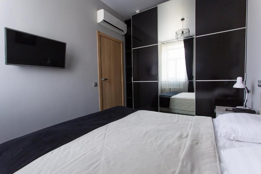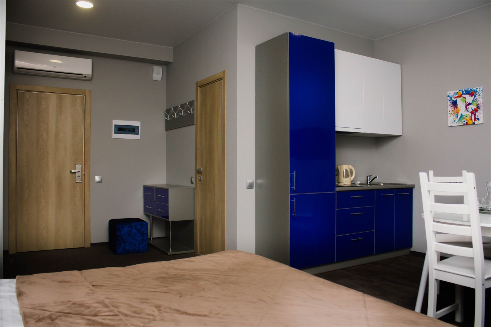 В номере: кровать двуспальная, прикроватные тумбочки, стол, стулья, шкаф-купе, кондиционер, микроволновая печь, плита электрическая, телевизор, телефон, холодильник, электрочайник
