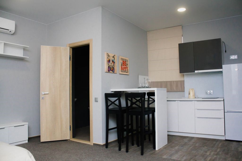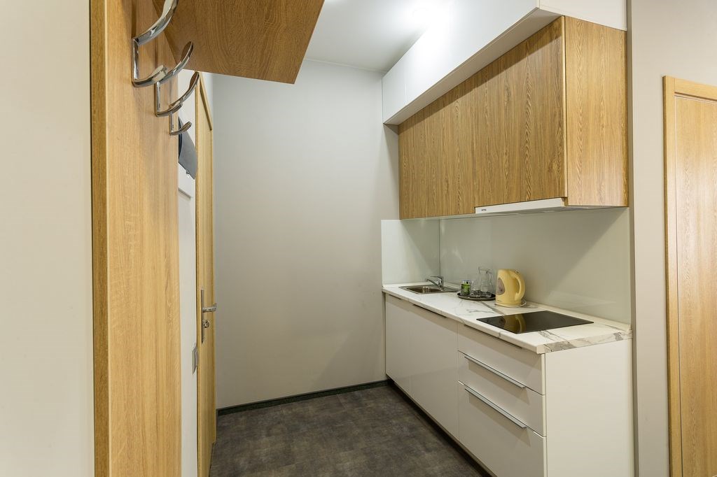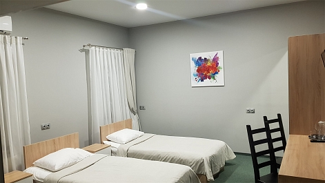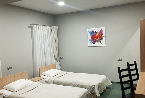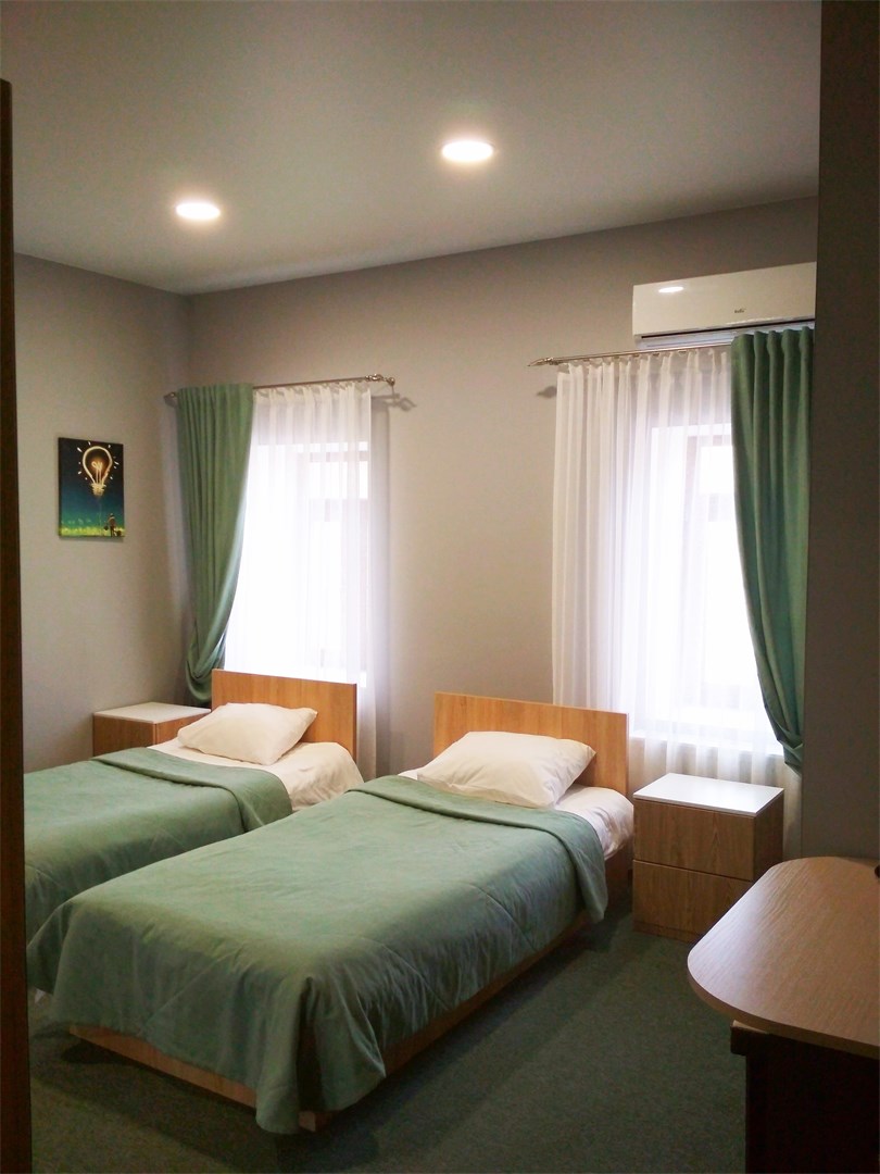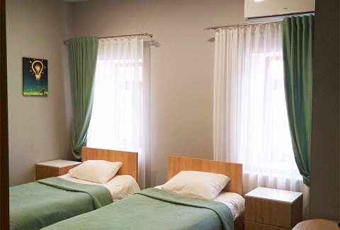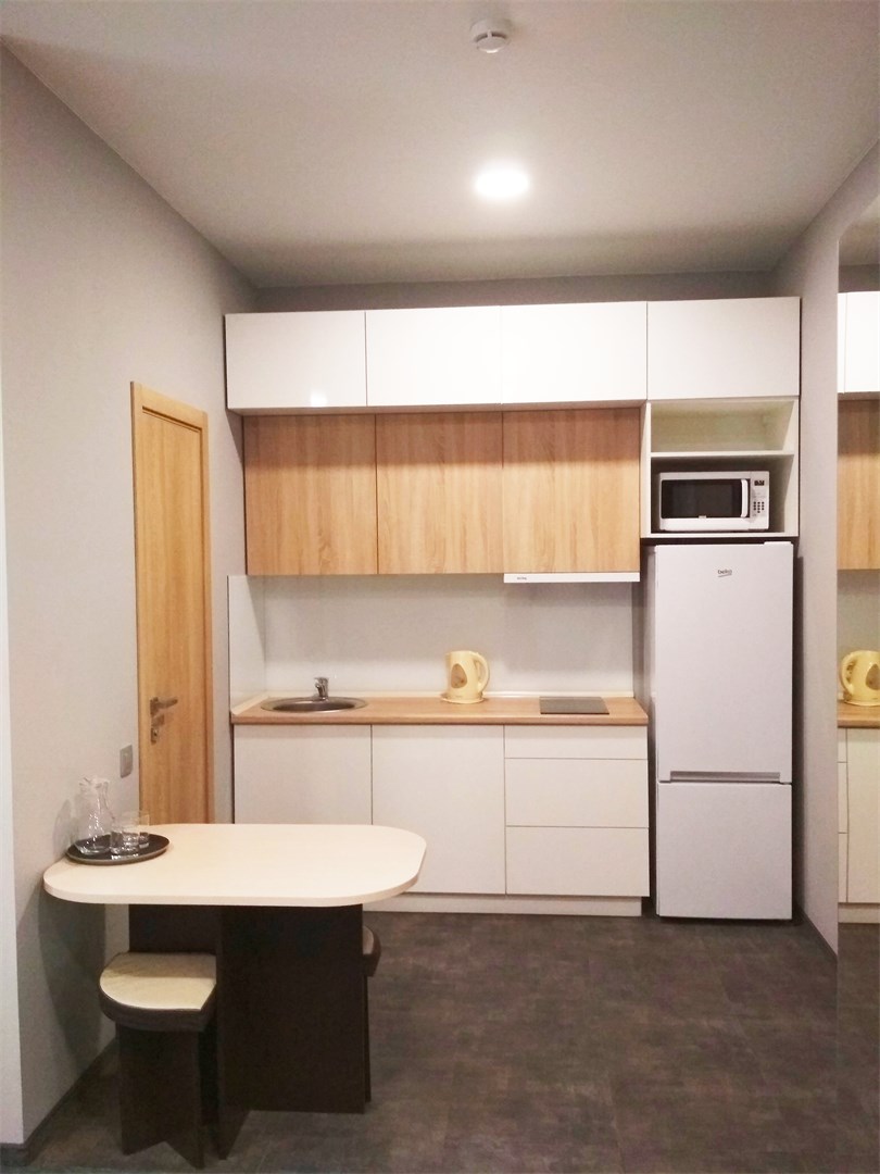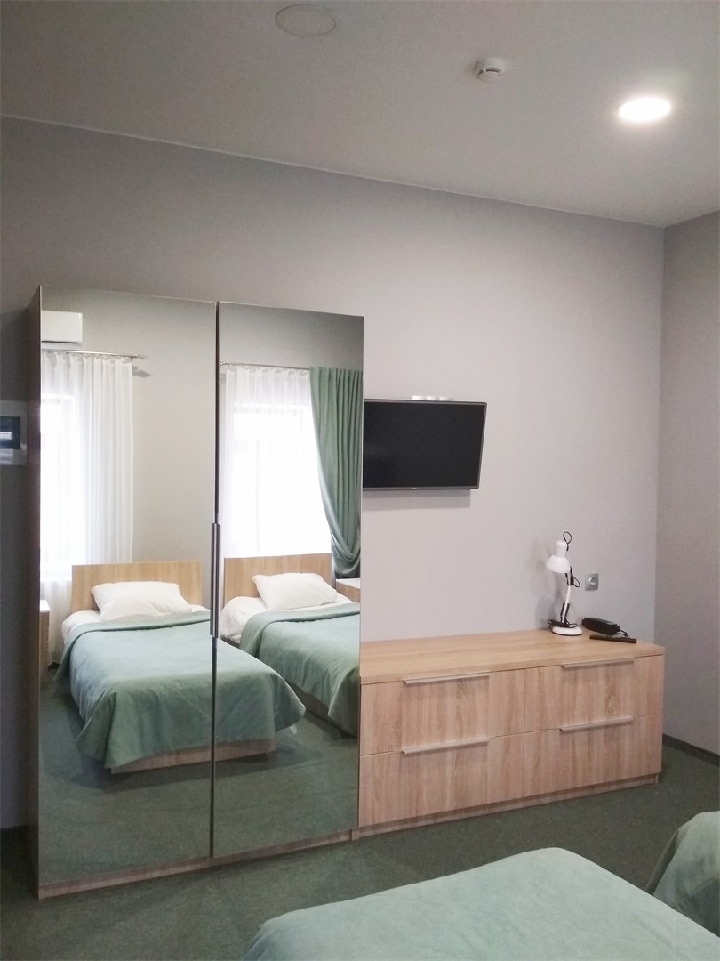 В номере: кровати односпальные, прикроватные тумбочки, стол, стулья, шкаф, кондиционер, микроволновая печь, плита электрическая, телевизор, телефон, холодильник, электрочайник