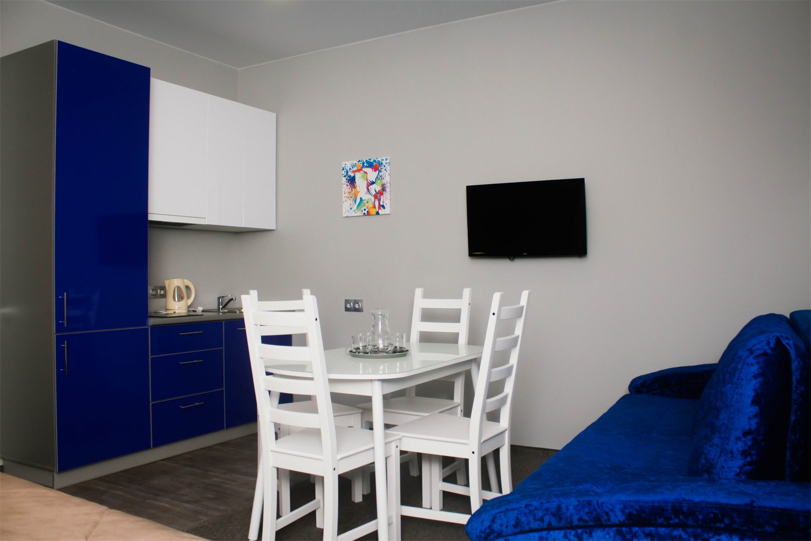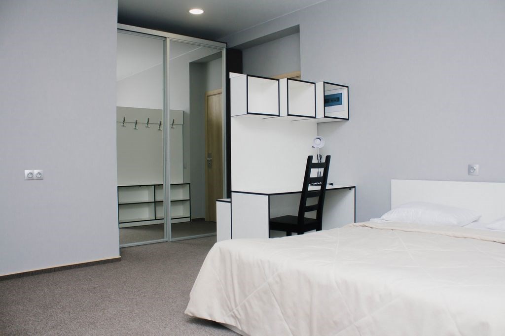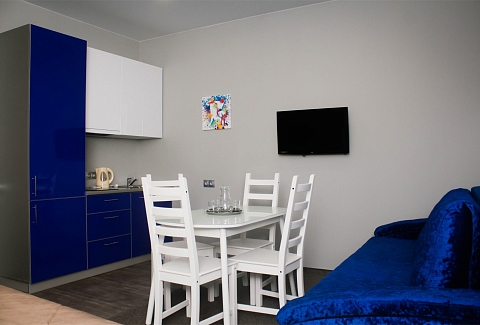 В номере: диван раскладной, кровать двуспальная, прикроватные тумбочки, стол, стулья, шкаф, компьютер, микроволновая печь, плита электрическая, телевизор, телефон, холодильник, электрочайник