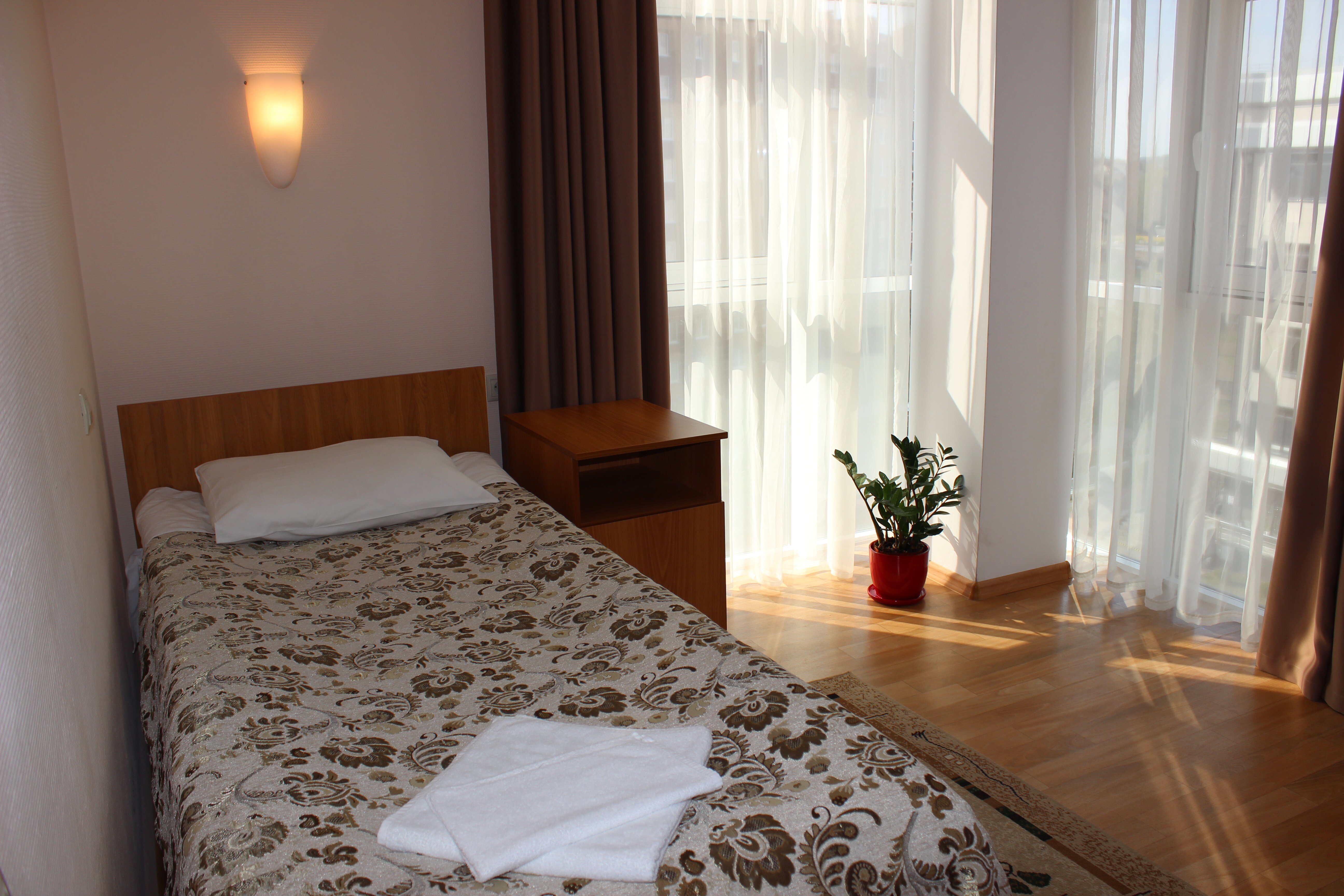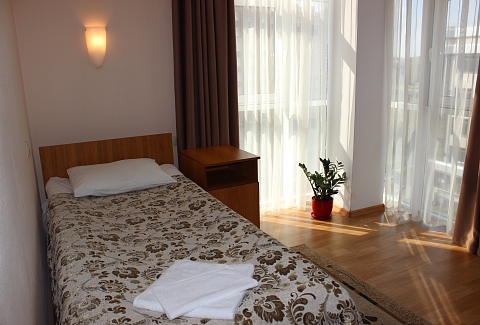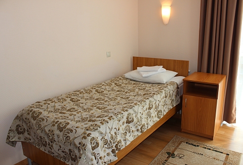 В номере: вешалка, зеркало, кровать односпальная, прикроватные тумбочки, стол, стул, шкаф, кондиционер, мини-холодильник, телевизор, телефон