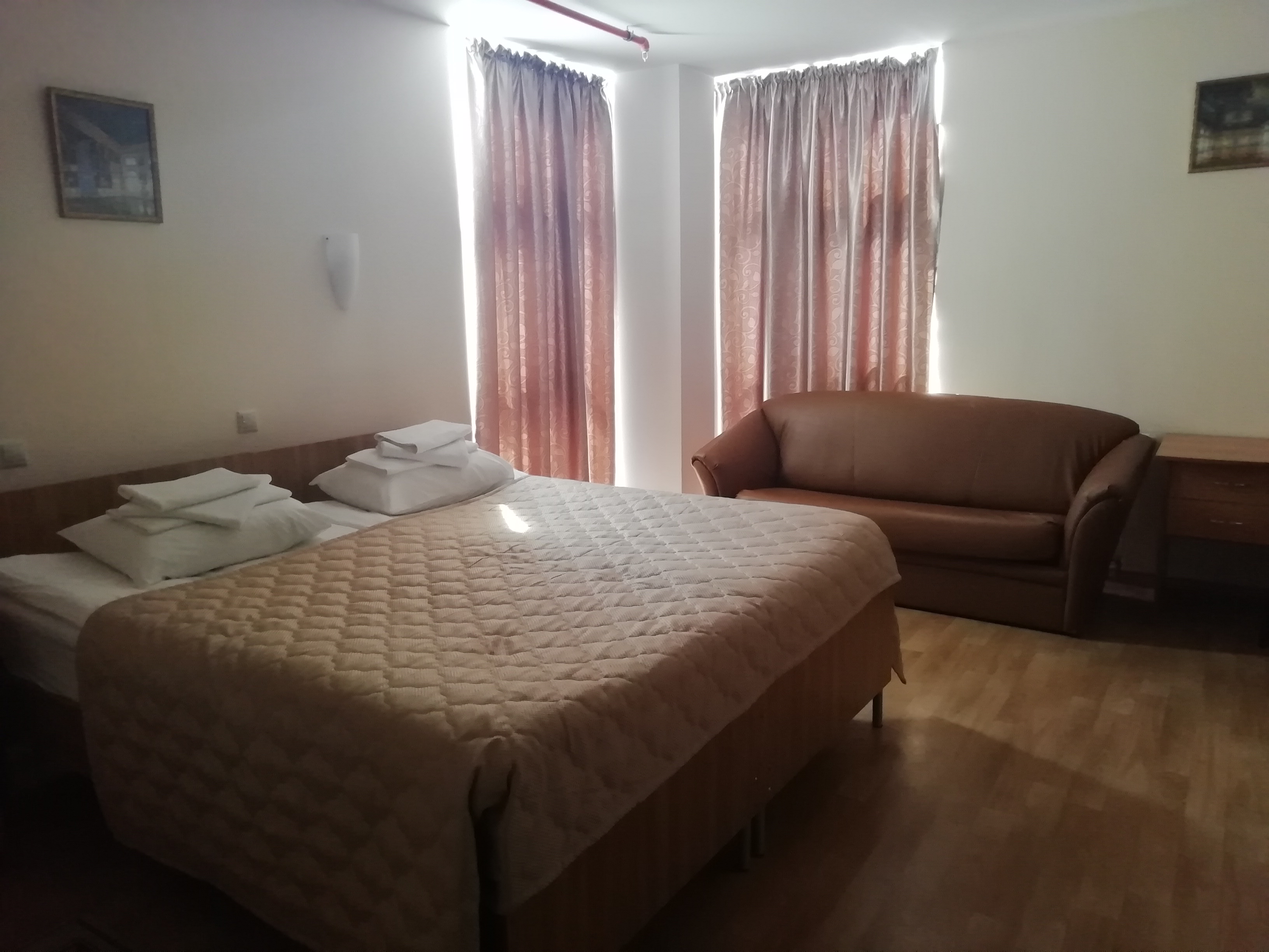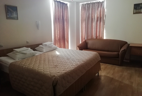 В номере: вешалка, зеркало, кровати односпальные /одна двуспальная кровать, набор мягкой мебели, прикроватные тумбочки, стол, столик журнальный, стул, шкаф, кондиционер, мини-холодильник, телевизор, телефон