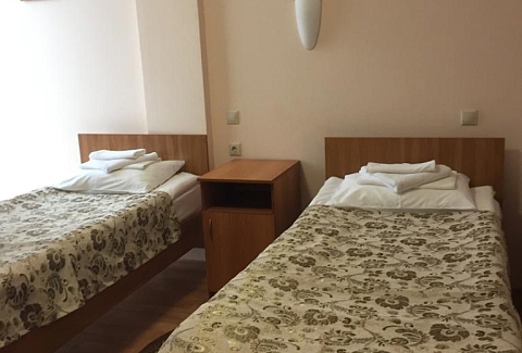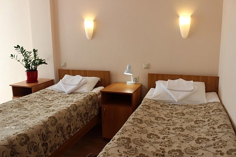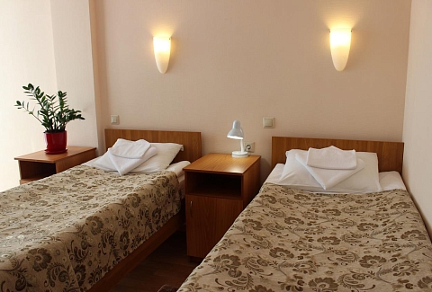 В номере: вешалка, зеркало, кровати односпальные /одна двуспальная кровать, прикроватные тумбочки, стол, стул, шкаф, кондиционер, мини-холодильник, телевизор, телефон