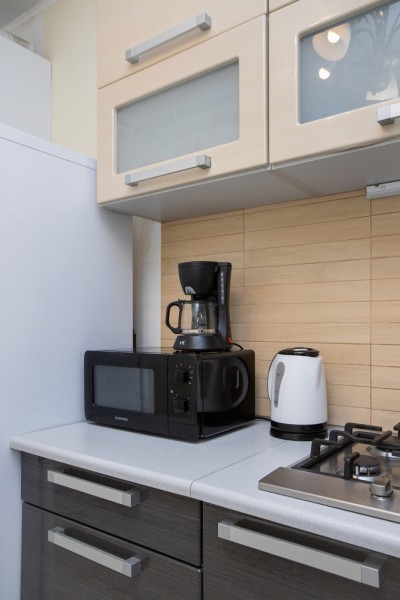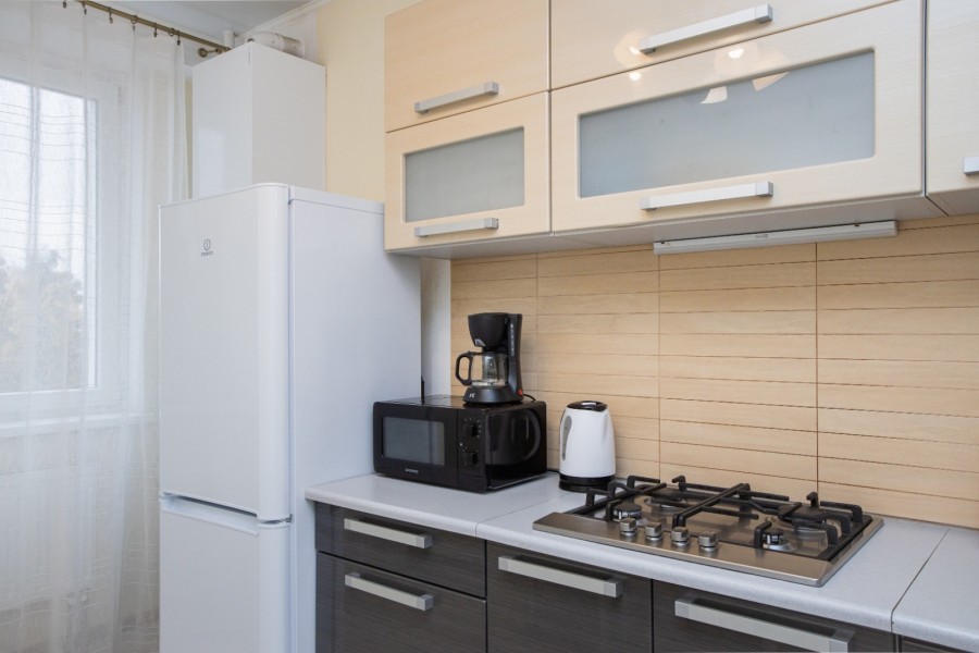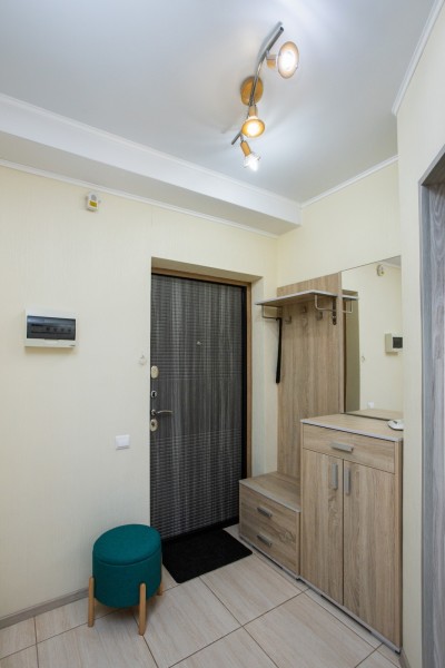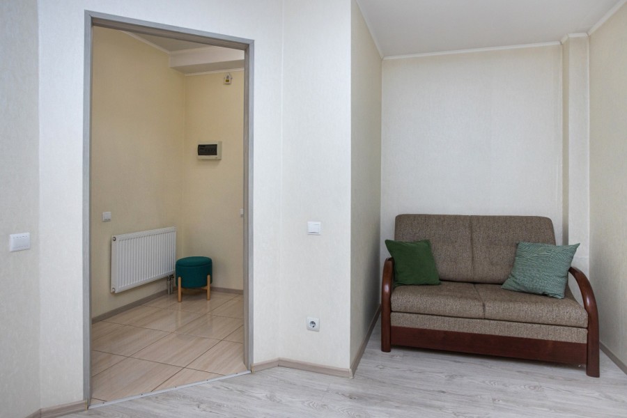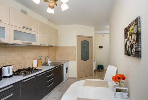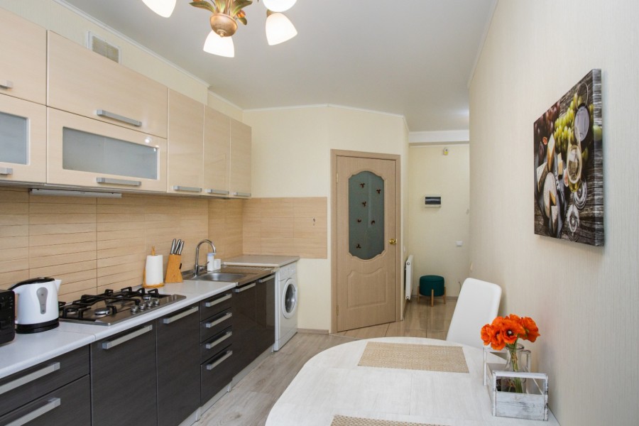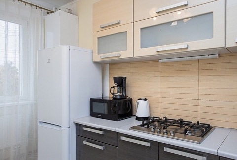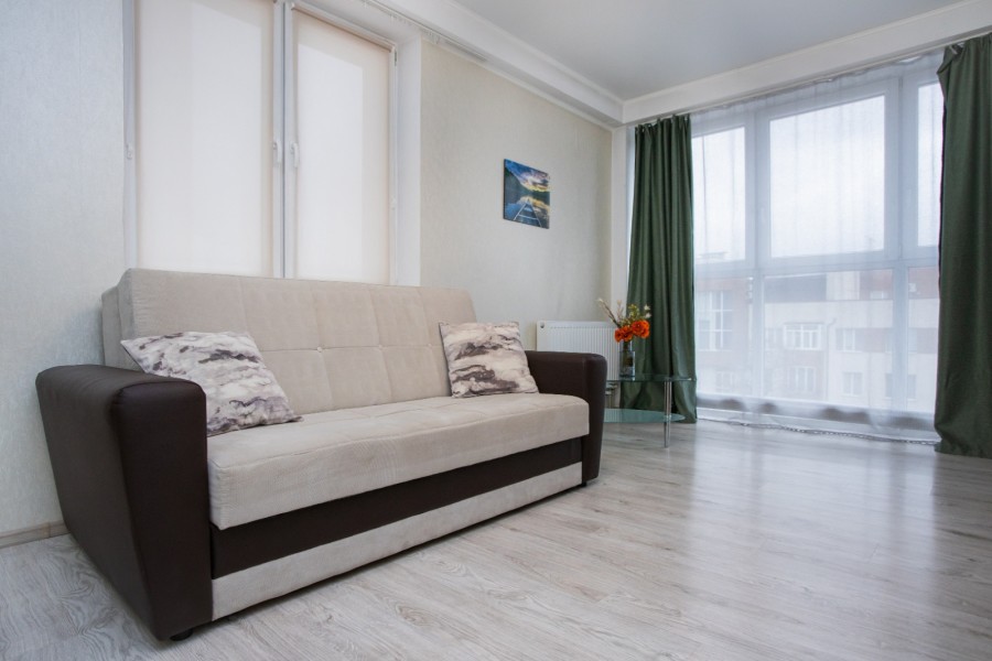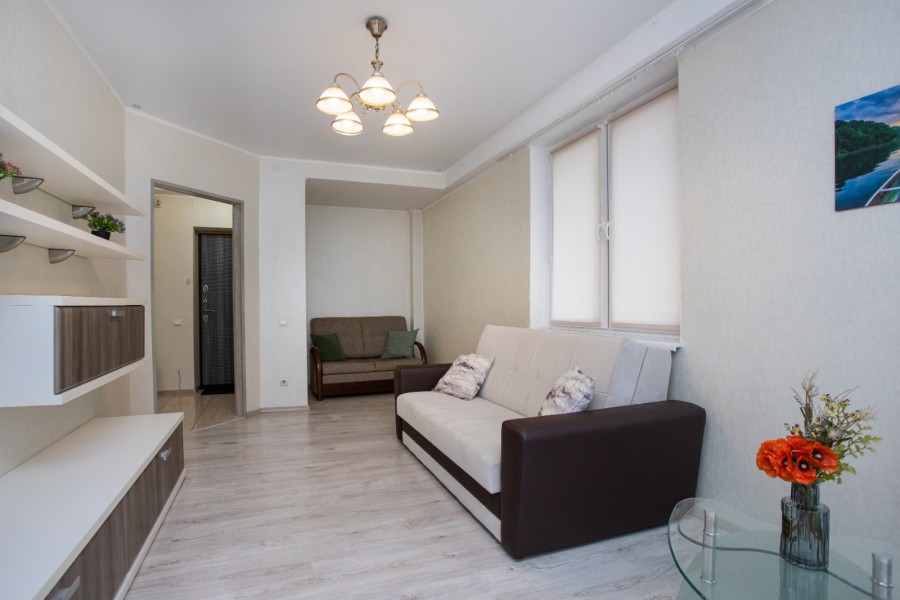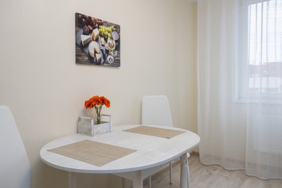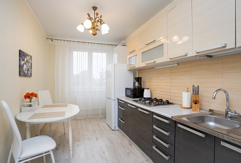 Апартаменты расположились в 10-этажном доме с лифтом. Интерьер комнат выполнен в светлых оттенках, они оснащены всем необходимым для комфортного проживания. В спальне предусмотрены раскладные диваны для сна. Для хранения личных вещей и одежды установлен шкаф. Санузел с ванной, туалетом и раковиной. Гостям предоставляются мягкие полотенца, туалетные принадлежности. Также к услугам гостей телевизор и высокоскоростной интернет. На кухне для самостоятельного приготовления еды установлены плита, микроволновая печь, электрический чайник, духовой шкаф, есть посуда, столовые приборы, стиральная машина. Для маленьких постояльцев установлен манеж. Личный транспорт можно оставить на парковке возле дома.