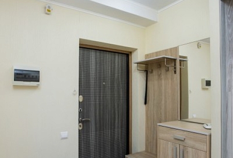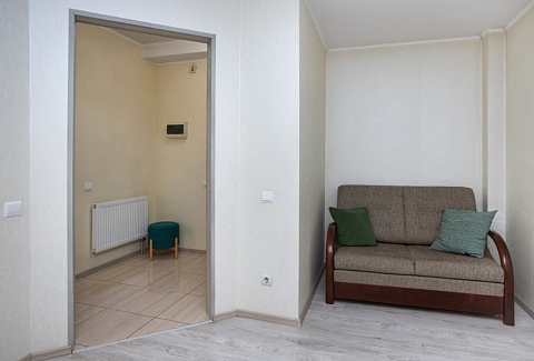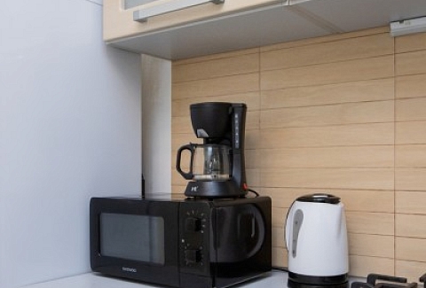 В номере: диван, диван раскладной, зеркало, комод, кухонная мебель, стол, стулья, шкаф, кофемашина, микроволновая печь, набор посуды, плита электрическая, телевизор ЖК, холодильник, электрочайник