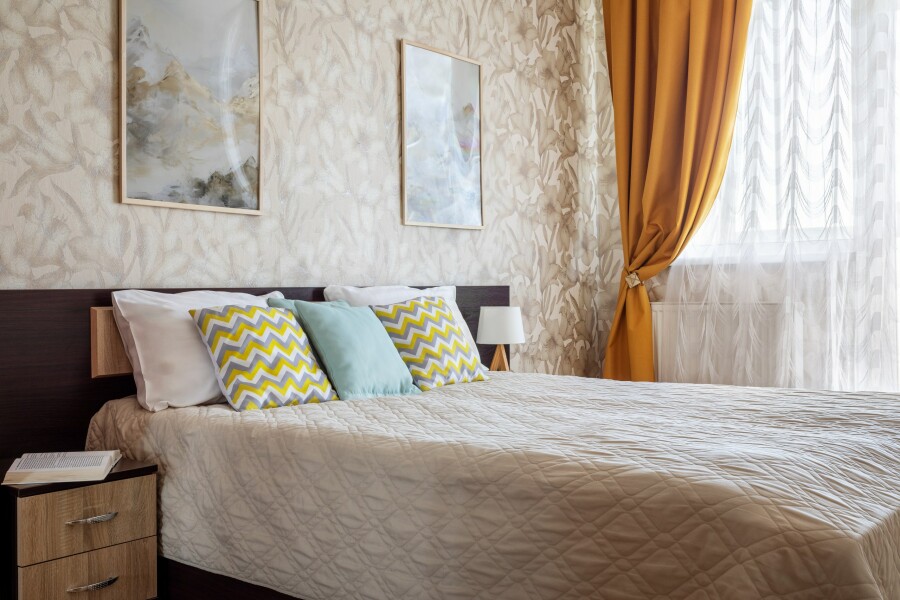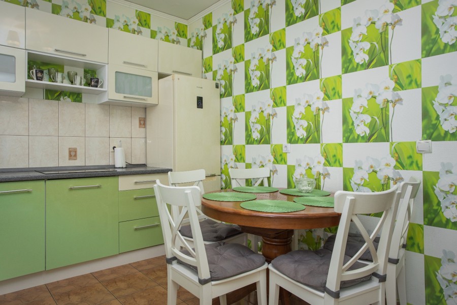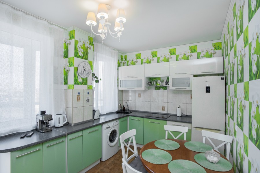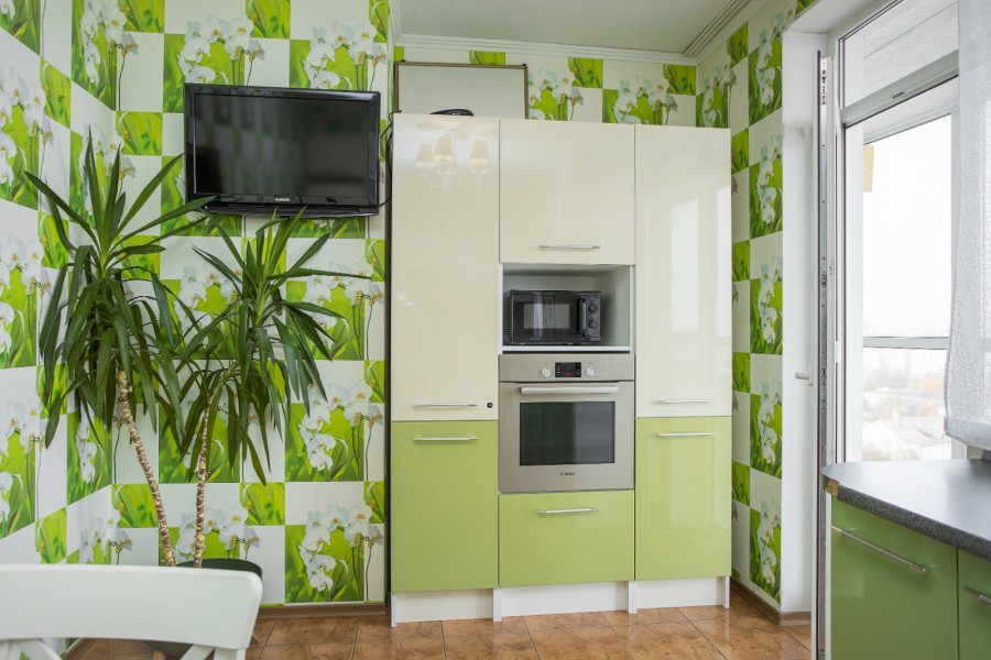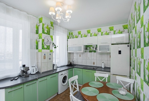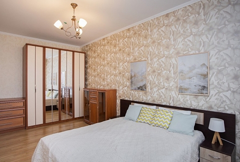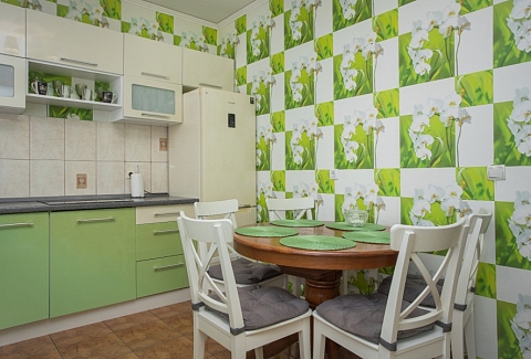 В номере: диван раскладной, зеркало, комод, кровать двуспальная, кухонная мебель, прикроватные тумбочки, стол, стулья, шкаф, микроволновая печь, набор посуды, плита электрическая, стиральная машина, телевизор ЖК, холодильник, электрочайник