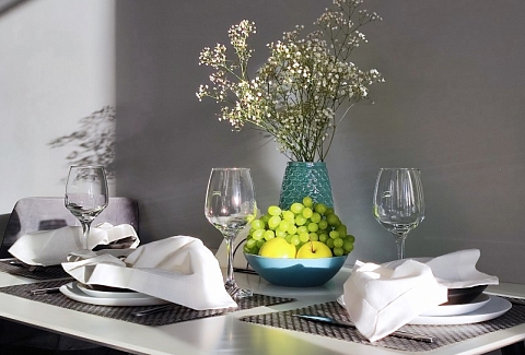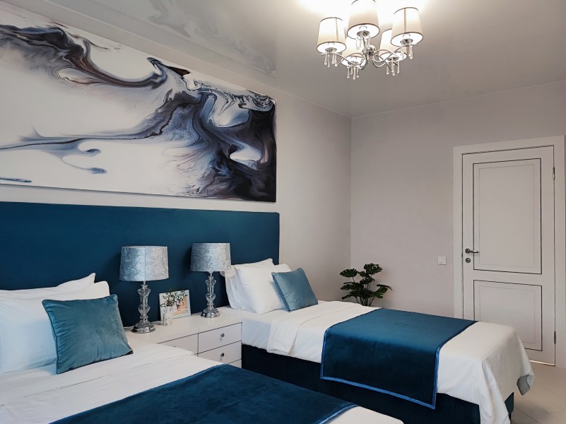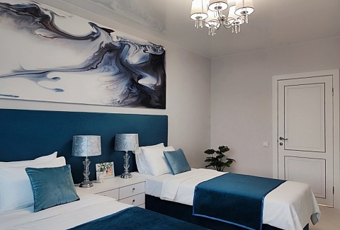 В номере: вешалка, диван, зеркало, кровати односпальные, кровать двуспальная, стол, стулья, шкаф, гладильная доска, духовой шкаф, кондиционер, кофемашина, микроволновая печь, набор посуды, плита газовая, посудомоечная машина, стиральная машина, сушилка для белья, телевизор ЖК, утюг, холодильник, чайный набор посуды, электрочайник