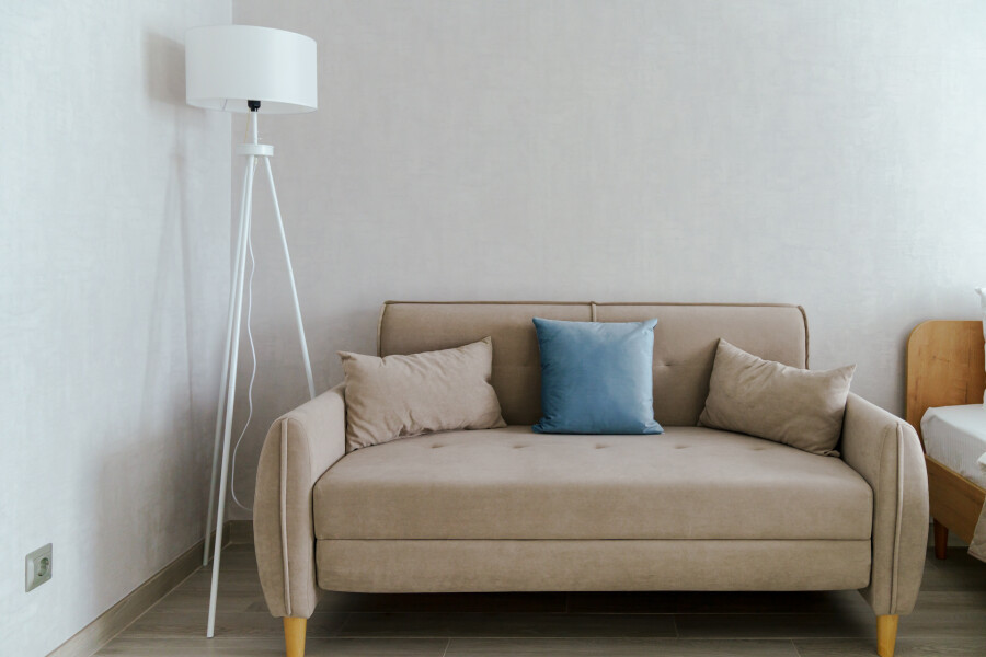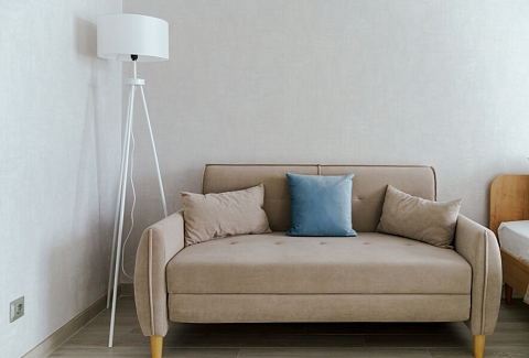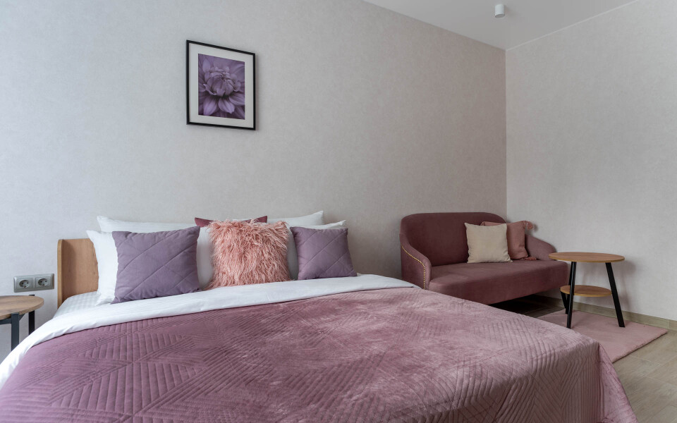 В номере: вешалка, диван, зеркало, кровать двуспальная, прикроватные тумбочки, стол, стулья, шкаф, гладильная доска, микроволновая печь, набор посуды, плита электрическая, стиральная машина, телевизор, утюг, холодильник, электрочайник