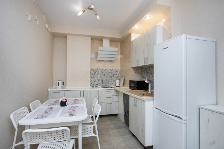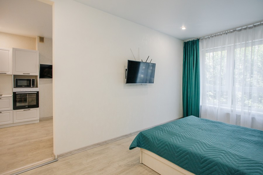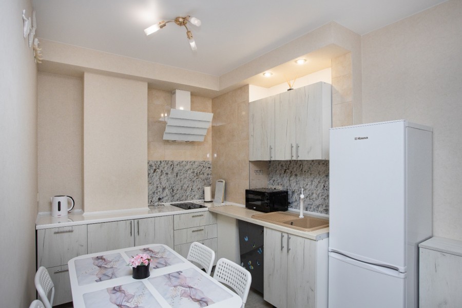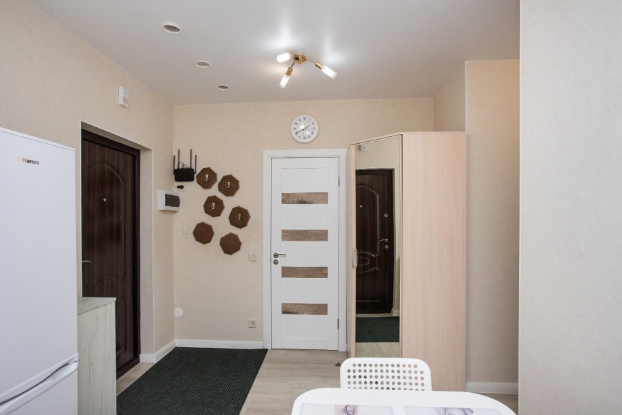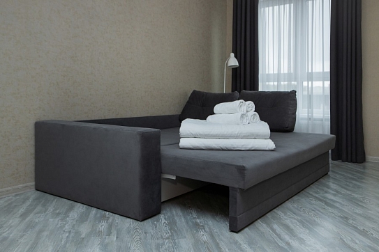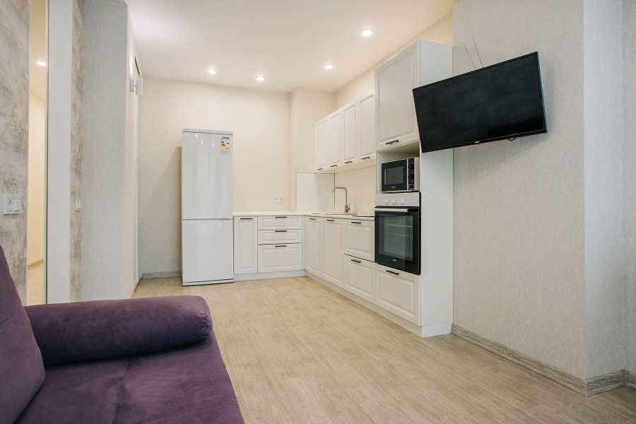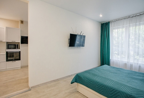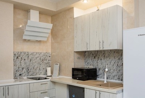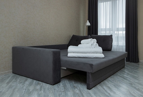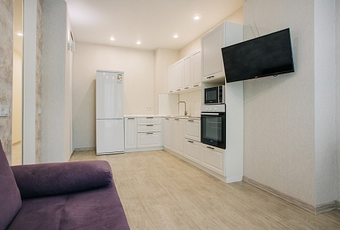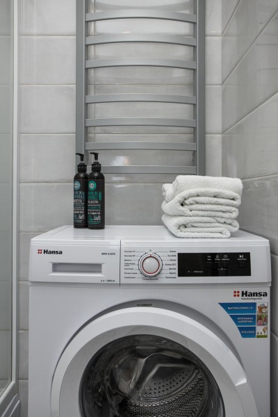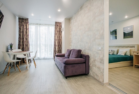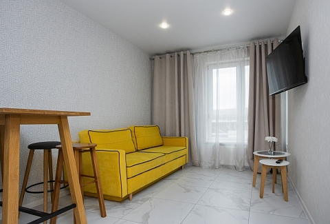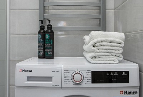 В номере: диван раскладной, зеркало, кухонная мебель, стол, стулья, тумба под телевизор, шкаф, кофемашина, микроволновая печь, плита электрическая, стиральная машина, телевизор ЖК, холодильник, электрочайник
