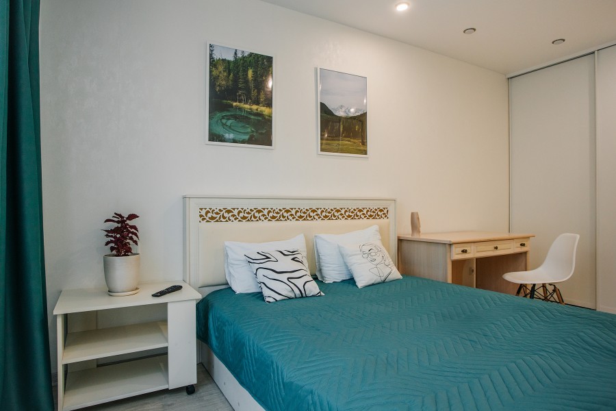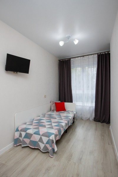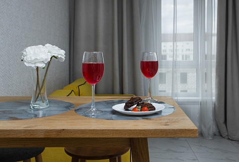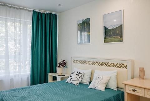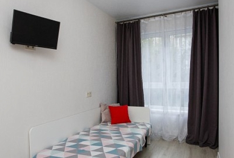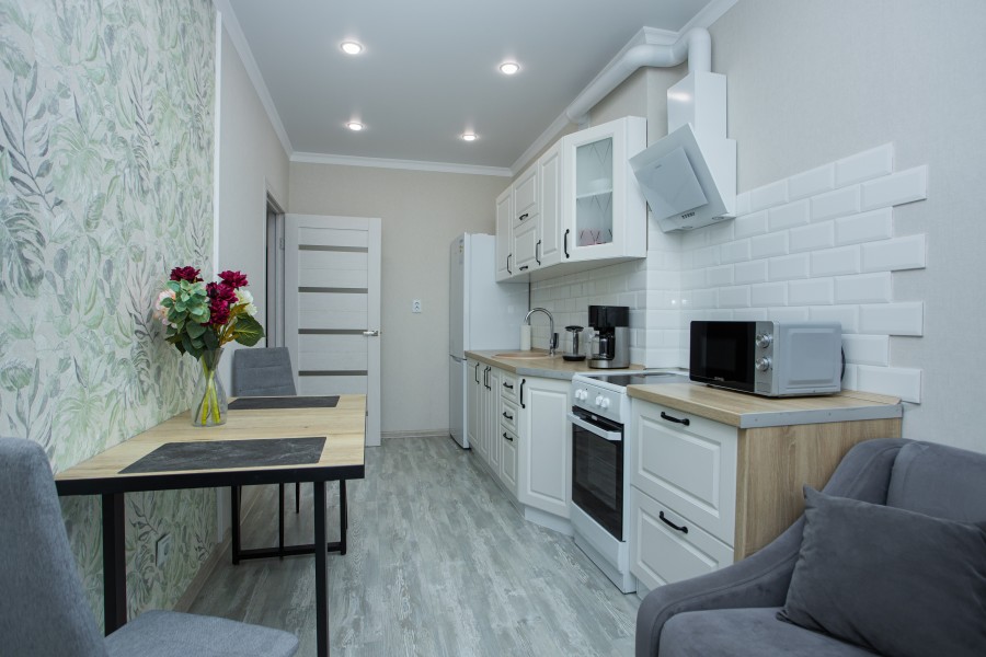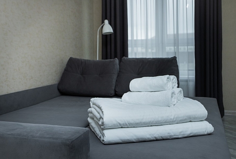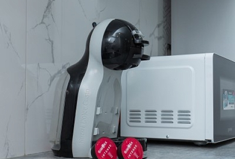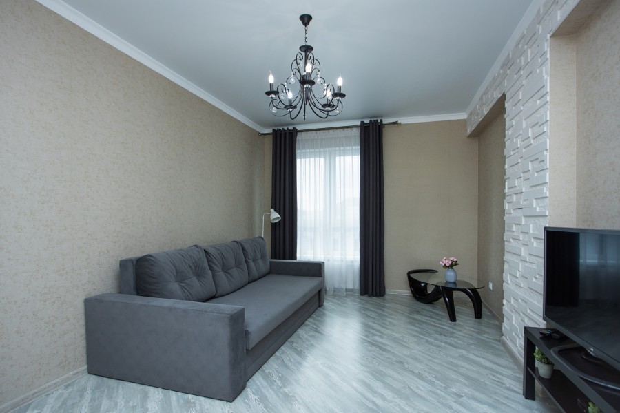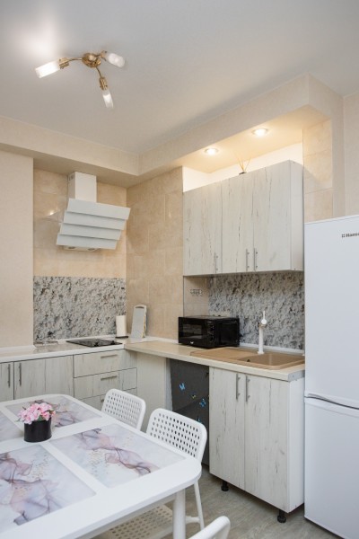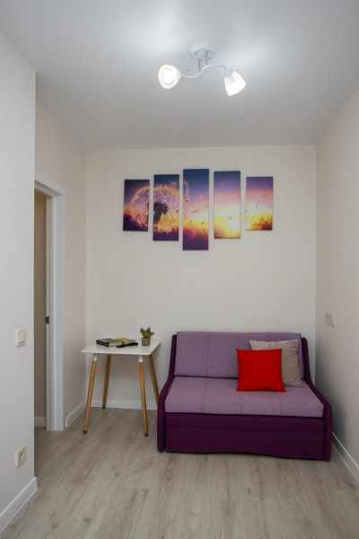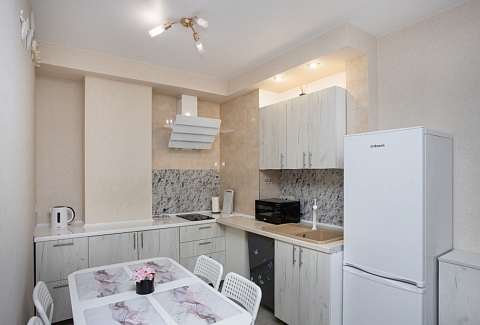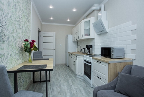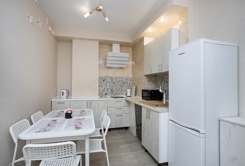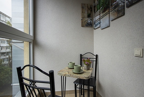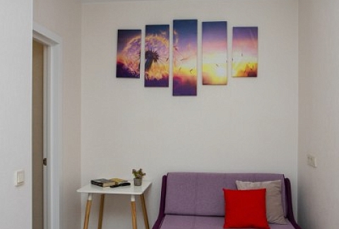 В номере: диван раскладной, зеркало, кухонная мебель, стол, стулья, тумба под телевизор, шкаф, кофемашина, микроволновая печь, плита электрическая, стиральная машина, телевизор ЖК, холодильник, электрочайник