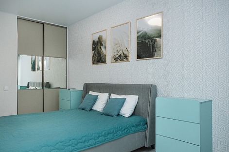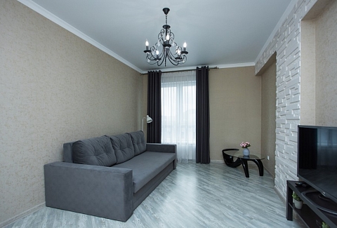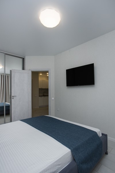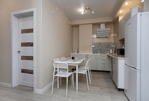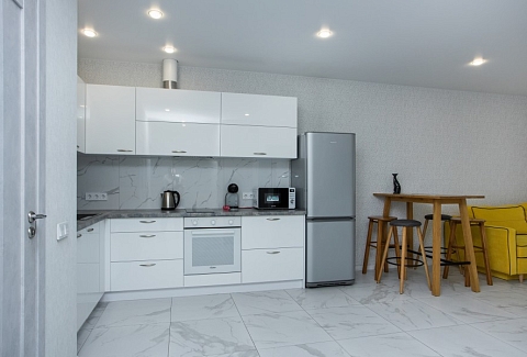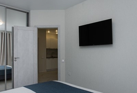 В номере: диван, зеркало, комод, кровать двуспальная, кухонная мебель, стол, стулья, шкаф, кондиционер, кофемашина, микроволновая печь, набор посуды, плита электрическая, посудомоечная машина, стиральная машина, телевизор ЖК, холодильник, электрочайник