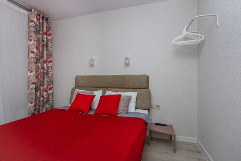 В номере: диван раскладной, зеркало, комод, прикроватные тумбочки, стол, стулья, шкаф, кондиционер, кофемашина, микроволновая печь, набор посуды, плита электрическая, стиральная машина, телевизор ЖК, холодильник, электрочайник