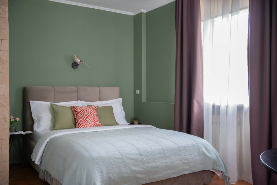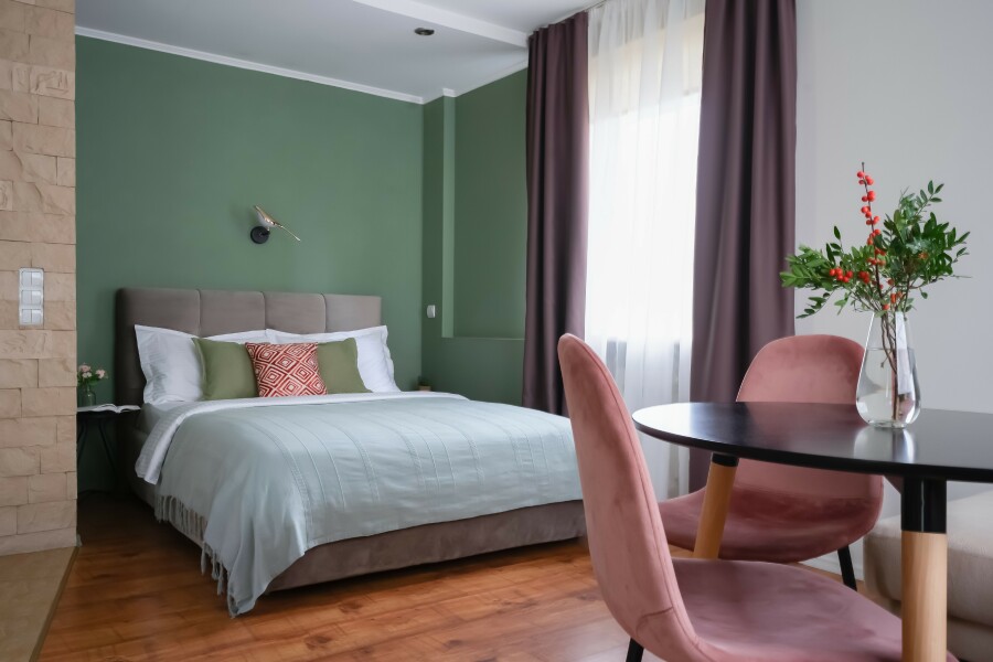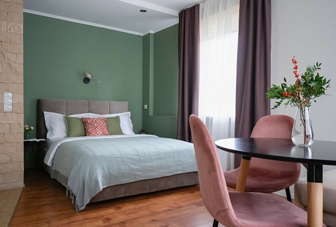 В номере: диван, зеркало, кровать двуспальная, прикроватные тумбочки, стол, стулья, шкаф, гладильная доска, микроволновая печь, набор посуды, плита газовая, стиральная машина, телевизор ЖК, утюг, холодильник, чайный набор посуды, электрочайник