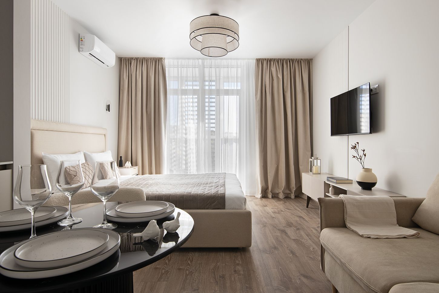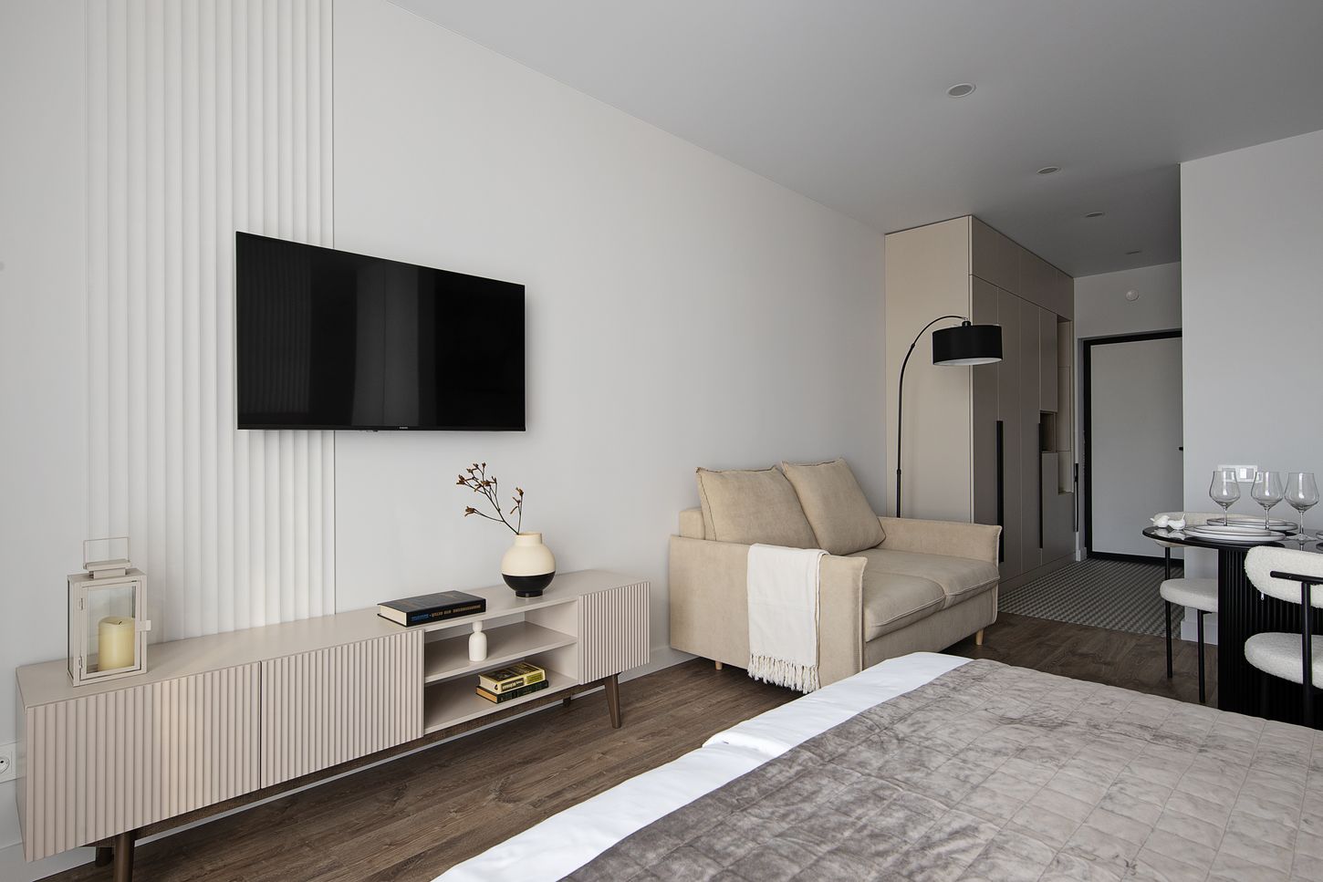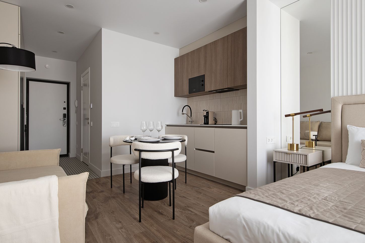 Студия «Дюна» расположилась в самом сердце города, в нескольких шагах от тихой глади Верхнего озера. Это пространство, созданное для тех, кто ценит и динамику городской жизни, и умиротворение природы. Из окон открывается путь к живописной набережной, музею марципана и тенистому парку, где так приятно провести время на прогулке.Внутри царит атмосфера современного минимализма и практичного комфорта.