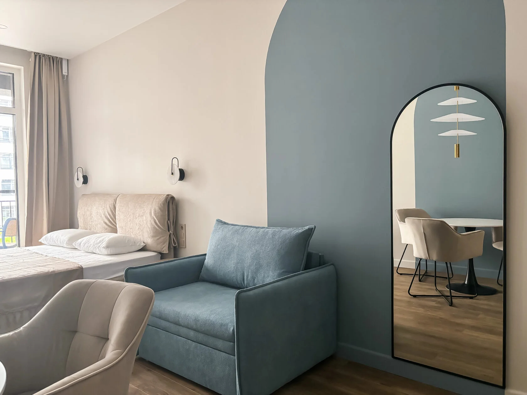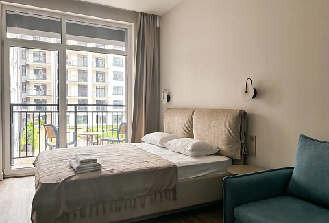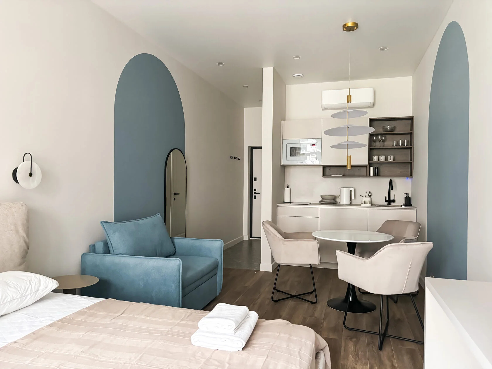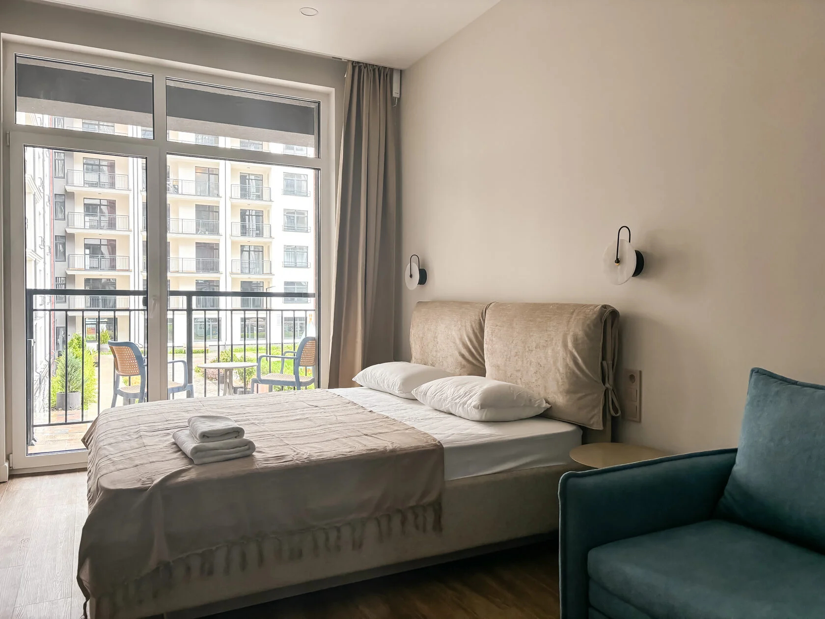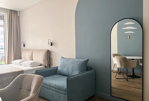 Апартаменты Pavlov Европа А площадью 38 кв.м, вместимость до 4-х гостей.Стильные апартаменты идеально подходят для туристов и деловых путешественников, предлагая всё необходимое для комфортного проживания. В спальне есть удобная двуспальная кровать, а в кухне-гостиной - раскладной диван, обеспечивающий дополнительные спальные места и удобный отдых.Апартаменты оборудованы современной душевой кабиной, стиральной машиной, микроволновкой, плитой и фильтром для воды. Просторный балкон предоставляет возможность насладиться свежим воздухом и красивыми видами.