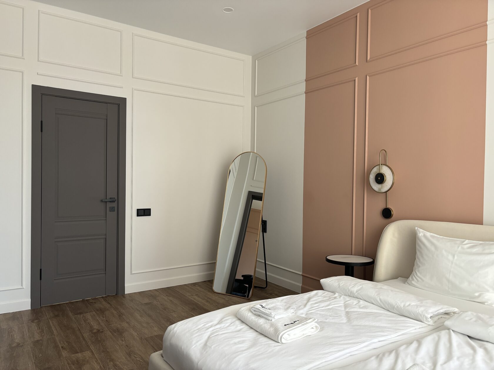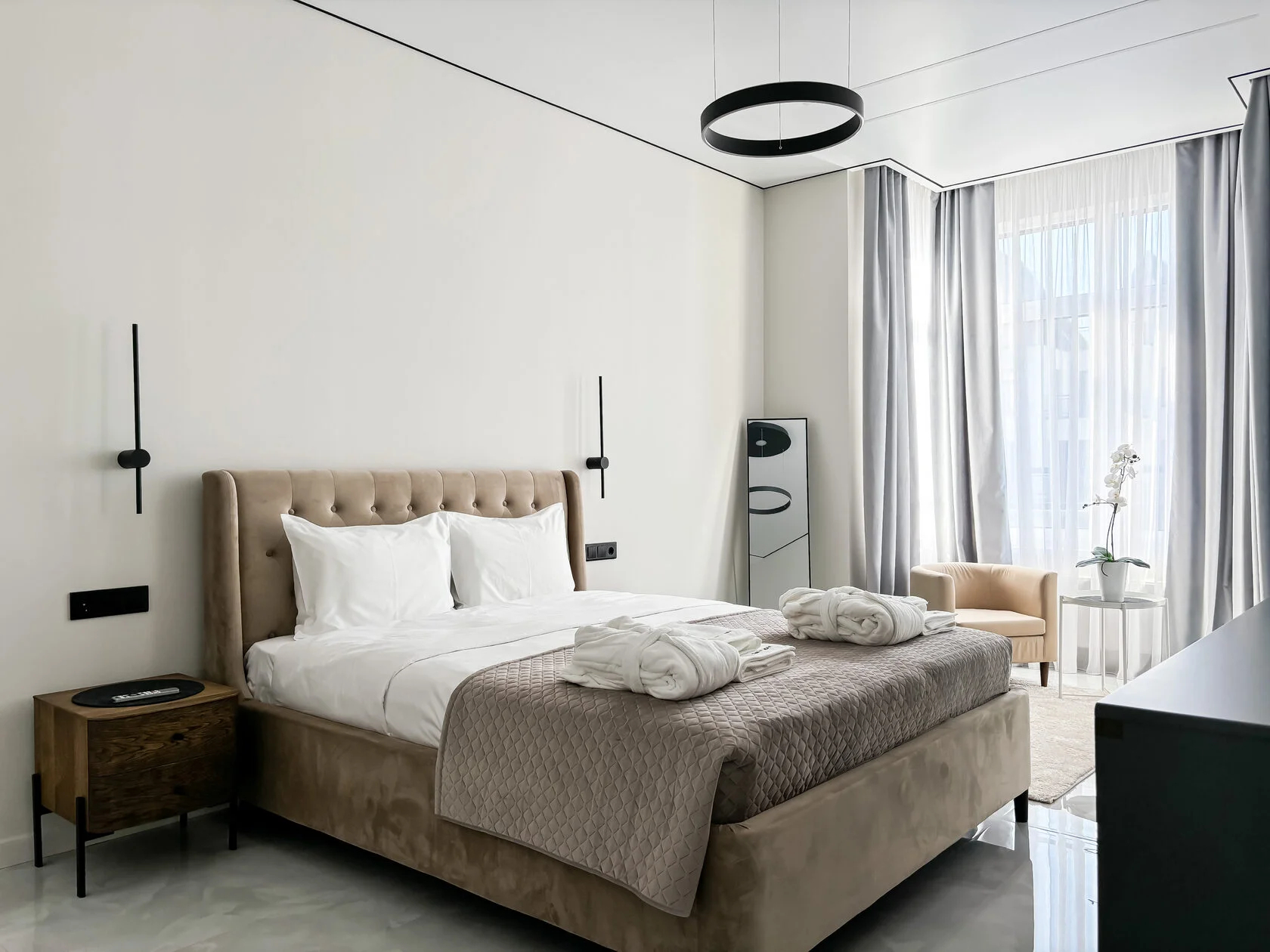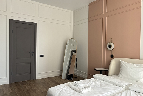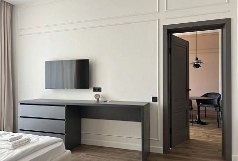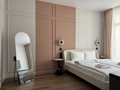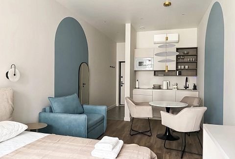 В номере: вешалка, зеркало, кресла, кровать двуспальная, прикроватные тумбочки, стол, стулья, шкаф, гладильная доска, духовой шкаф, кондиционер, микроволновая печь, набор посуды, плита электрическая, стиральная машина, сушилка для белья, телевизор ЖК, умная колонка, утюг, холодильник, чайный набор посуды, электрочайник
