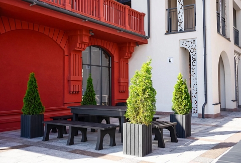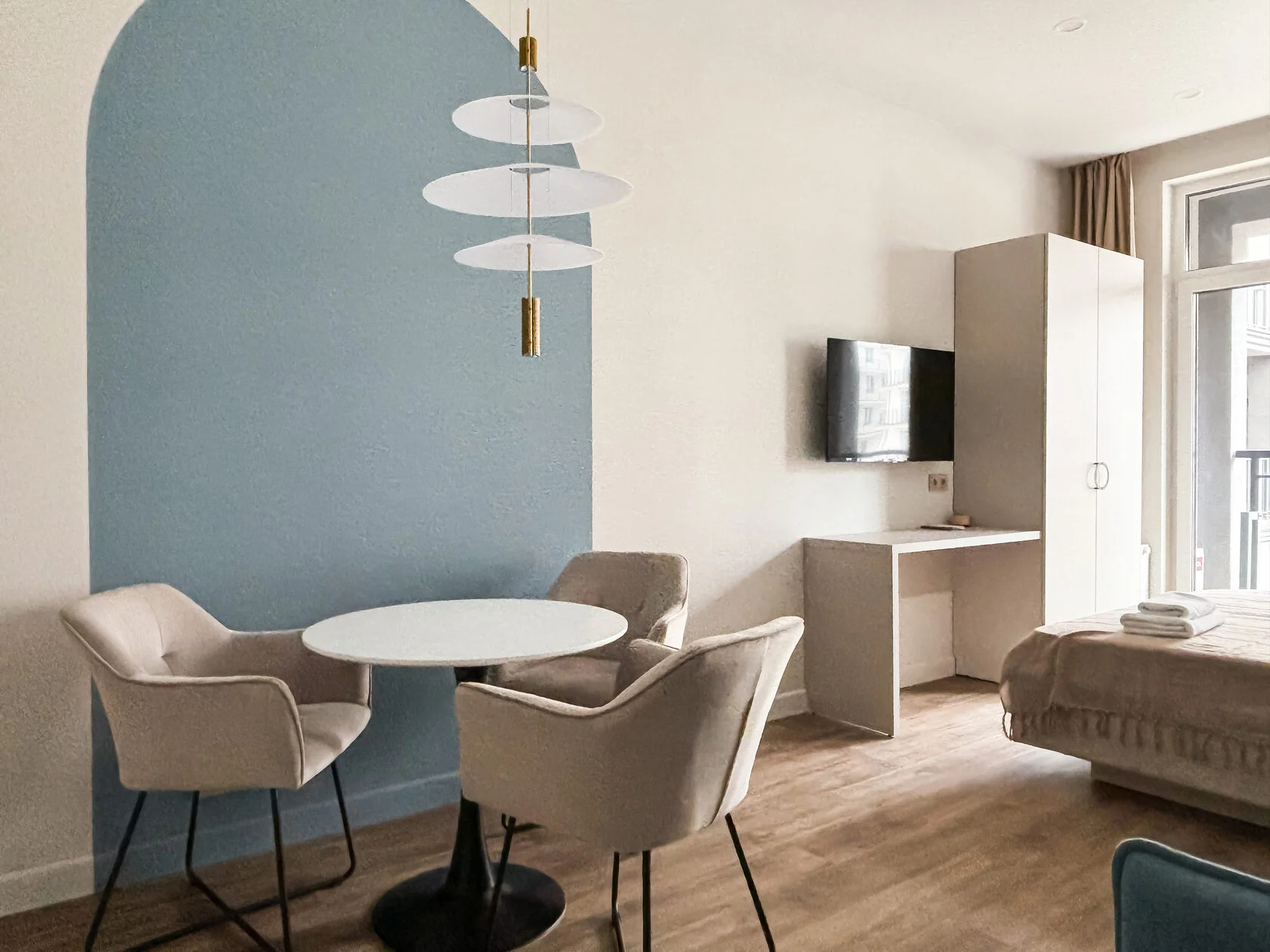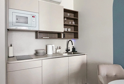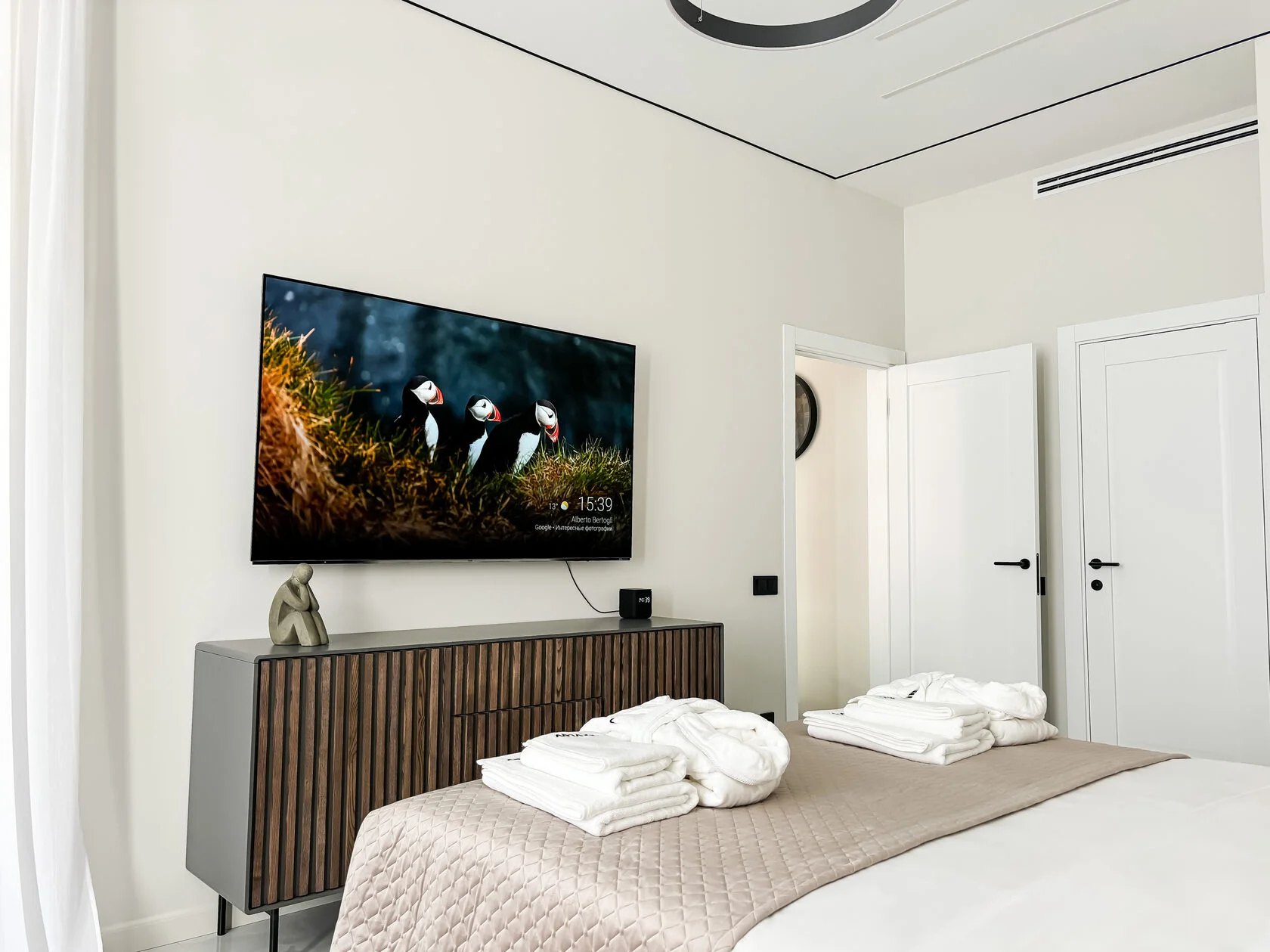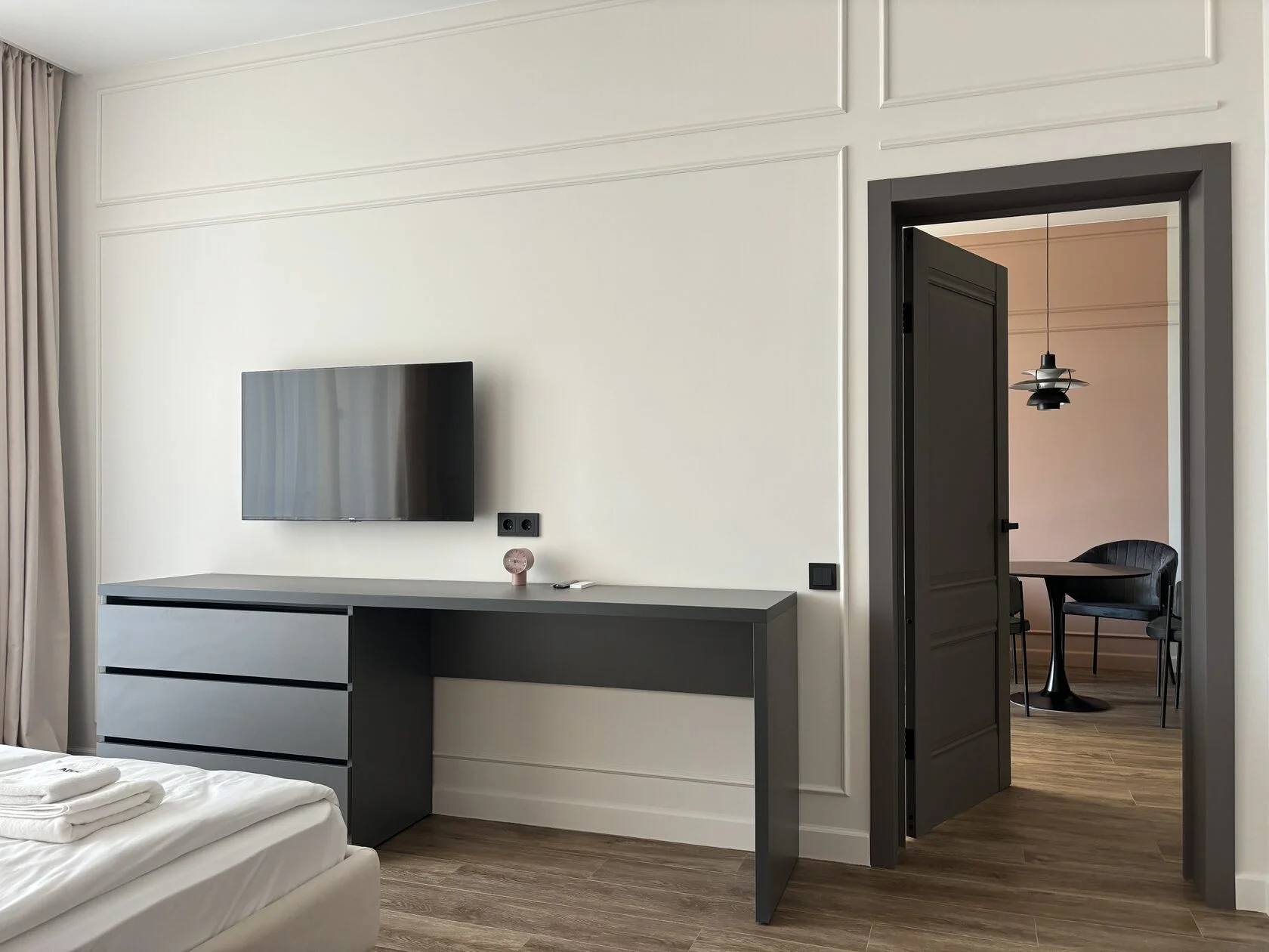 В номере: вешалка, зеркало, кресла, кровать двуспальная, прикроватные тумбочки, стол, стулья, шкаф, гладильная доска, духовой шкаф, кондиционер, микроволновая печь, набор посуды, плита электрическая, стиральная машина, сушилка для белья, телевизор ЖК, умная колонка, утюг, холодильник, чайный набор посуды, электрочайник