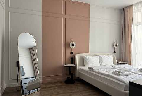 В номере: зеркало, кресло-кровать, кровать двуспальная, прикроватные столики, стол, стулья, шкаф, гладильная доска, кондиционер, микроволновая печь, мини-холодильник, набор посуды, плита электрическая, стиральная машина, сушилка для белья, телевизор ЖК, утюг, чайный набор посуды, электрочайник