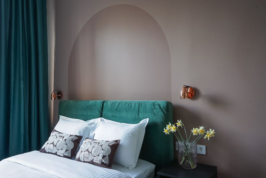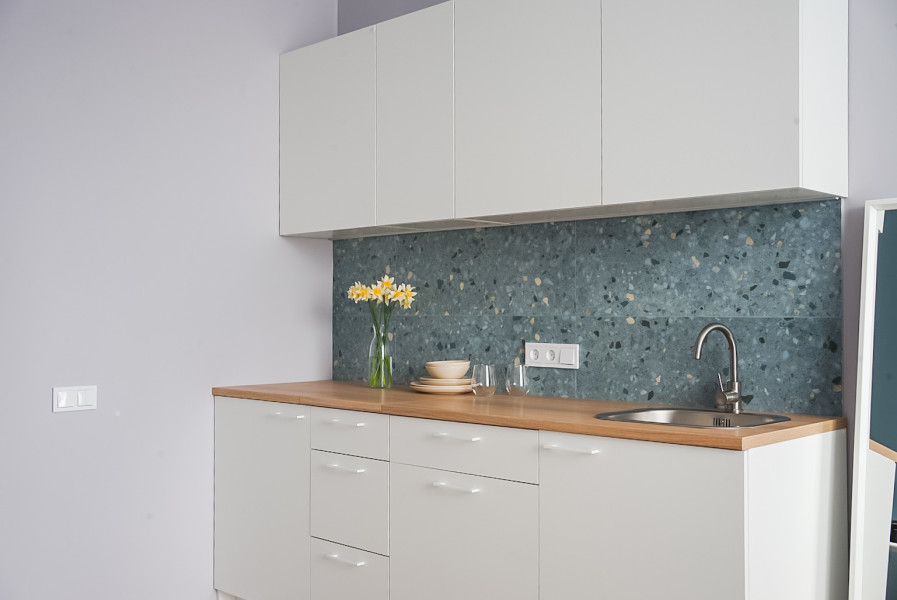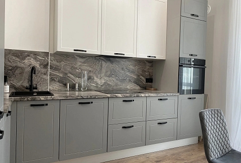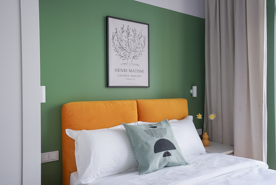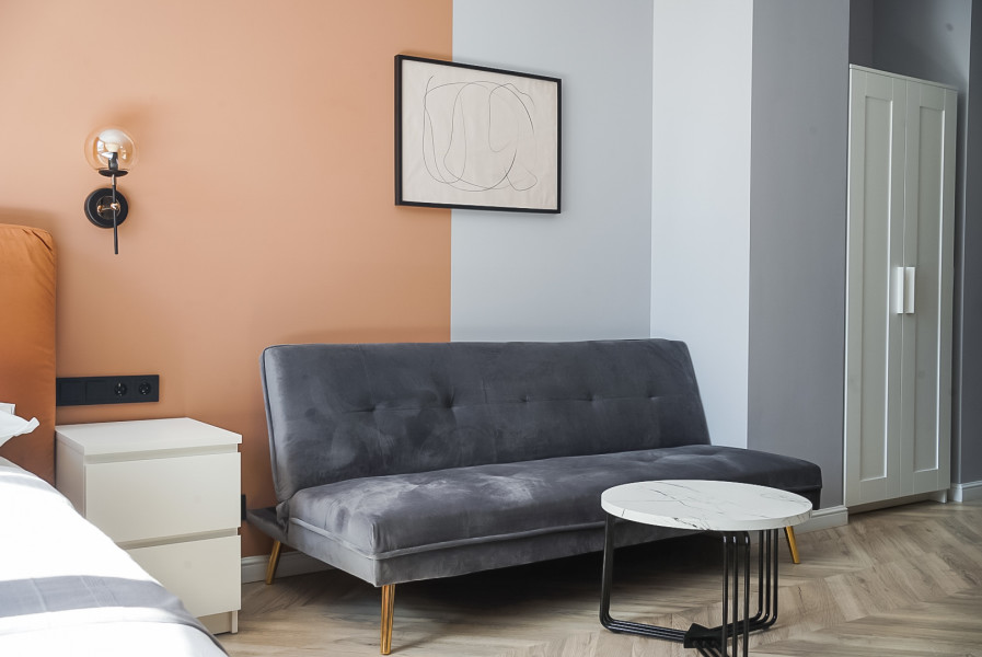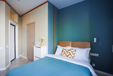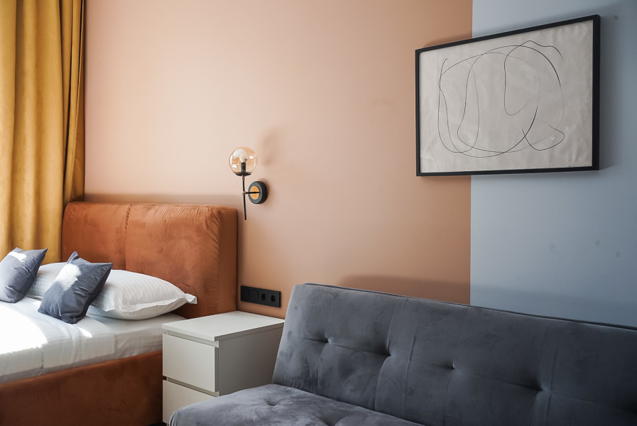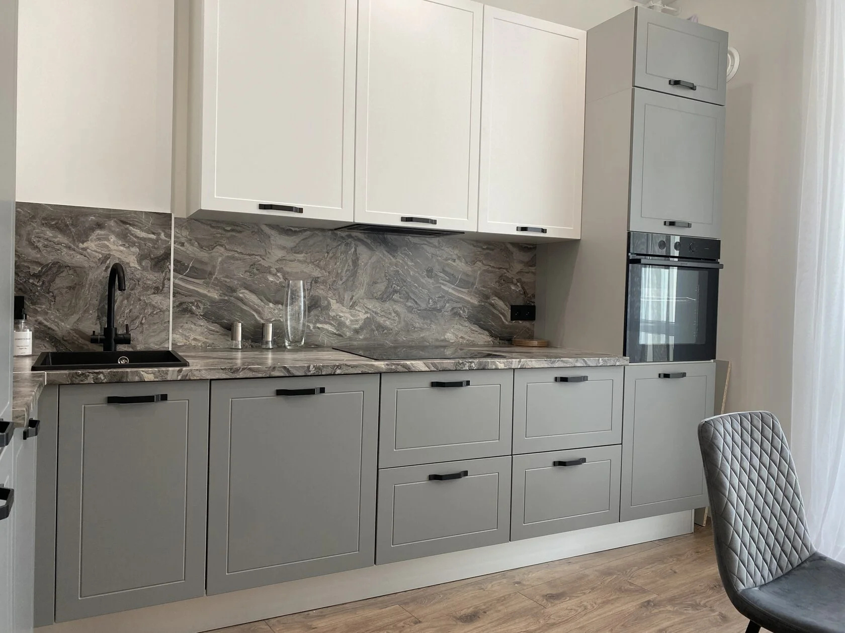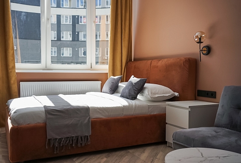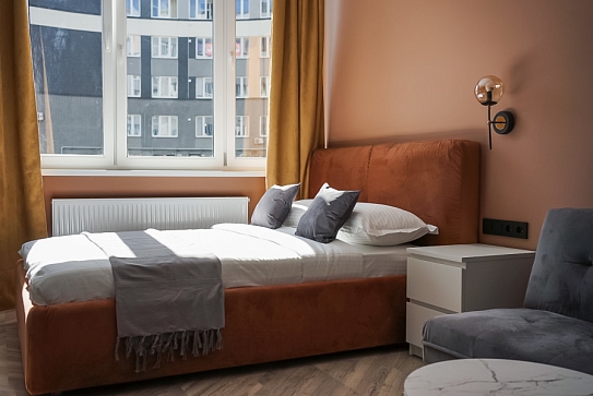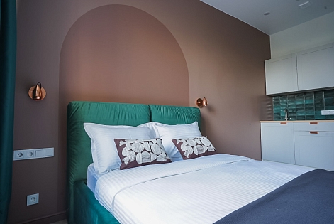 В шаговой доступности работают магазины]6 кафе. Расстояние до аэропорта составляет 23,5 километра.Апартаменты расположились в 8-этажном здании с лифтом. Комнаты оформлены в стильном и функциональном дизайне, где каждая деталь продумана для комфорта гостей. К услугам отдыхающих двуспальная кровать с удобным матрасом, белоснежное постельное белье и набор банных принадлежностей. В ванной комнате предусмотрены душ и фен. Кухня оборудована всей необходимой техникой и посудой для самостоятельного приготовления еды.Во дворе обустроена современная детская игровая площадка, фонтан.