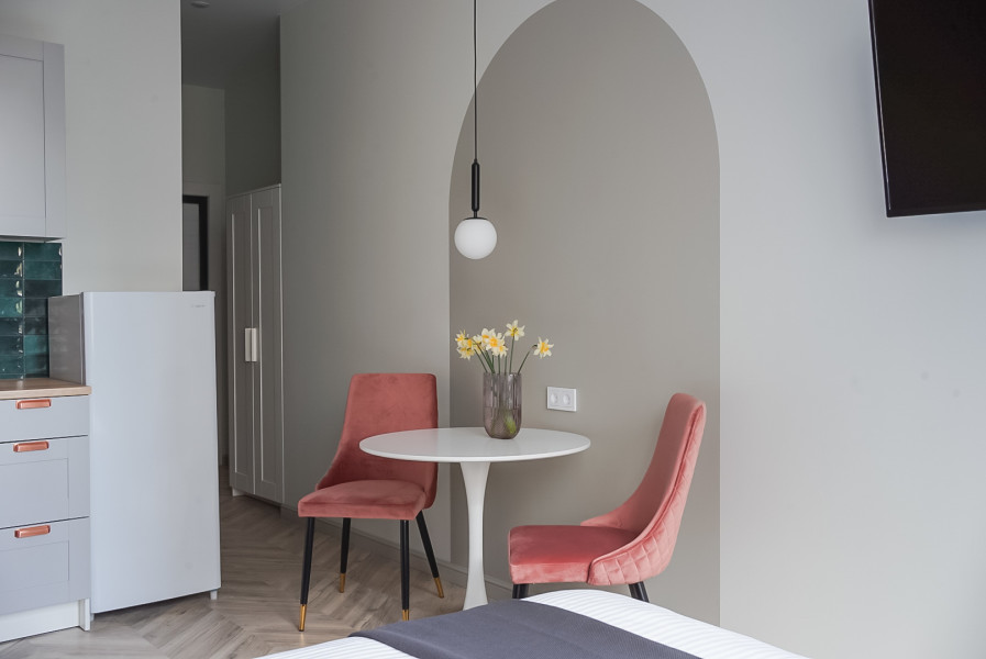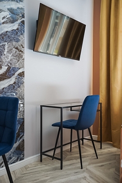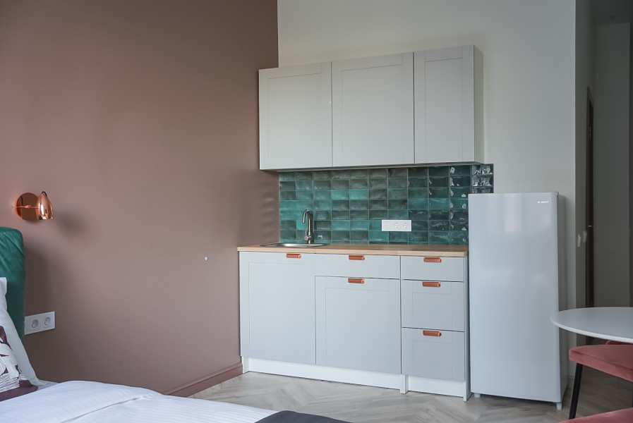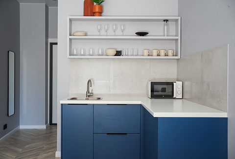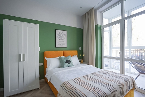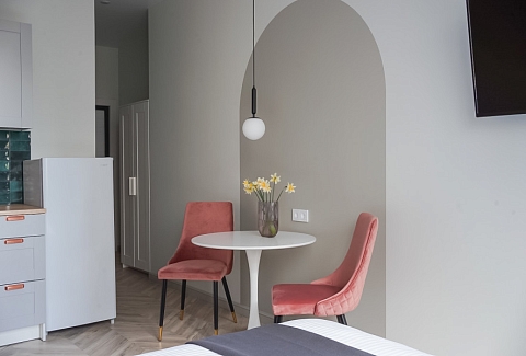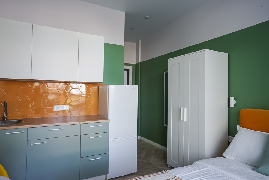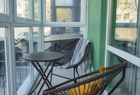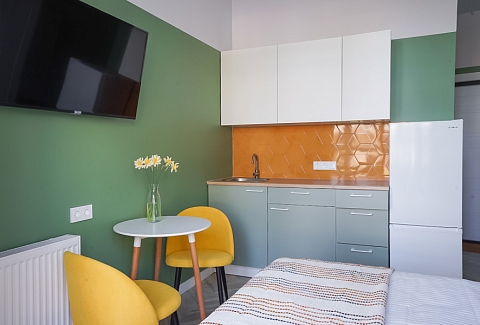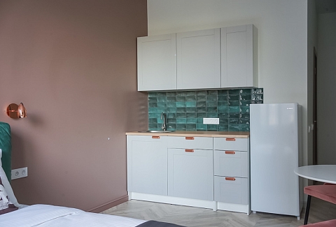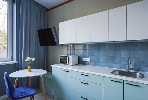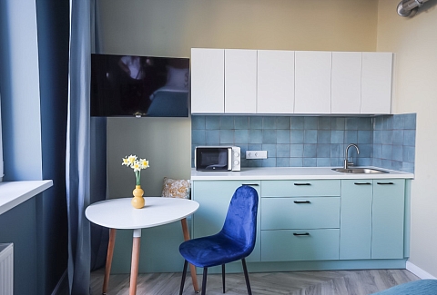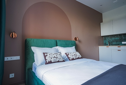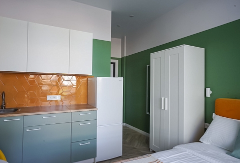 В номере: вешалка, зеркало, кровать двуспальная, кухонная мебель, стол, стулья, шкаф, кофемашина, микроволновая печь, набор посуды, плита электрическая, стиральная машина, телевизор ЖК, утюг, холодильник, электрочайник
