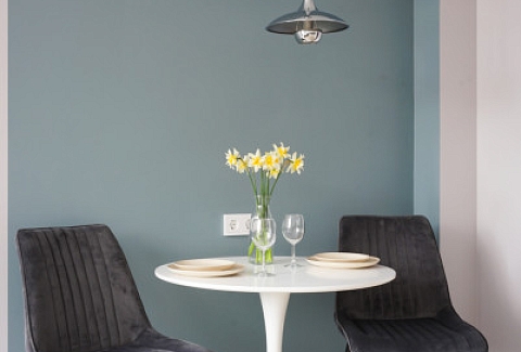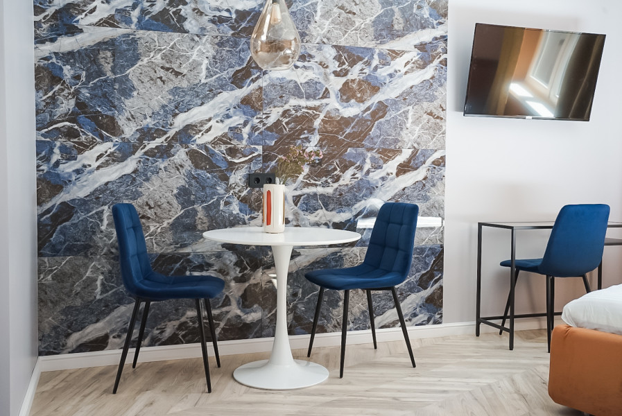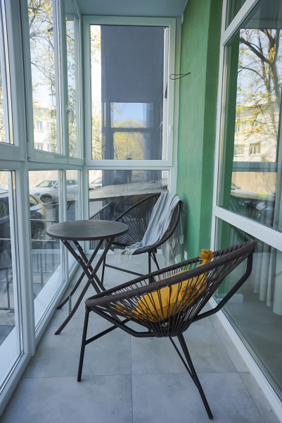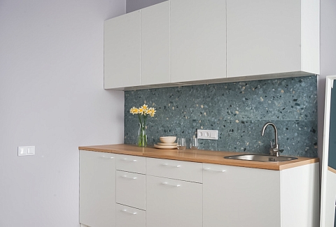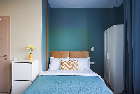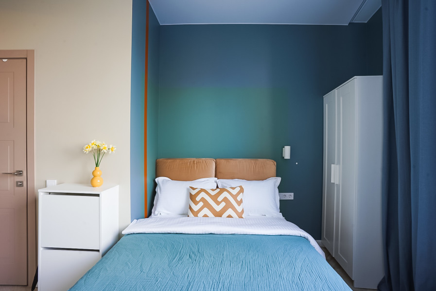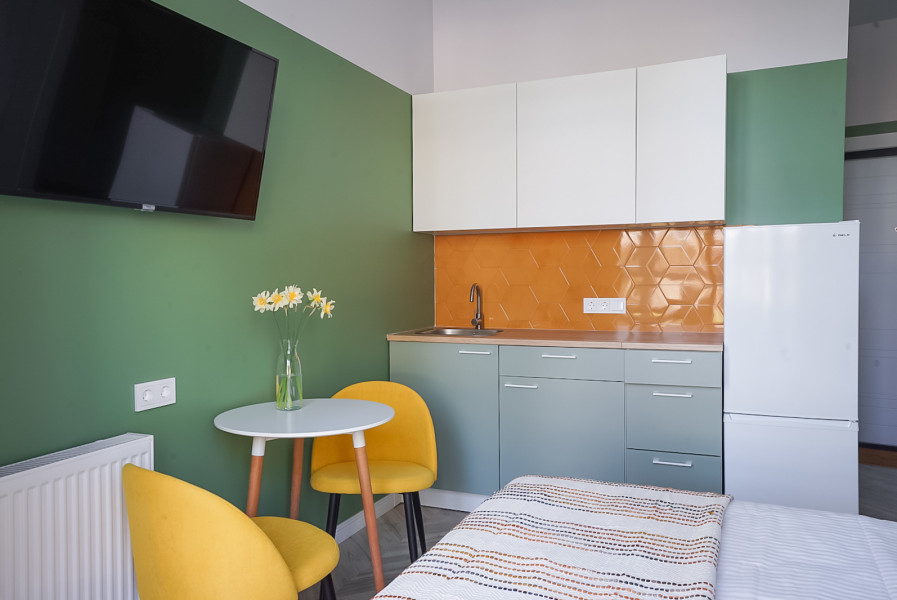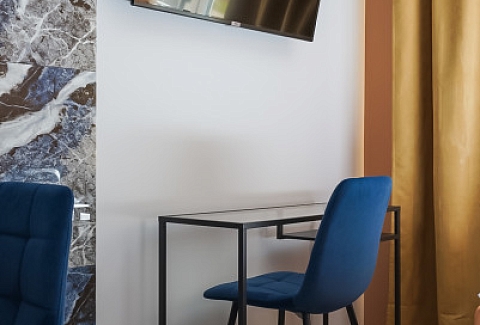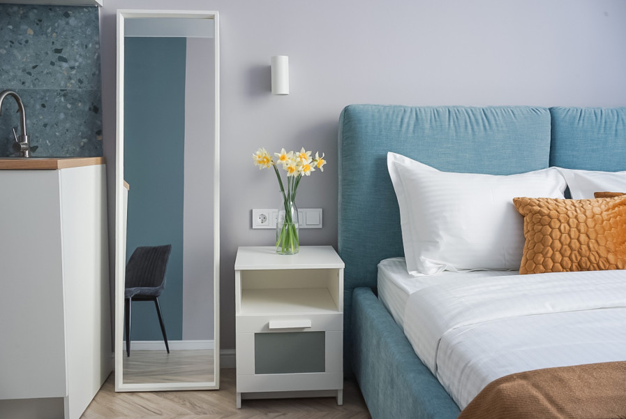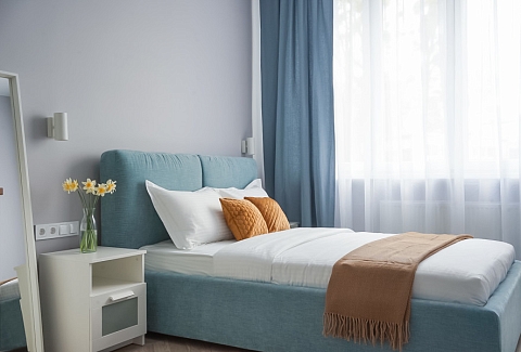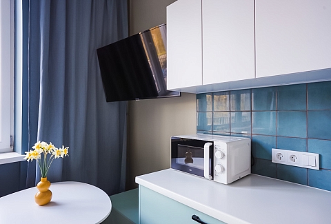 В номере: вешалка, зеркало, кровать двуспальная, кухонная мебель, стол, стулья, шкаф, кофемашина, микроволновая печь, набор посуды, плита электрическая, стиральная машина, телевизор ЖК, утюг, холодильник, электрочайник