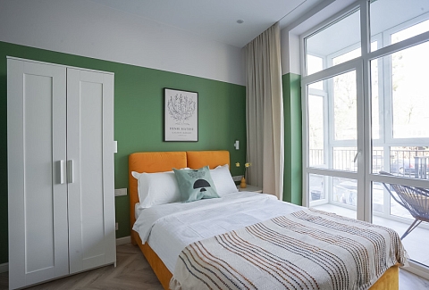 В номере: вешалка, диван раскладной, зеркало, кровать двуспальная, кухонная мебель, прикроватная тумбочка, стол, стулья, шкаф, кондиционер, кофемашина, микроволновая печь, набор посуды, плита электрическая, стиральная машина, телевизор ЖК, утюг, холодильник, электрочайник