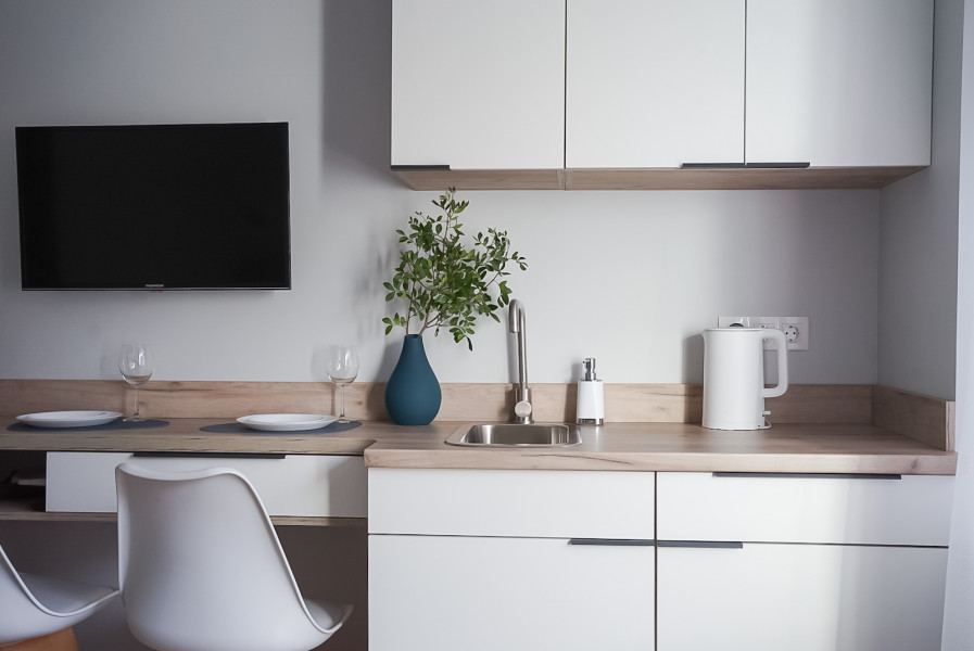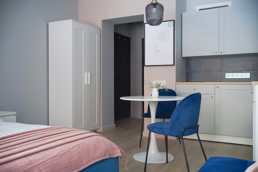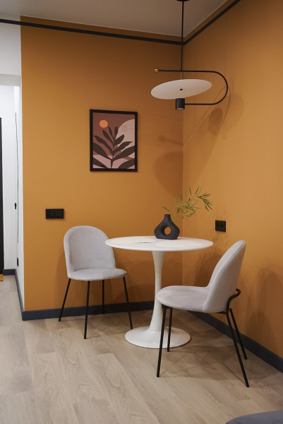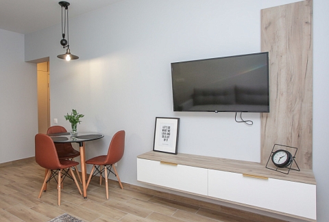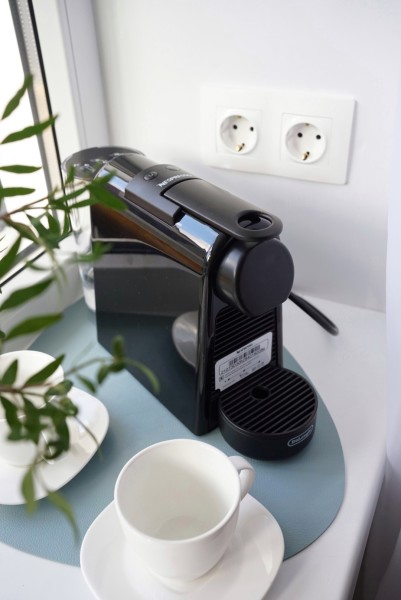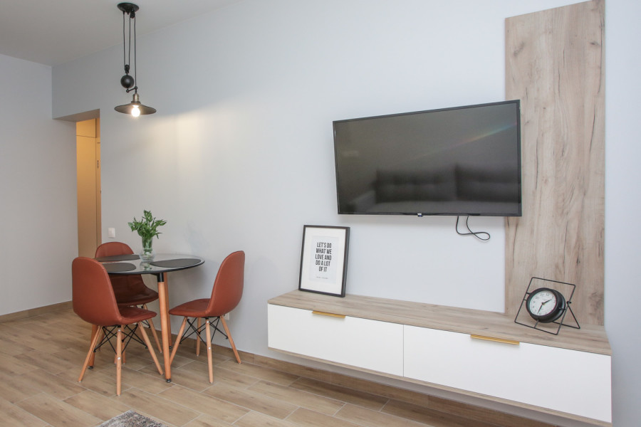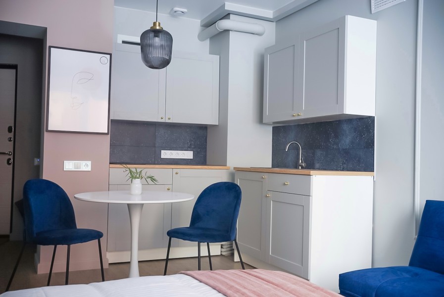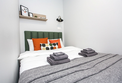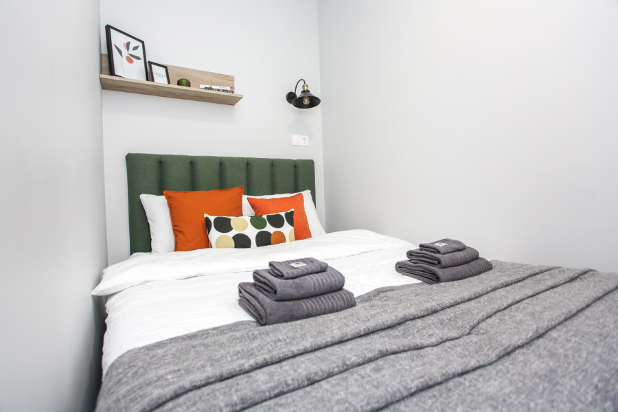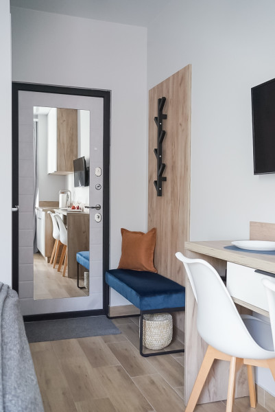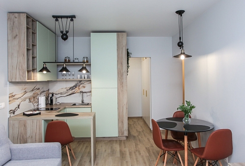 В оформлении использованы элементы минималистичного стиля, что в сочетании с удобной мебелью и современной техникой делает отдых особенно комфортным. В ванной есть полотенца и стиральная машина. Также к услугам гостей телевизор с плоским экраном, гладильные принадлежности, Wi-Fi. Мини-кухня оснащена плитой, холодильником, кофемашиной, микроволновой печью и необходимой мебелью. Личный транспорт можно оставить на парковке возле дома. Для маленьких постояльцев на свежем воздухе оборудована игровая площадка.