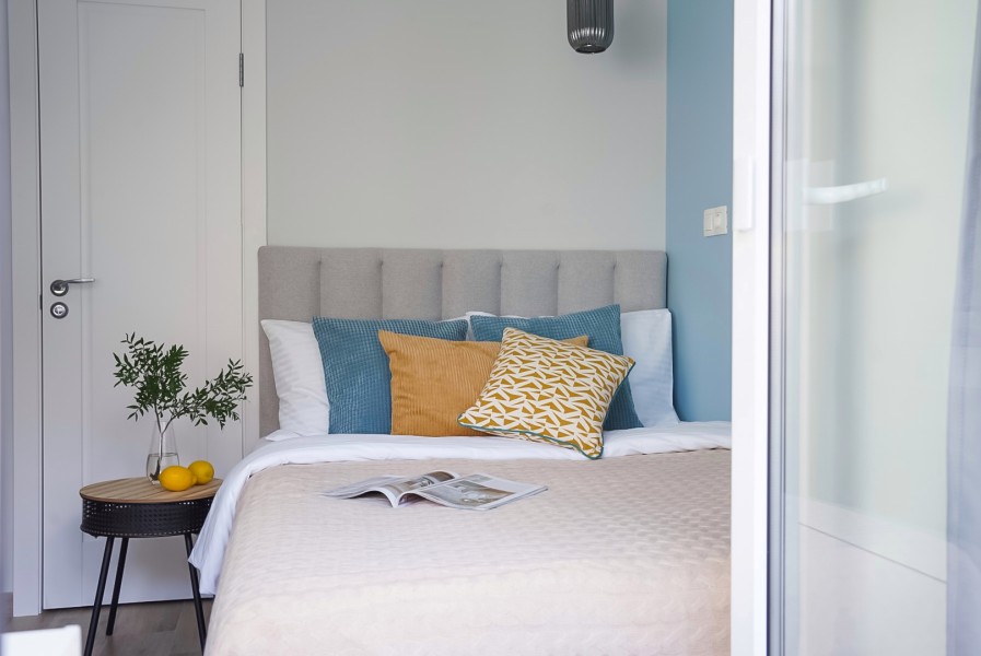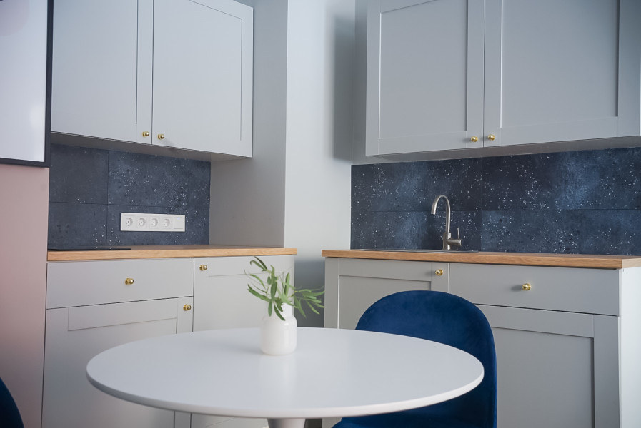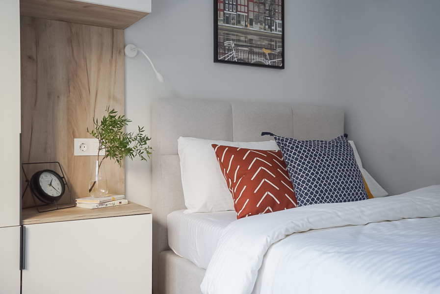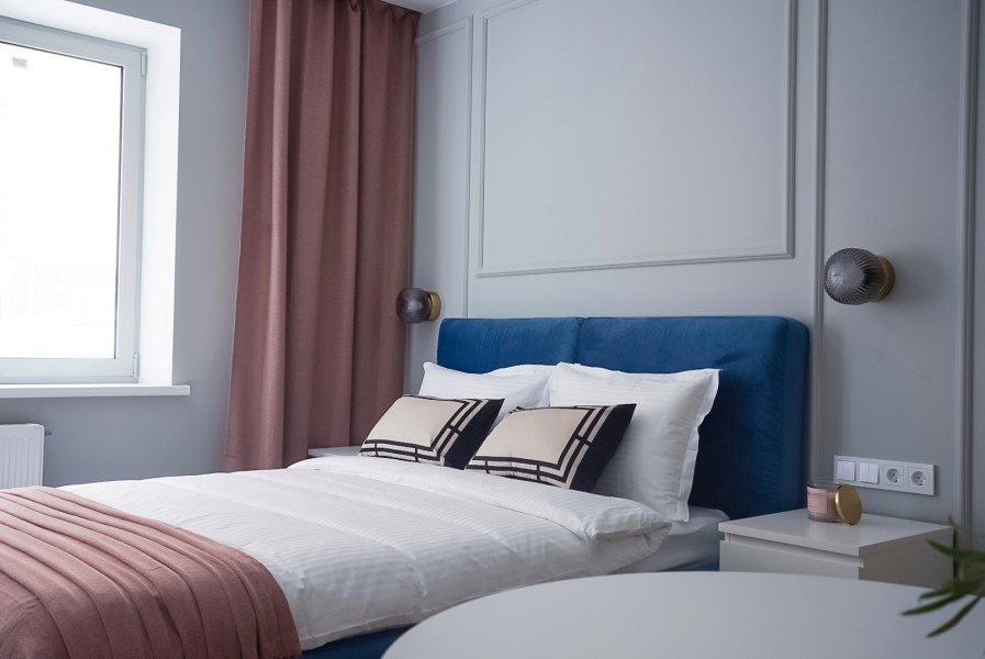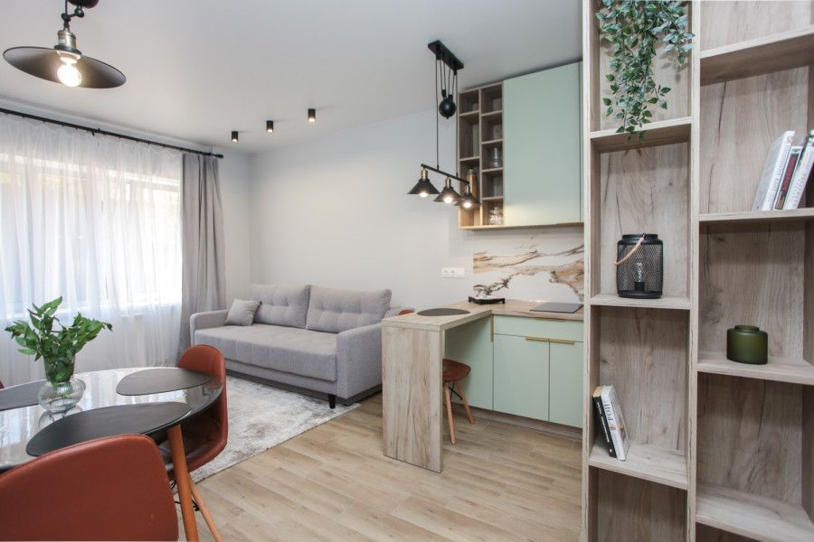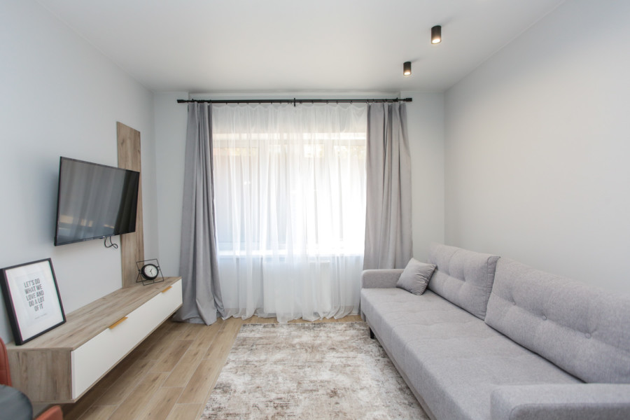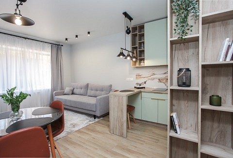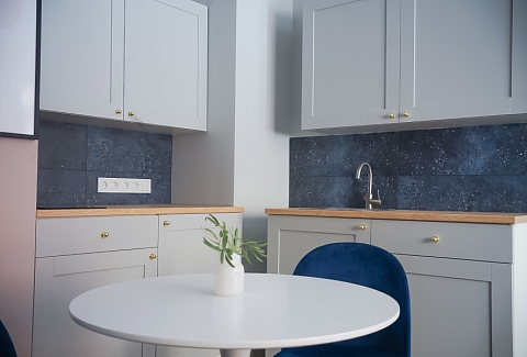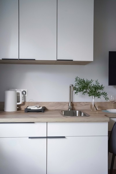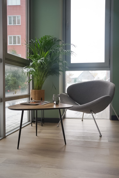 В оформлении использованы элементы минималистичного стиля, что в сочетании с удобной мебелью и современной техникой делает отдых особенно комфортным. В ванной есть полотенца и стиральная машина. Также к услугам гостей телевизор с плоским экраном, гладильные принадлежности, Wi-Fi. Мини-кухня оснащена плитой, холодильником, кофемашиной, микроволновой печью и необходимой мебелью. Личный транспорт можно оставить на парковке возле дома. Для маленьких постояльцев на свежем воздухе оборудована игровая площадка.
