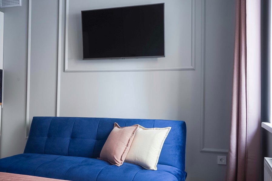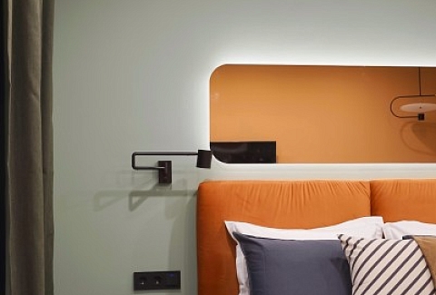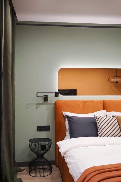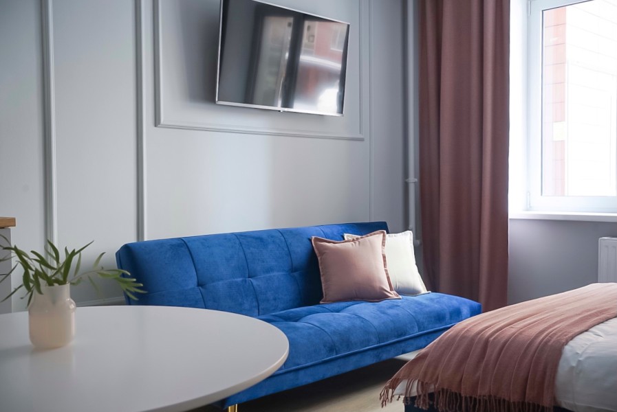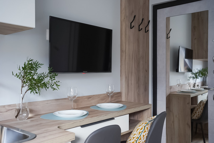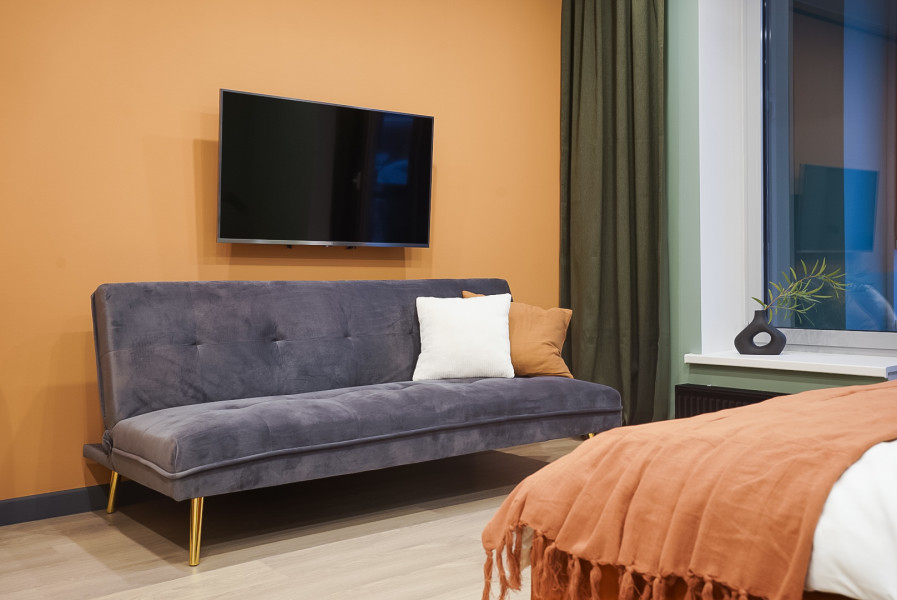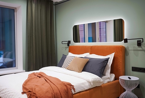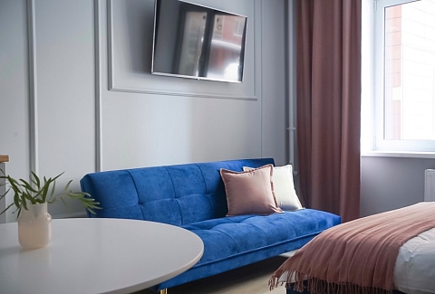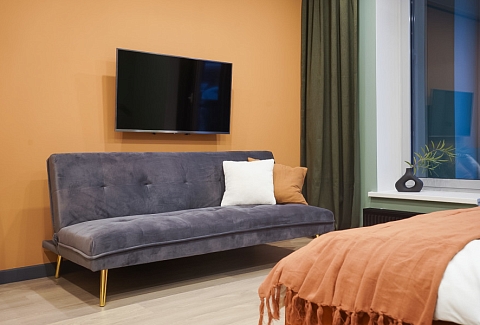 В номере: вешалка, диван, зеркало, кухонная мебель, прикроватные тумбочки, стол, стулья, шкаф, вентилятор, гладильная доска, кофемашина, микроволновая печь, набор посуды, плита электрическая, стиральная машина, телевизор ЖК, утюг, холодильник, электрочайник