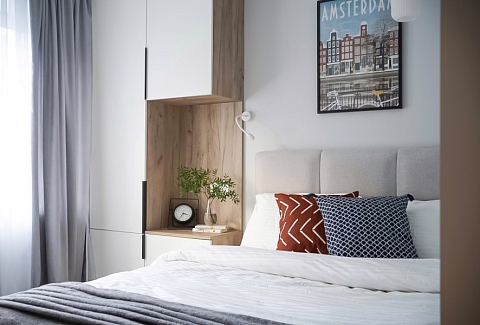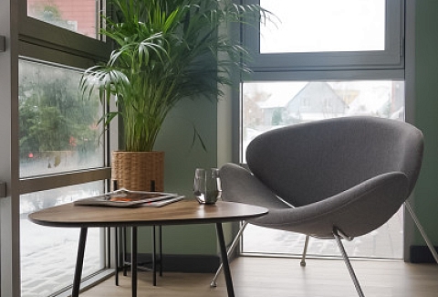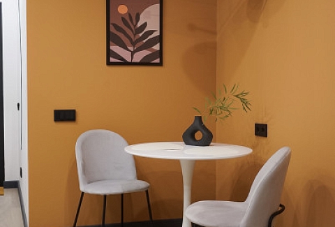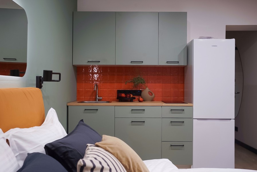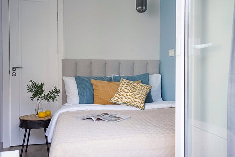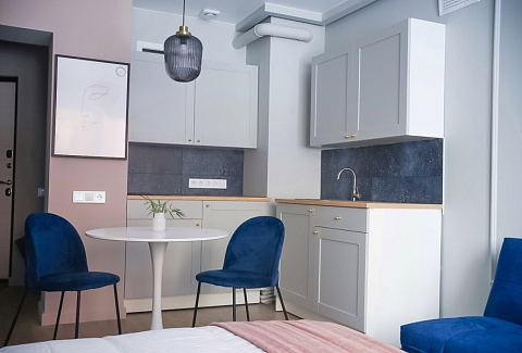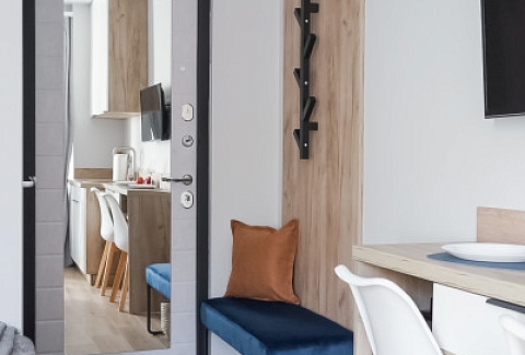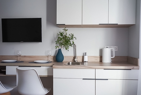 В номере: вешалка, зеркало, кресло, кровать двуспальная, кухонная мебель, прикроватный столик, стол, стулья, шкаф, вентилятор, гладильная доска, кофемашина, микроволновая печь, набор посуды, стиральная машина, телевизор ЖК, утюг, холодильник, электрочайник