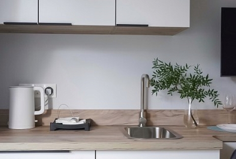 В номере: вешалка, зеркало, кровать двуспальная, кухонная мебель, прикроватная тумбочка, стол, стулья, шкаф, вентилятор, гладильная доска, кофемашина, микроволновая печь, набор посуды, стиральная машина, телевизор ЖК, утюг, холодильник, электрочайник