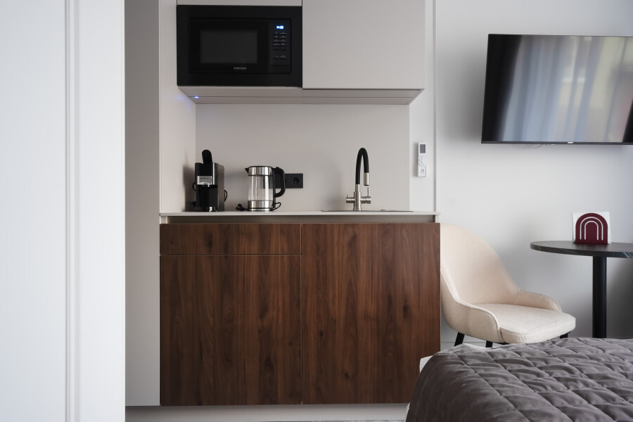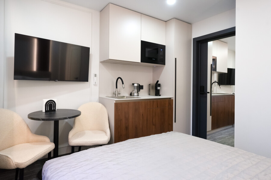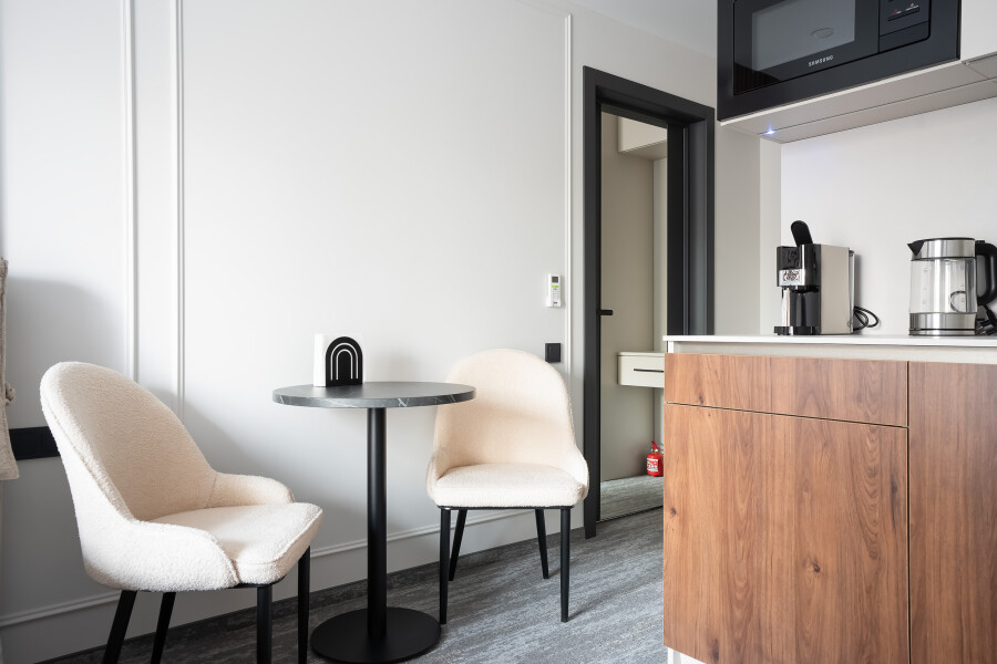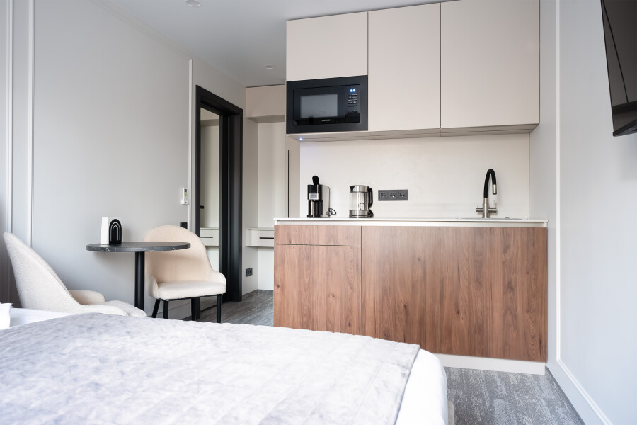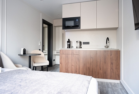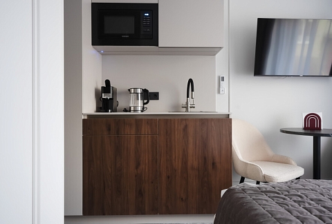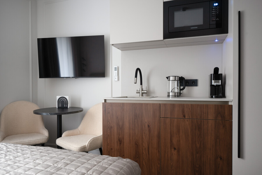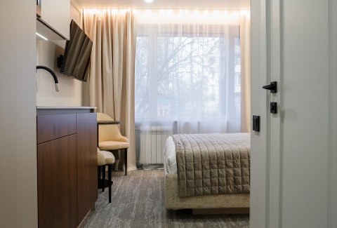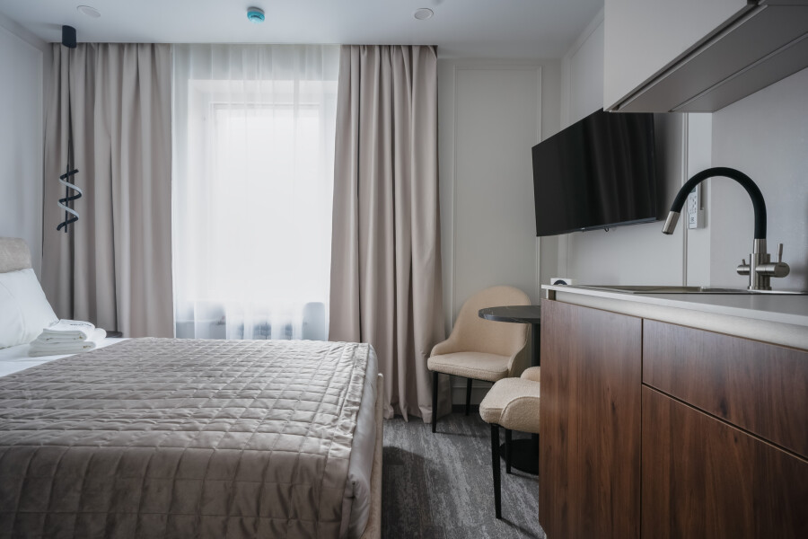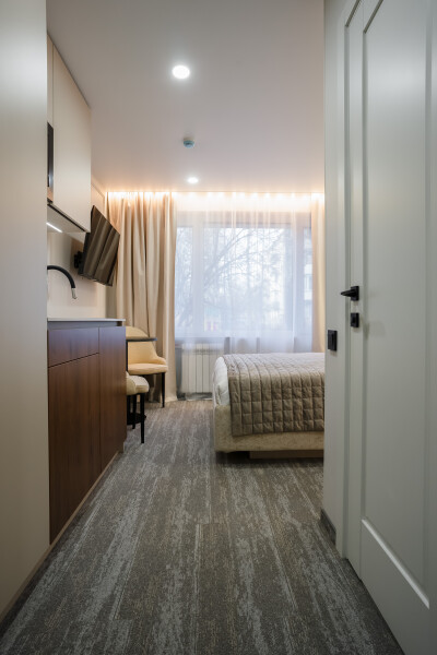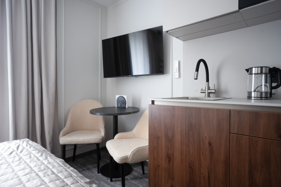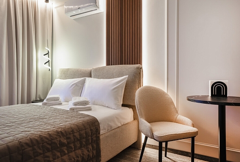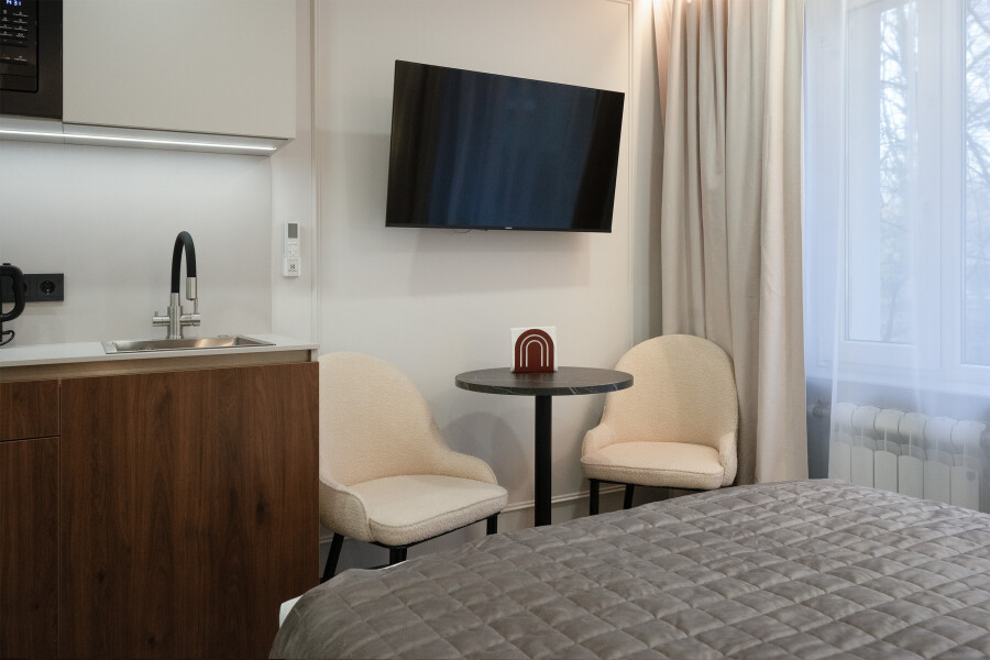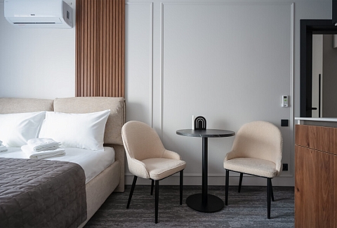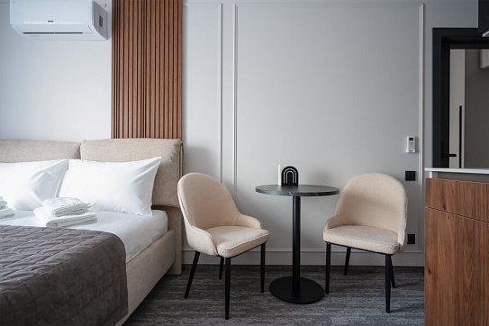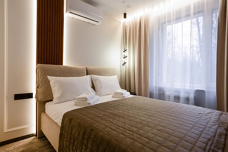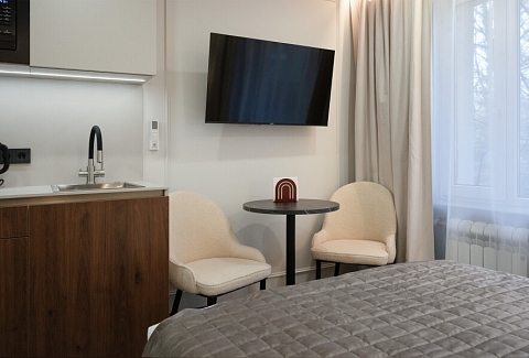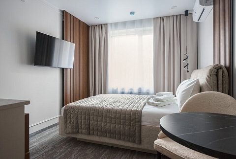 В номере: вешалка, зеркало, кровать двуспальная, стол, стулья, шкаф, гладильная доска, кондиционер, микроволновая печь, мини-холодильник, набор посуды, телевизор ЖК, утюг, чайный набор посуды, электрочайник